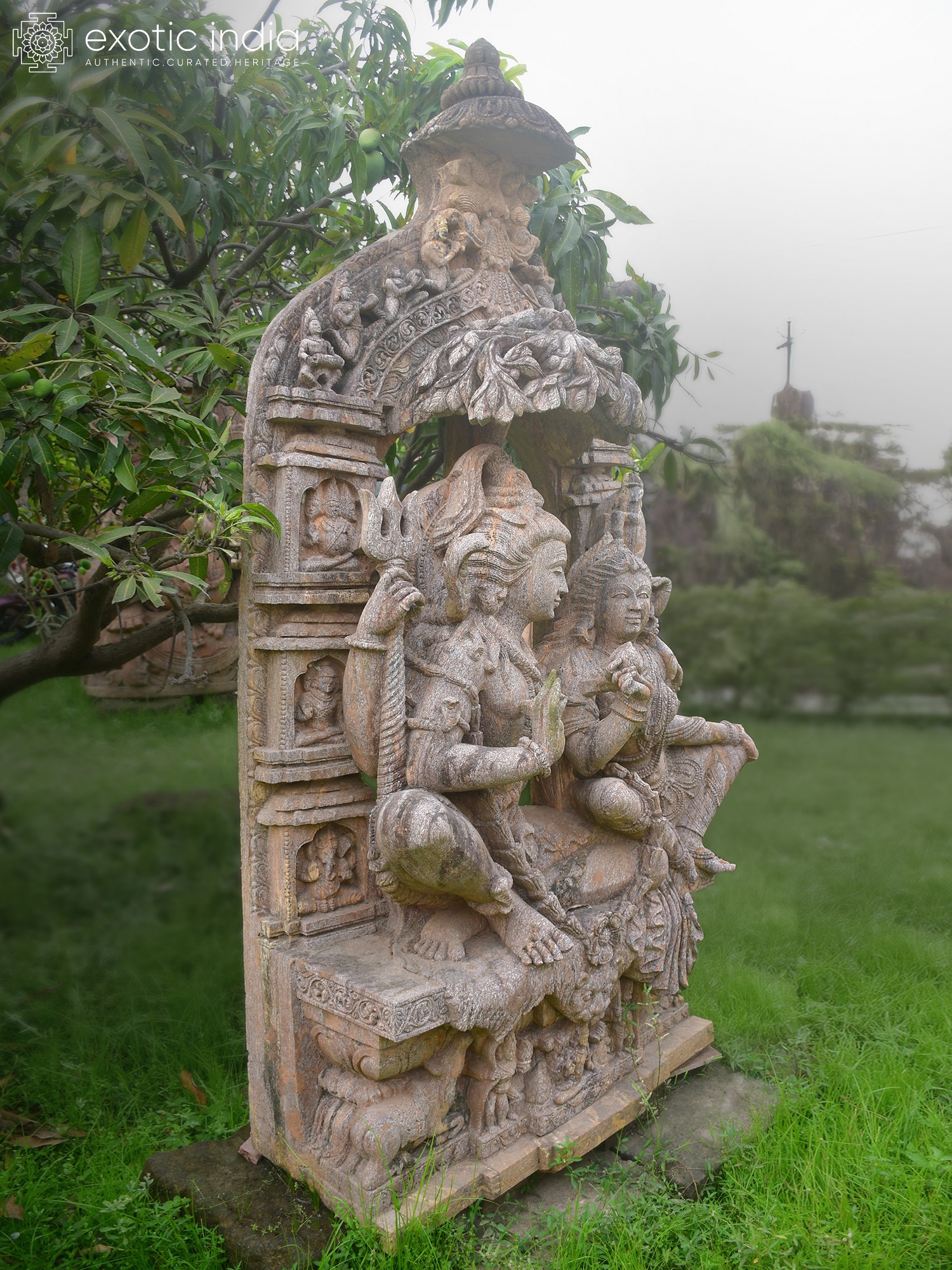 The seated figures of Shiva and Parvati are depicted in harmonious repose, their interwoven forms suggesting an unbreakable bond. Shiva, adorned with his traditional trident, radiates a calm power, while Parvati’s gentle demeanor and intricate jewelry speak of divine grace. The surrounding architectural elements, featuring symbolic carvings and delicate floral motifs, add layers of visual interest, creating a narrative within the stone itself. This substantial sculpture, standing at an impressive 86 inches, commands attention and draws the eye to its rich narrative.