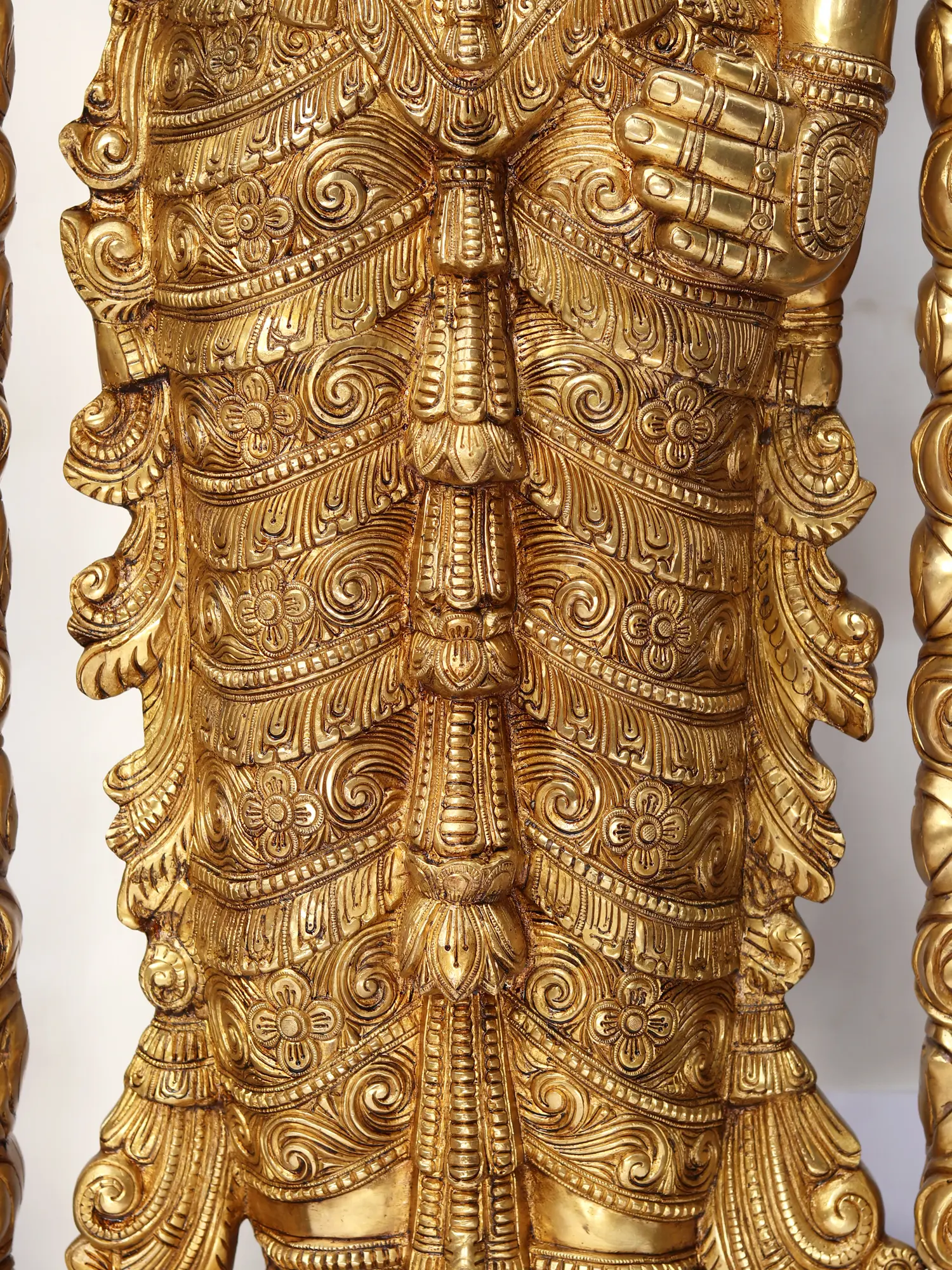 Envision the very embodiment of divine grace and prosperity gracing your space with this magnificent brass sculpture of Lord Venkateshwara, also known as Tirupati Balaji. This monumental statue is a testament to the enduring devotion and artistic skill that have revered the deity for centuries. Standing an impressive 86 inches tall, this is more than a sculpture; it is a focal point for spiritual reflection and a stunning work of art. This statue captures Lord Venkateshwara in his iconic pose, a posture that exudes both power and compassion. His raised hand bestows blessings upon devotees, while his other hand points down, offering refuge and promising protection from worldly troubles. The intricate details of his ornamentation, from the elaborate jewelry adorning his form to the finely etched patterns on his robes, reflect the opulence and grandeur associated with this beloved deity.