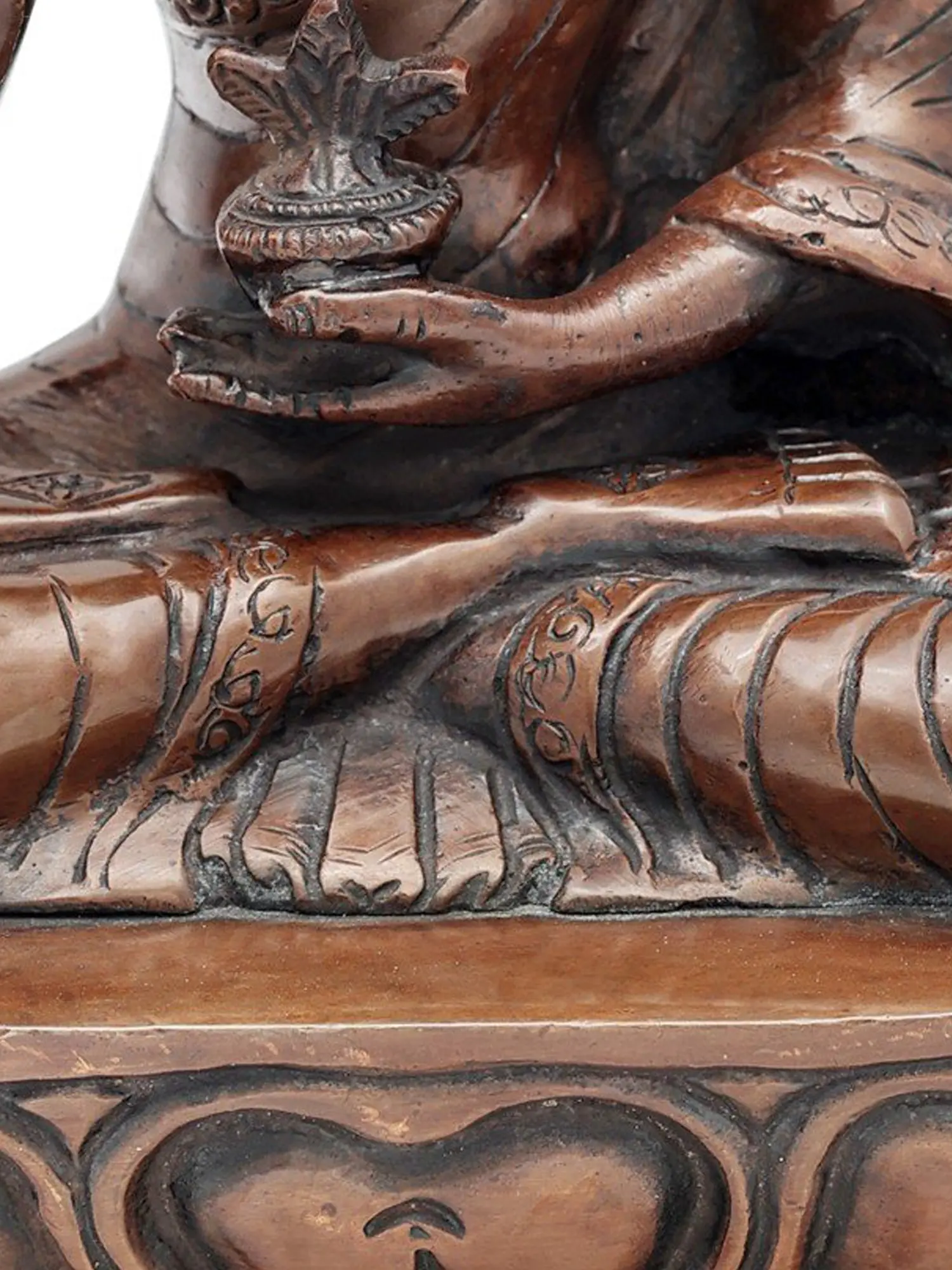 This exquisite brass statue embodies the profound presence of the Medicine Buddha, also known as Bhaisajyaguru in Sanskrit. In Tibetan Buddhism, he is revered as the Buddha of Healing and Radiance, a celestial physician who vowed to heal all sentient beings from the three poisons: greed, hatred, and ignorance, which are the root causes of all suffering. His benevolent gaze and serene posture emanate an aura of peace and compassion, inviting contemplation and offering solace to the afflicted. The statue depicts the Medicine Buddha in the traditional lotus posture, a symbol of purity and spiritual awakening. His right hand is extended, palm facing outwards in the gesture of *abhaya mudra*, signifying fearlessness and protection. This gesture assures devotees that their anxieties and pains will be dispelled. In his left hand, cradled in his lap, he holds an alms bowl filled with *amrita*, the nectar of immortality, representing the healing elixir that banishes disease and prolongs life. The intricate detailing on his monastic robe, adorned with delicate patterns, speaks to the artistry and devotion of the craftsman.