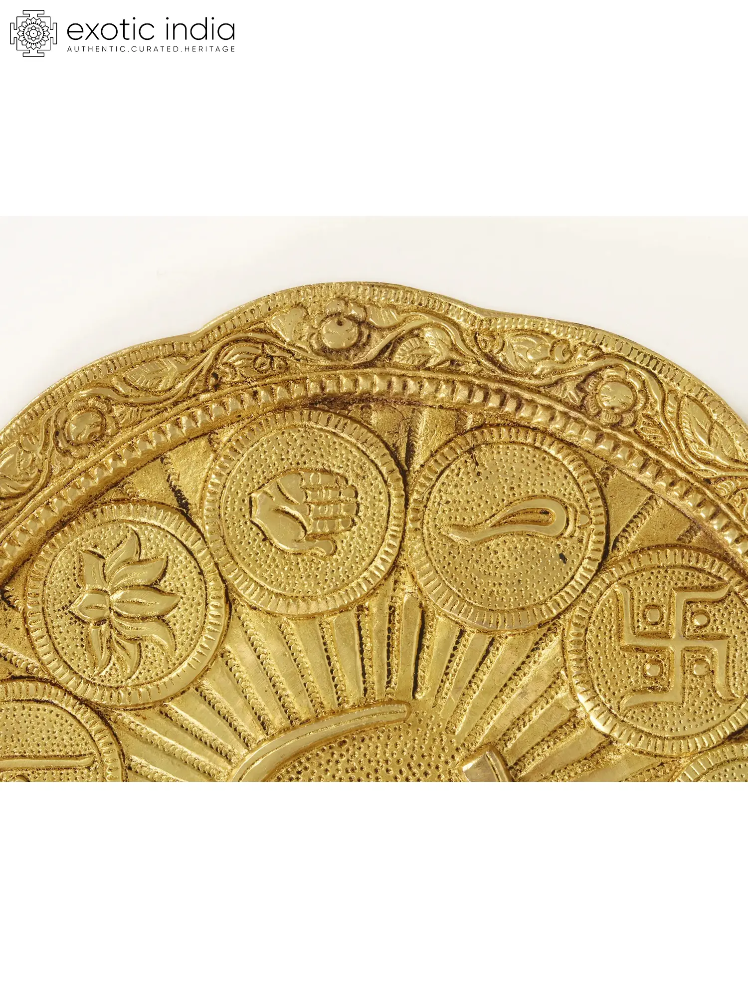 This wall hanging plate with auspicious symbols of Hinduism and Om is made in Brass and is a magnificent piece of spiritual artistry. This ornate plate showcases a harmonious fusion of sacred symbols, including the Swastika symbolizing auspiciousness, Shri representing Lakshmi's blessings, Surya the sun deity, the Axe symbolizing Lord Parashurama, the Conch representing creation, the Trishul denoting Lord Shiva's power, Vishnu Paduka signifying Lord Vishnu's divine presence, Tri Pundra representing devotion, the Lotus symbolizing purity, Varada Mudra conveying blessings, and the Noose representing control over desires. The central Om adds an extra layer of spiritual significance, making this wall hanging a captivating and spiritually charged piece for your home.