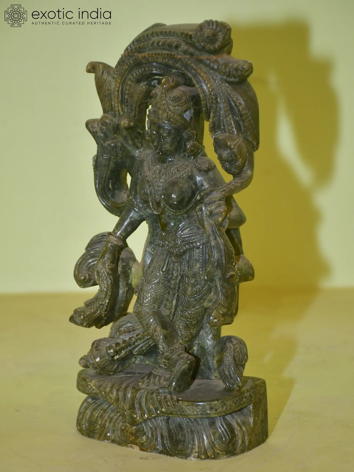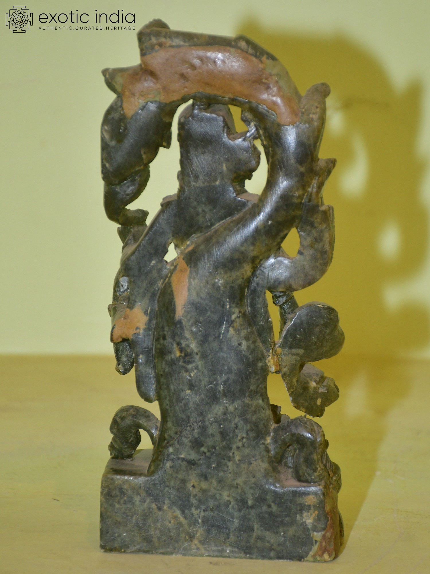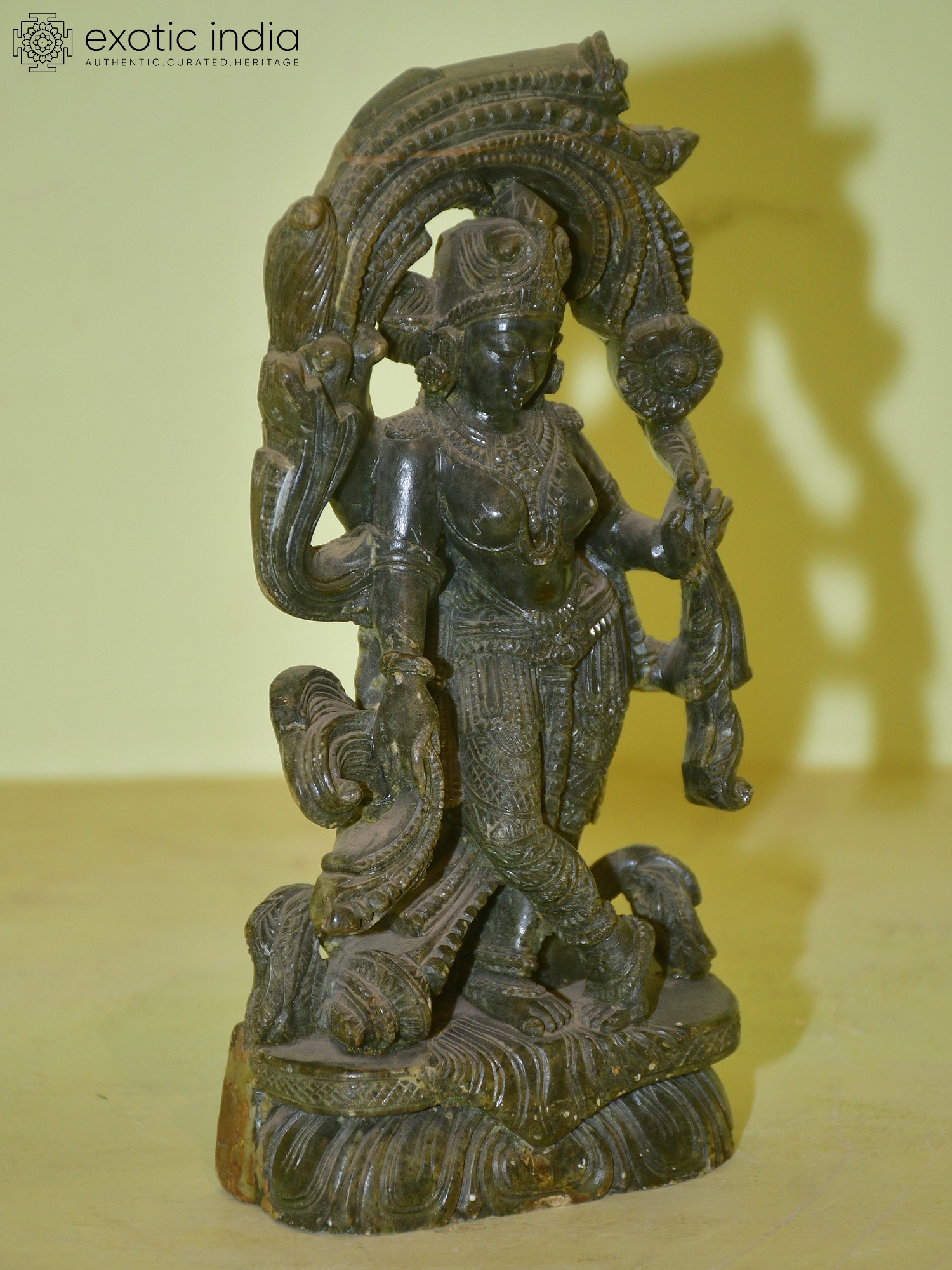 This exquisite statue captures the ethereal beauty and divine grace of an Apsara, a celestial nymph from Hindu mythology. Crafted from rich, dark Orissa stone, each curve and detail is meticulously hand-carved, imbuing the sculpture with a sense of timeless elegance and spiritual depth. The Apsaras are known in Indian lore as celestial dancers and musicians, dwelling in Indra's svarga (heaven), enchanting gods and mortals alike with their mesmerizing performances. They are often depicted as embodying perfect beauty, grace, and allure, possessing the power to stir emotions and inspire awe.