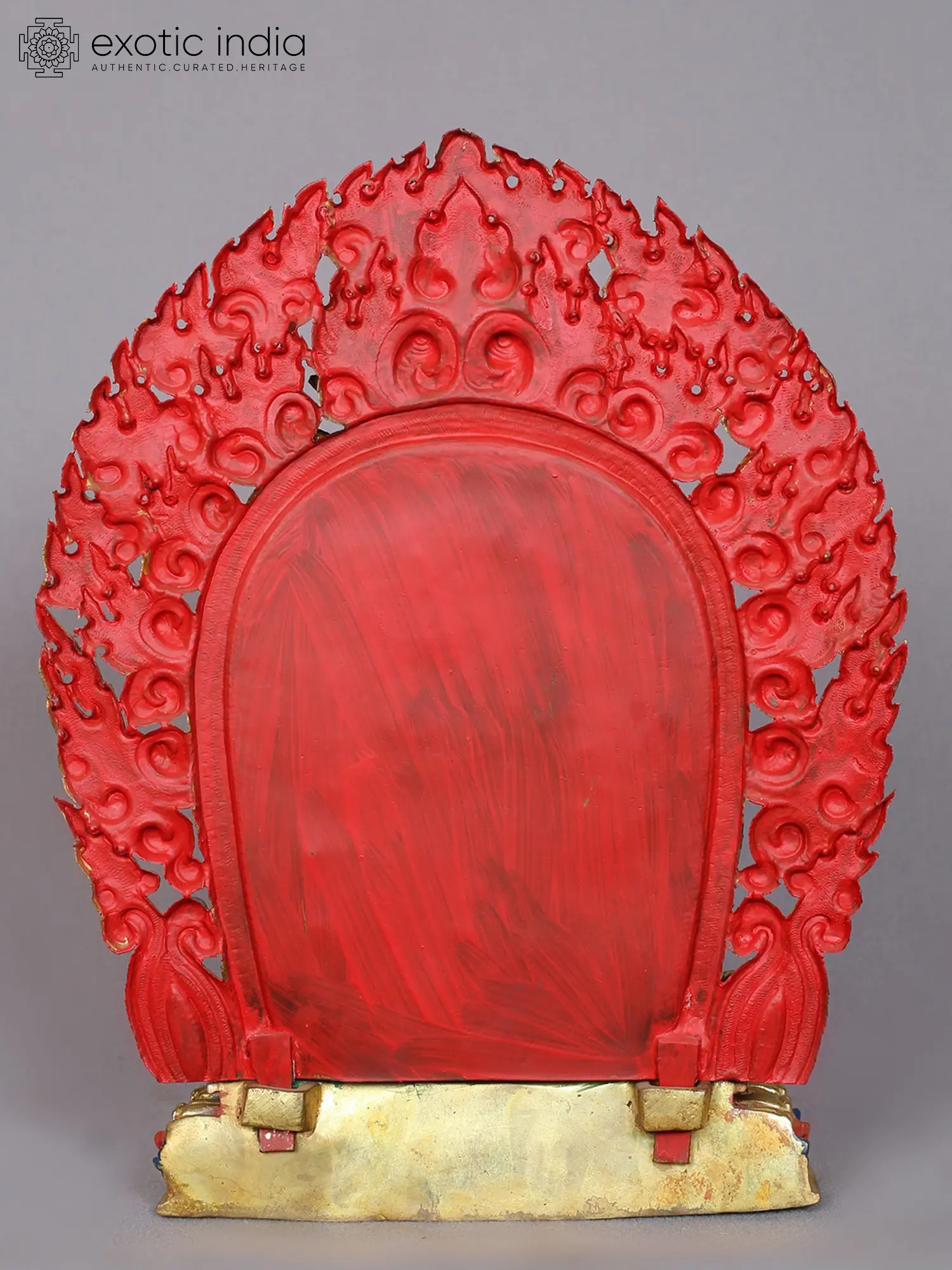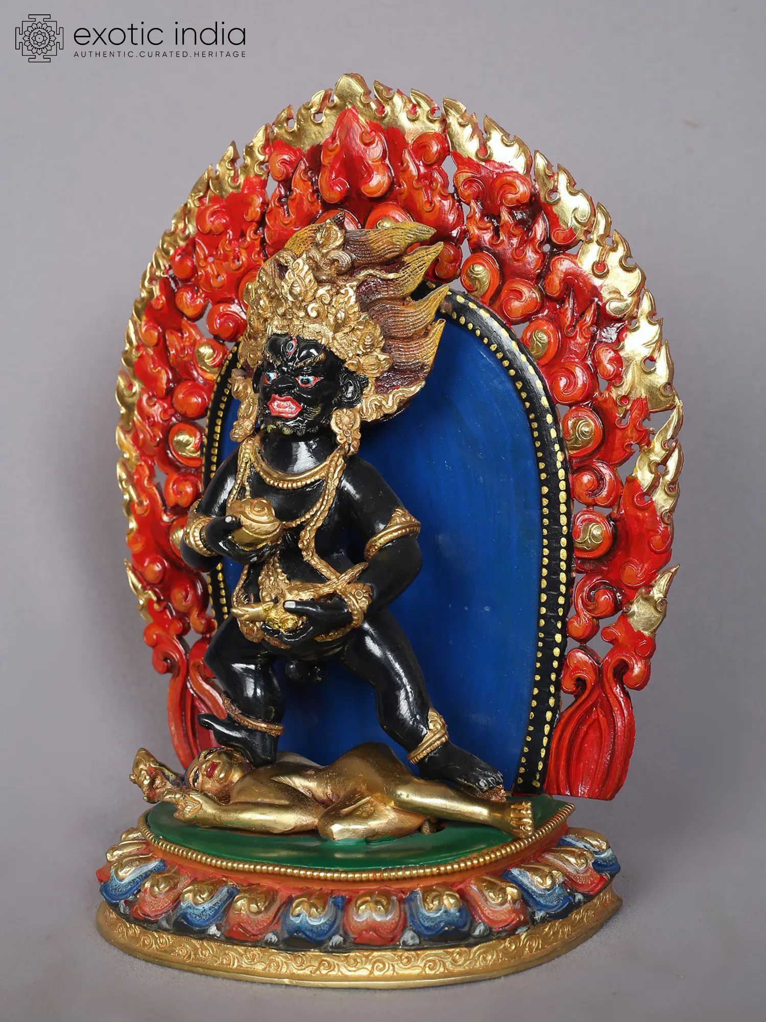 Kubera's attire includes protective armor and a resplendent golden necklace that drapes down to his ample abdomen. His countenance tilts slightly to the left and bears a beard and mustache, with two small tusks protruding from the corners of his mouth. These attributes signify his authority to dispense both rewards and punishments.