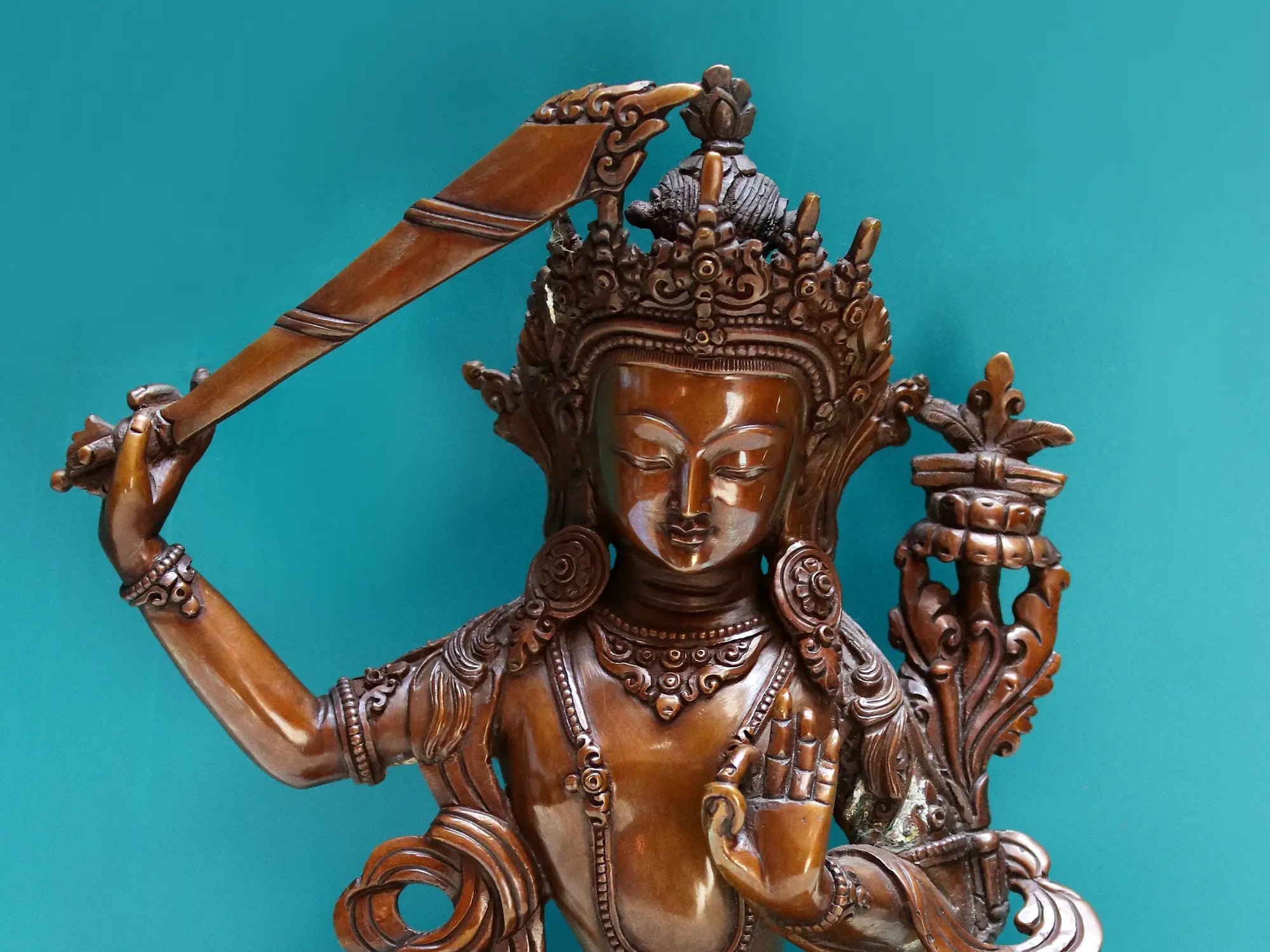 His right-hand carries a powerful sword, which Manjushri raises in the air as if prepared to swiftly sever the ties of human existence for those who call upon him. In his left hand is a blue lotus with a book, and his hand makes the gesture of Vitarka or imparting wisdom. Gently smiling and spreading auspiciousness in his aura, Manjushri in this statue appears prepared to answer the prayers of his followers.