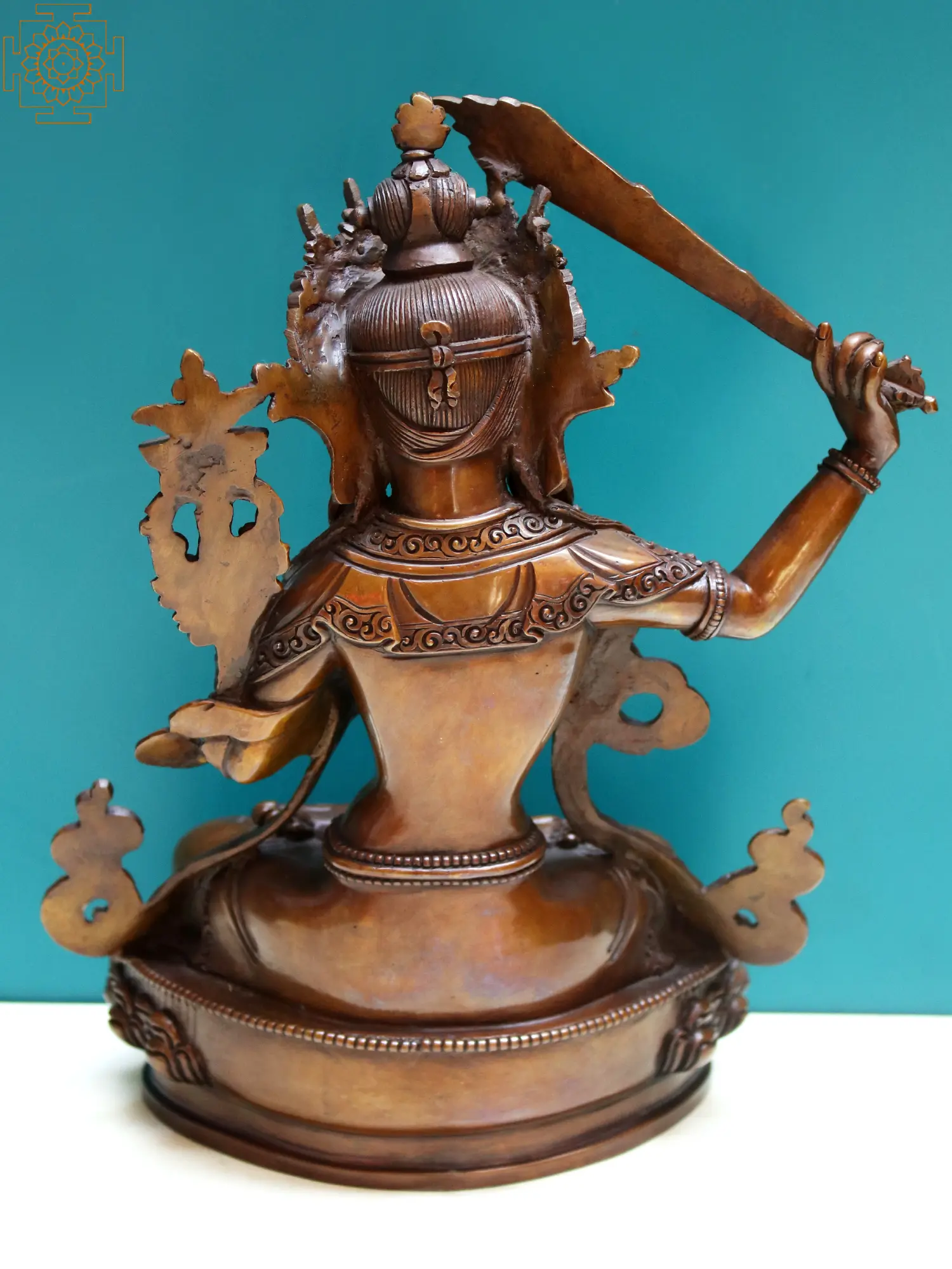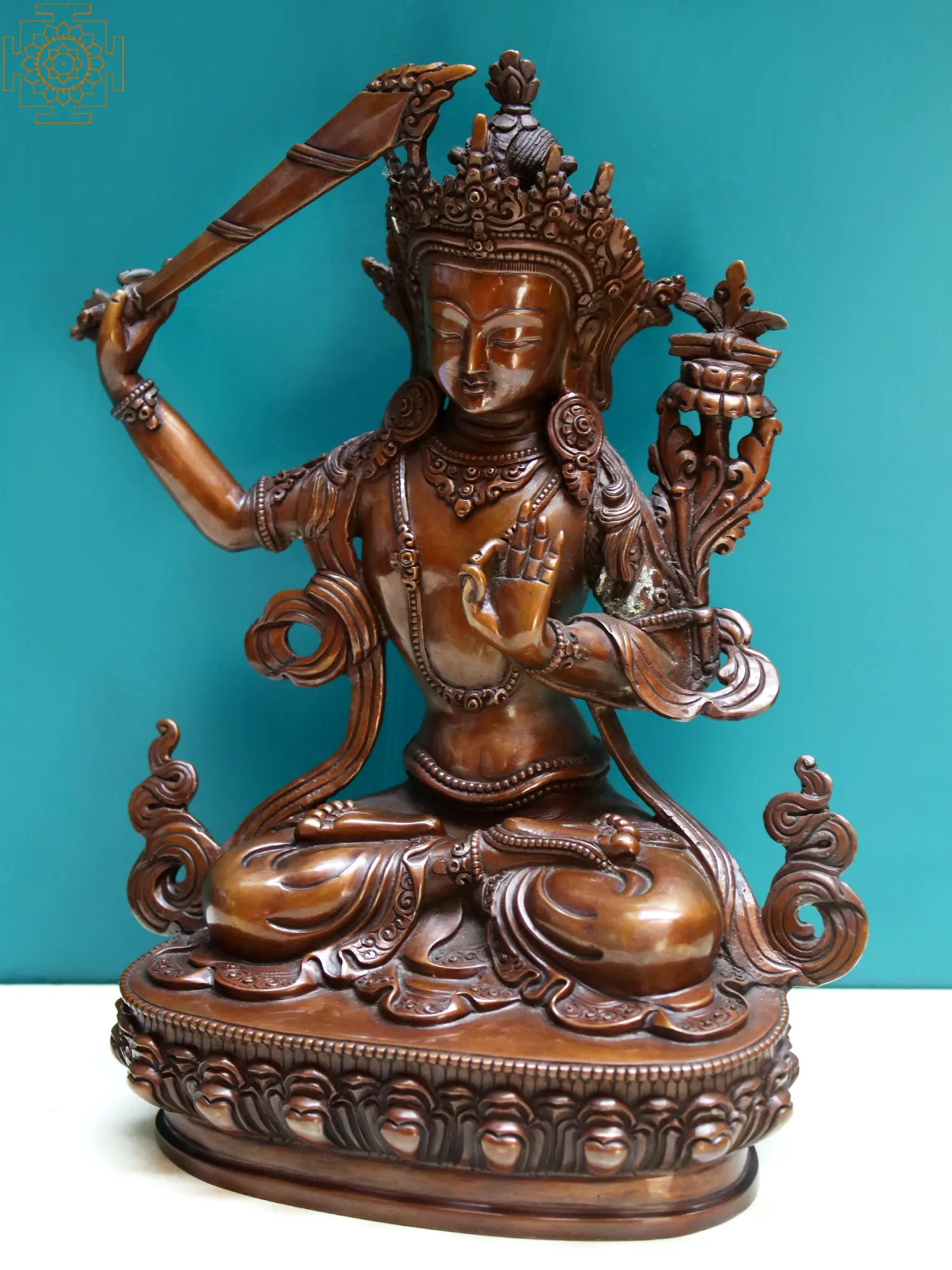 The manifestation of transcendental wisdom, Bodhisattva Manjushri is a revered Vajrayana deity, who cuts through the veils of worldliness and lets the enlightened light enter the mind of the devotee. The copper statue from Nepal presents the dynamic and divine presence of Manjushri in stunning iconography. He sits on a beautifully sculpted lotus throne that symbolizes the bloom of wisdom within. Manjushri is adorned by traditional ornaments and an exquisite crown, along with silken garments that are charmingly delineated in the metal sculpture.