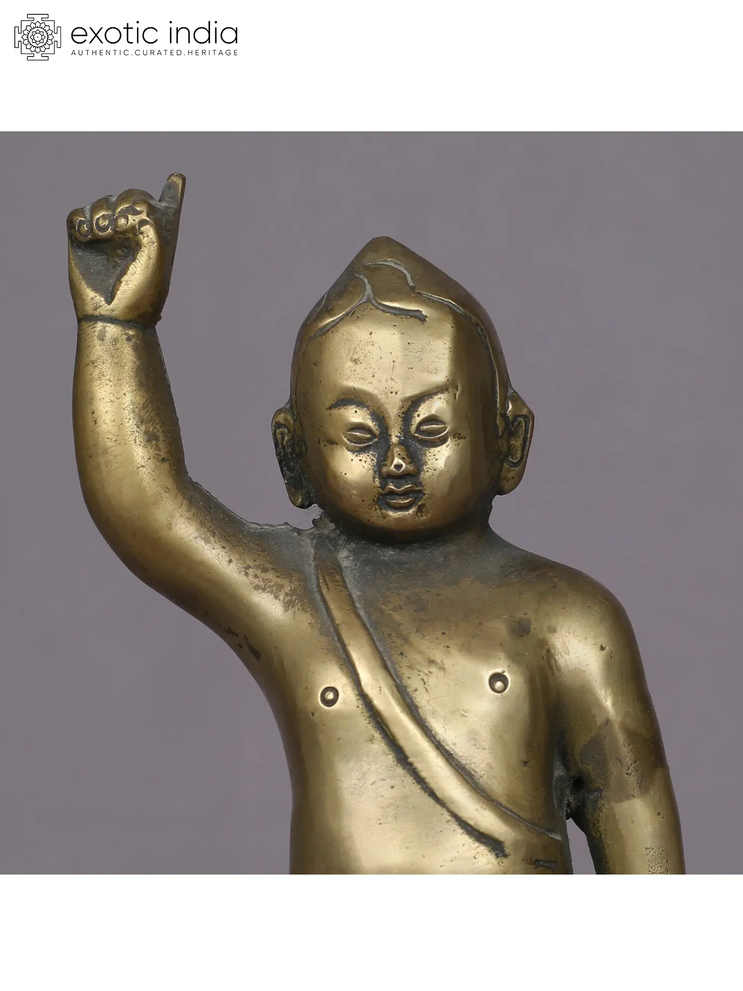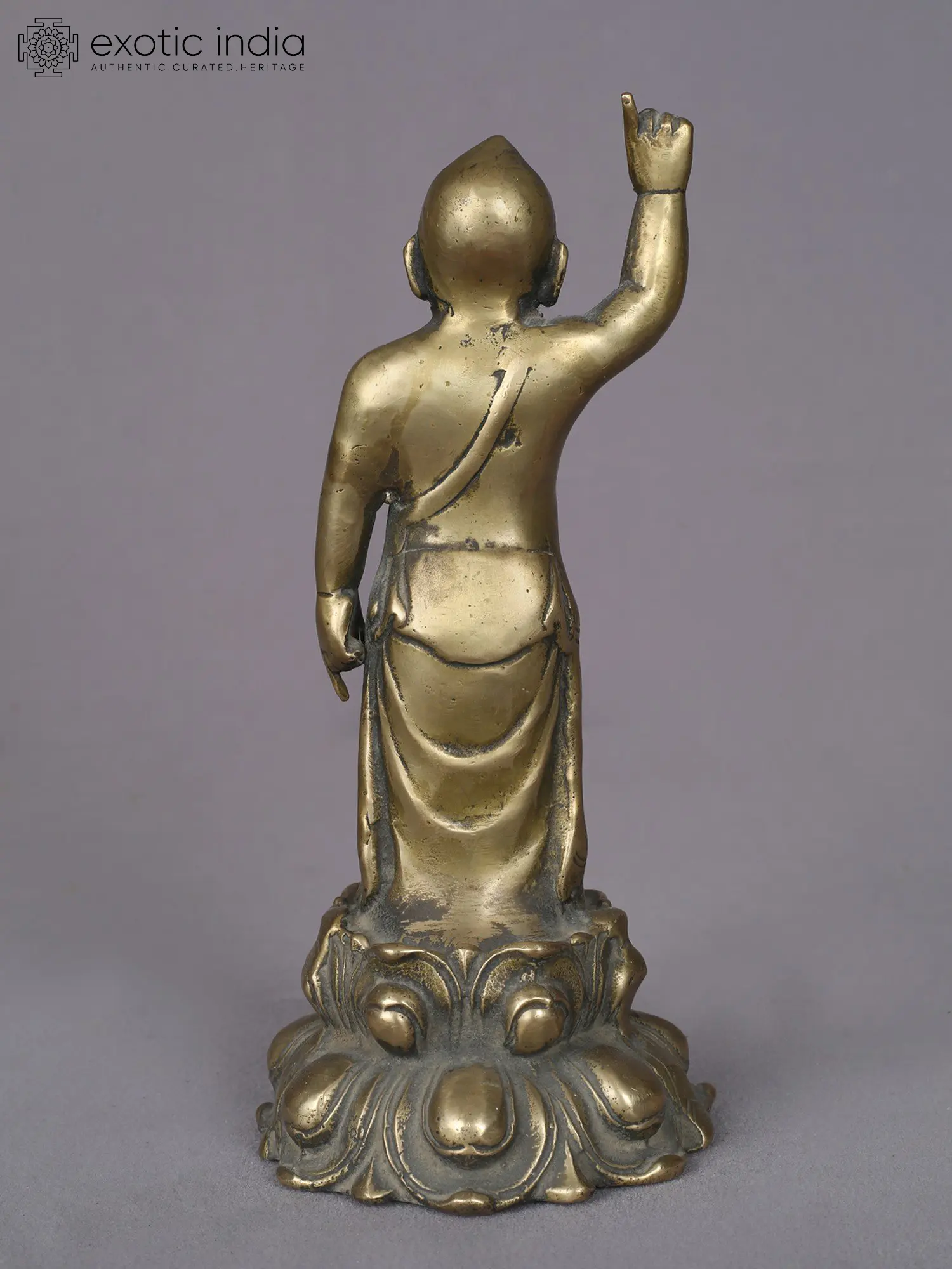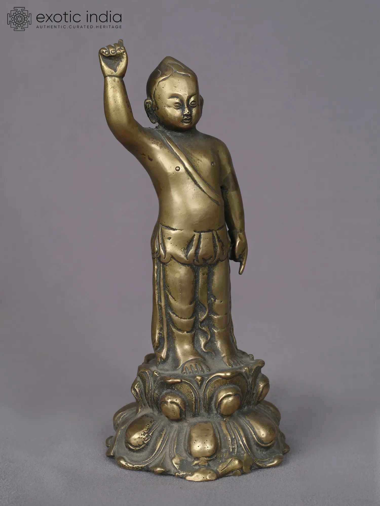 This brass baby Buddha is a simple artwork, depicting the baby Siddhartha in a plain dhoti, with a visible cranial bump (symbol of innate wisdom) standing on a bloomed lotus which represents purity of wisdom. Notice the absence of elongated earlobes (a characteristic found in other Buddha statues), since the drooping earlobes suggest a later stage of his life when Siddhartha gave up his heavy and jeweled earrings, which caused the lobes to extend in the first place.