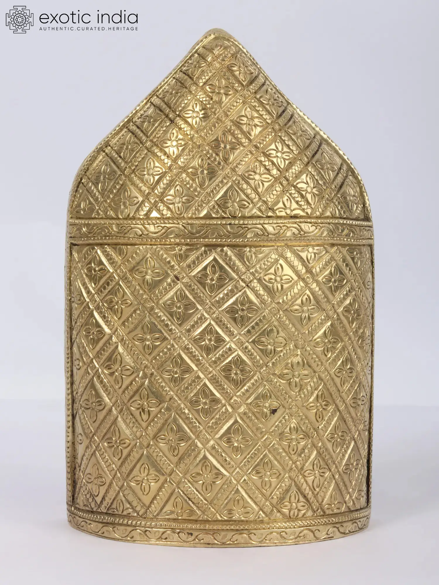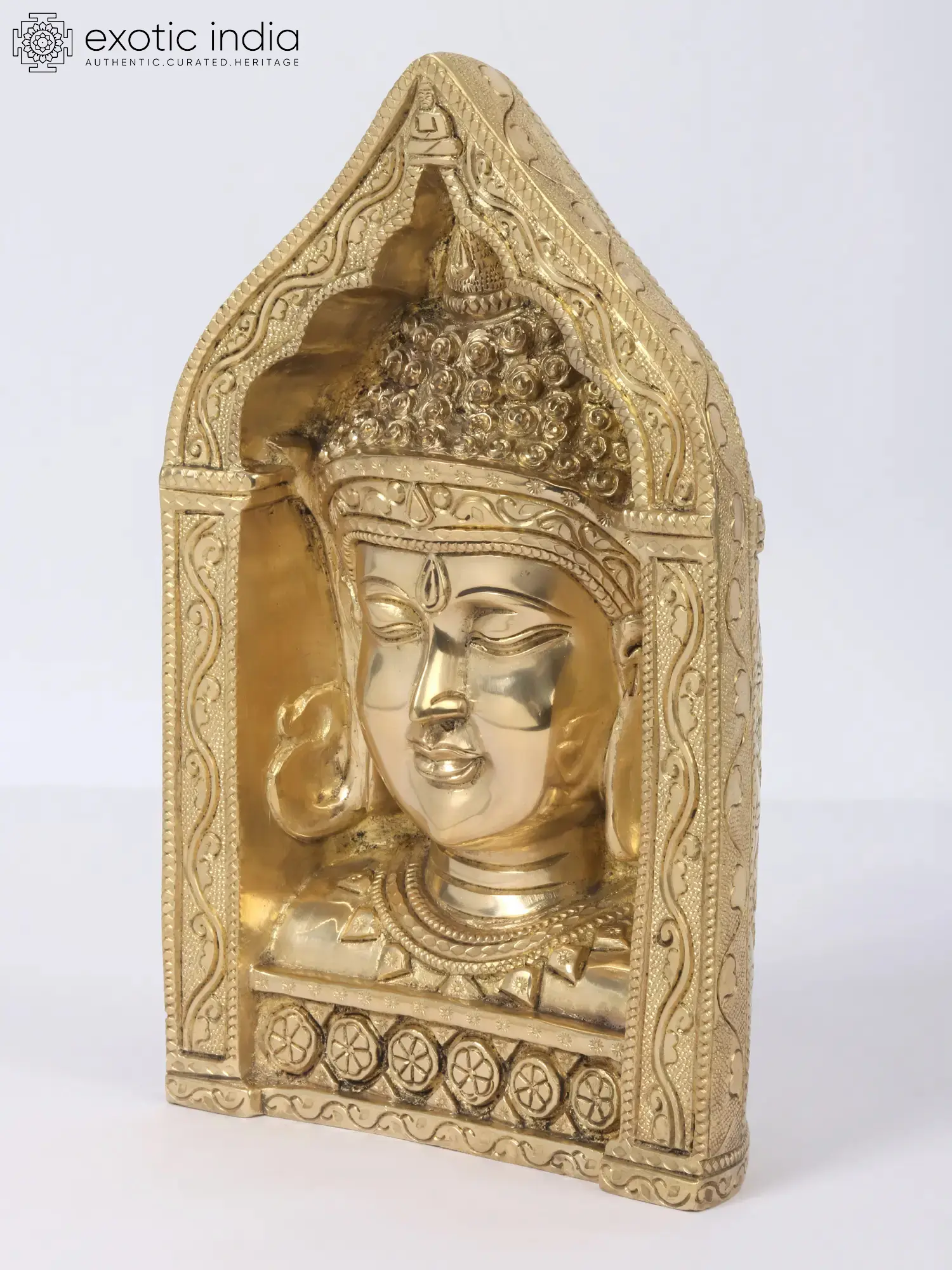 This exquisite brass creation captures the serene and compassionate countenance of the Buddha, a symbol of peace, wisdom, and enlightenment revered across the globe. Crafted with meticulous attention to detail, the face is presented within an intricately designed frame, reminiscent of the architectural styles found in ancient Buddhist temples. The warm, golden hue of the brass lends a sense of timelessness and divinity to the piece, making it a focal point of any sacred space or meditation corner. The Buddha's features are rendered with remarkable clarity. His eyes are gently closed, suggesting deep introspection and inner peace. The subtle smile playing on his lips conveys a profound sense of tranquility and acceptance, inviting a similar sense of calm into the viewer's surroundings. The traditional ushnisha, the cranial protuberance symbolizing supreme knowledge, is depicted with a textured pattern, hinting at the boundless wisdom of the Awakened One. Adorning his brow is a urna, the dot believed to represent a third eye, capable of seeing beyond the mundane.