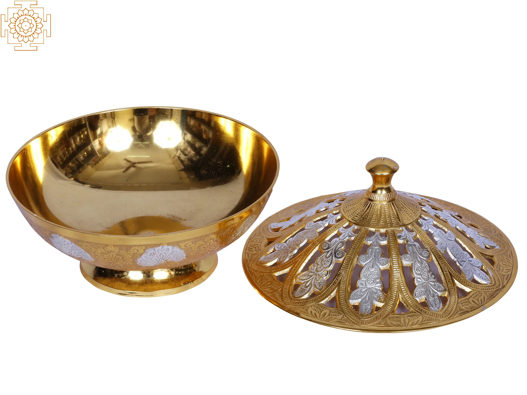The rituals in India are very elaborate and there are objects specifically used for each step involved in the ritual. Some utensils are used for serving food to the deities or just keeping the vermillion etc. This Brass Designer Bowl with Lid is a stunning piece of artistry and functionality that can be used for both the above-mentioned purposes. Crafted with precision, it showcases intricate floral designs in elegant silver color against a backdrop of lustrous brass. The lid features exquisite cutwork, creating a captivating floral pattern that seamlessly blends silver and golden hues, offering a touch of opulence. Whether used for serving or as a statement decor item, this masterpiece exemplifies the harmonious fusion of aesthetics and utility, making it a cherished addition to any home.