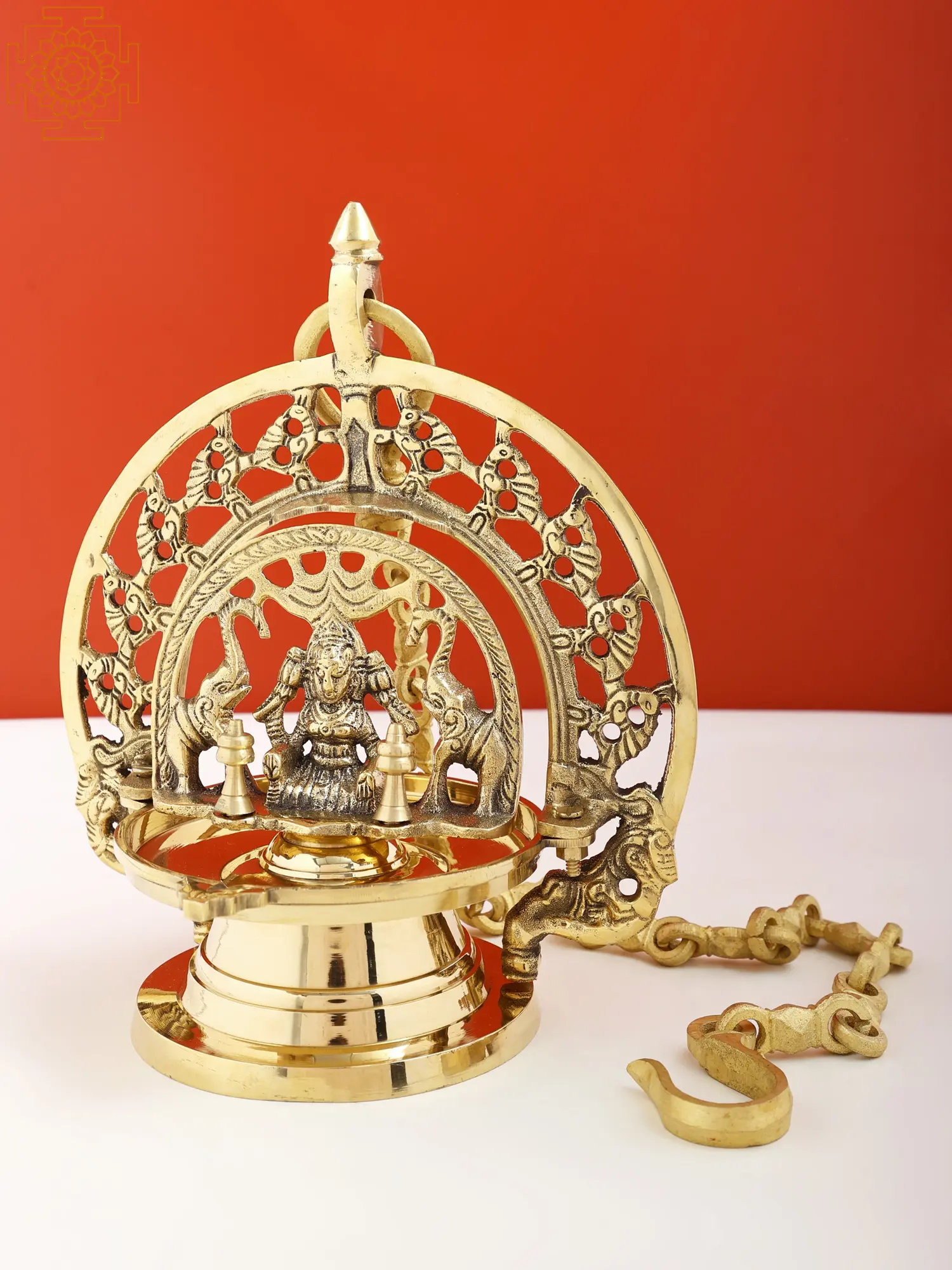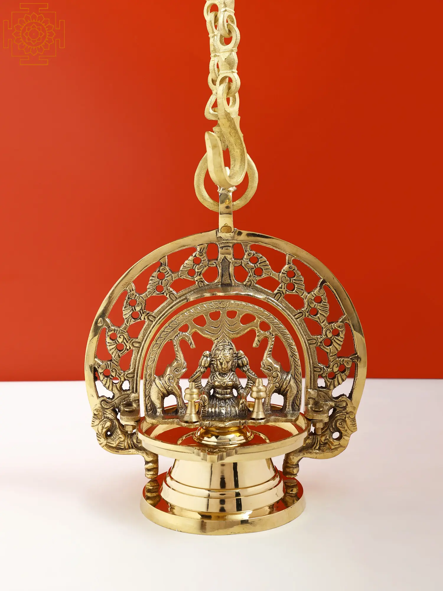 This brass lamp is known as Thooku Vilakku, which is a hanging lamp. These are commonly found hanging on Kerala houses' verandas and are also a significant feature of ritual décor. The brass lights are suspended from the ceiling with a hook and usually have five wicks. The number of wicks can be increased in the form of layers depending on the situation. One of the most auspicious lights used in rituals is the Gajalaxmi hanging lamp. The image of Goddess Gajalaxmi, the bestower of wealth and prosperity, is located in the center of the oil basin and is surrounded by a peacock halo ring. With all of these distinct elements, this lamp is magnificent and ideal for illuminating a ceremonial setting.