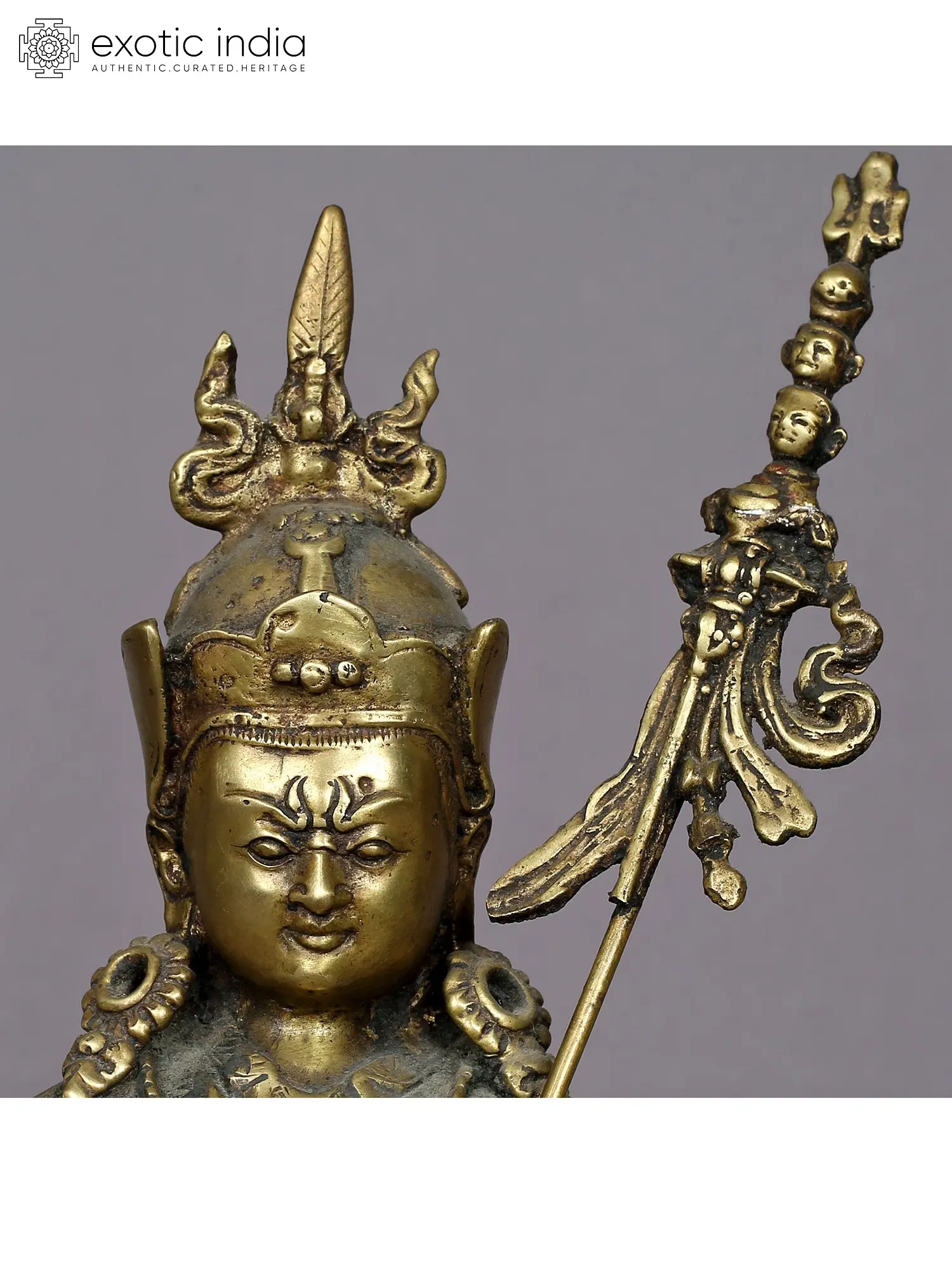He is seen holding the khatvanga, a staff adorned with three severed heads representing the three kayas (the three bodies of a Buddha: dharmakaya, sambhogakaya, and nirmanakaya). He wears a simple sash robe. His eyes are wide open, reflecting a penetrating gaze. In his right hand, he holds a five-pronged vajra at his heart, while his left hand, in a gesture of equanimity, cradles a skull cup containing the nectar of deathless wisdom within a vase of longevity. Padmasambhava sits in the royal posture, with his feet crossed.