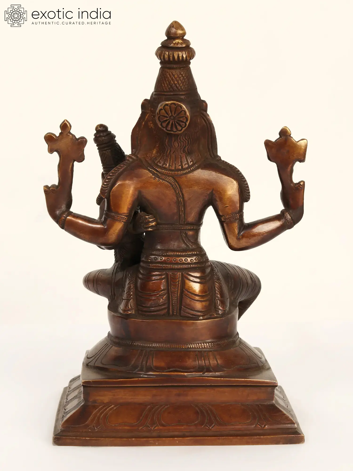 This exquisite brass sculpture captures a moment of profound divine union, presenting Lord Narasimha, the fierce avatar of Lord Vishnu with a human body and a lion's head, seated majestically with Goddess Lakshmi, the embodiment of wealth and prosperity, cradled in his lap. Crafted with meticulous attention to detail, this piece radiates an aura of power, protection, and abundance. The rich, deep patina of the brass lends an ancient and sacred feel, making it a truly captivating centerpiece for any altar, meditation space, or home.