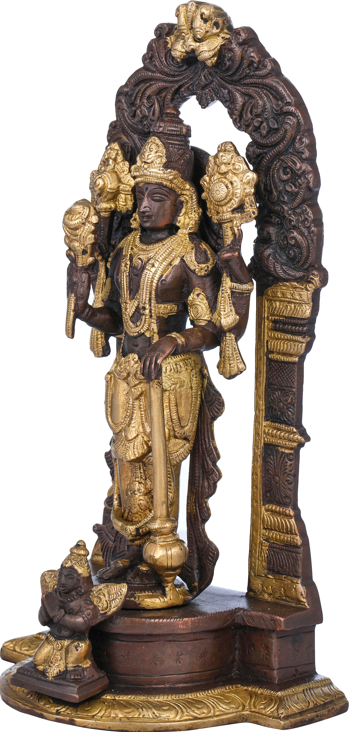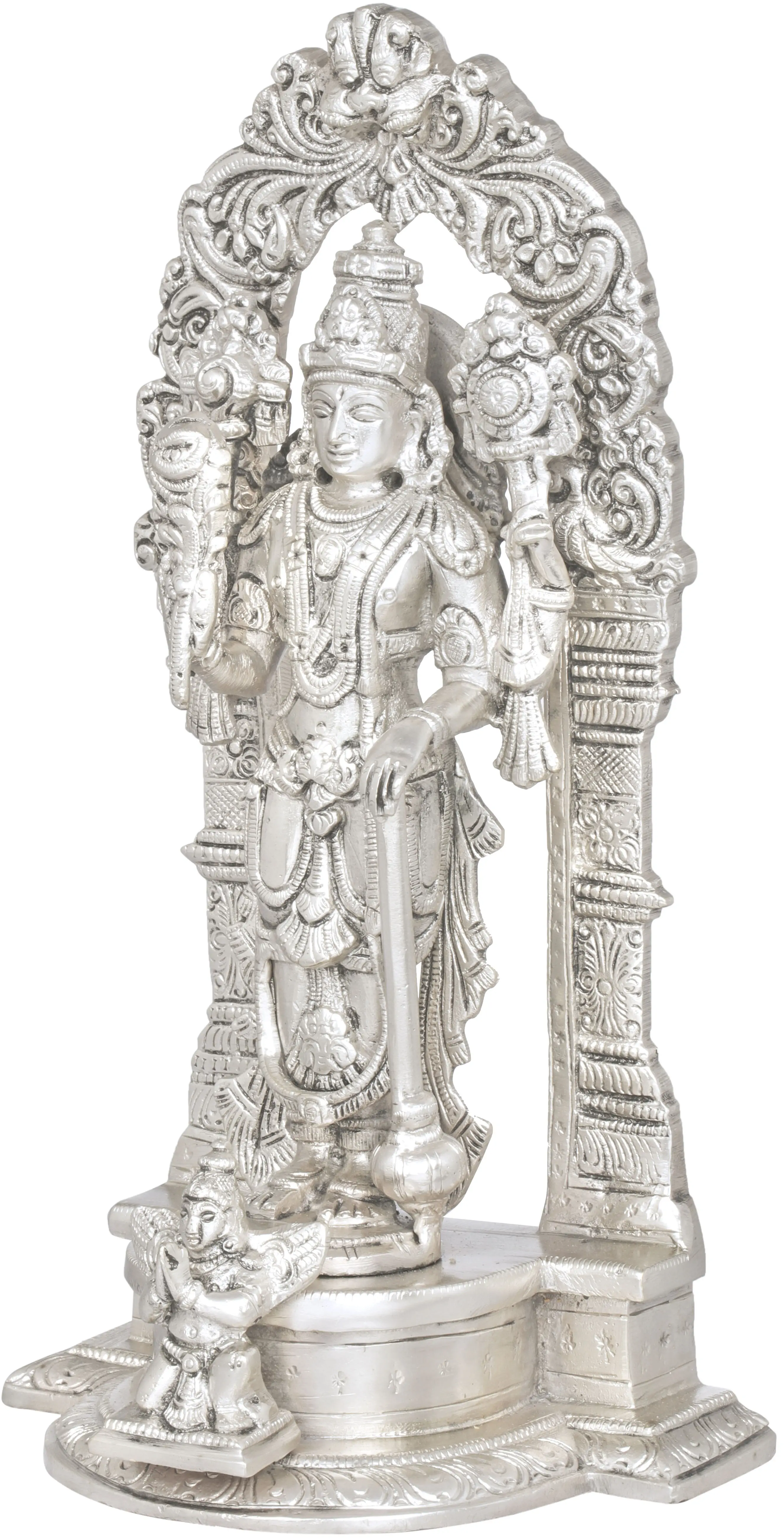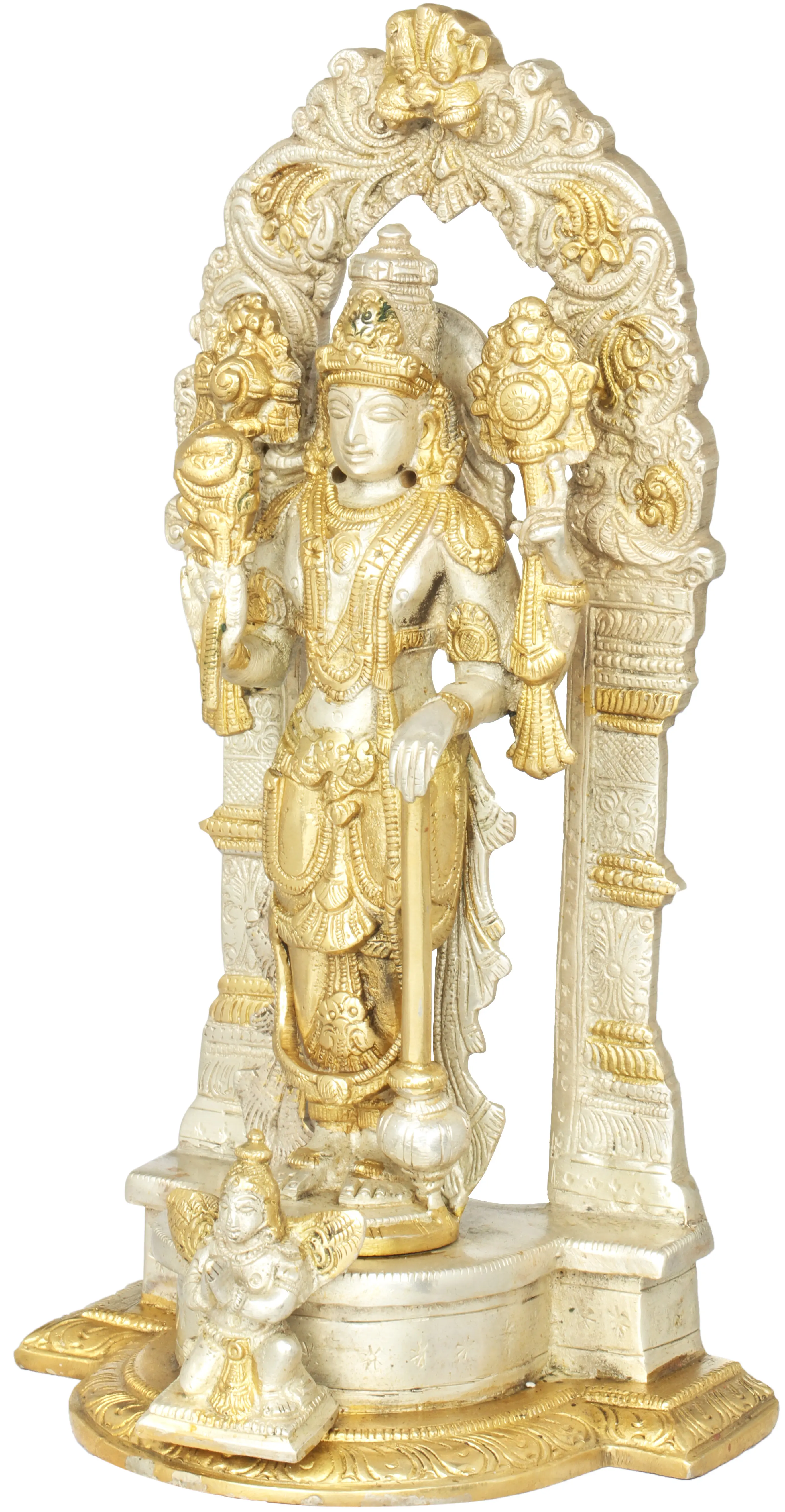 Experience the divine energy of Lord Vishnu with this magnificent brass statue. Lord Vishnu, the preserver and protector, is a prominent figure in Sri Vaishnava tradition. This statue portrays Lord Vishnu standing on a Garuda pedestal, symbolising his eternal vigilance. Display it in your home to invite blessings of protection and preservation, in alignment with the sacred principles of Hinduism.