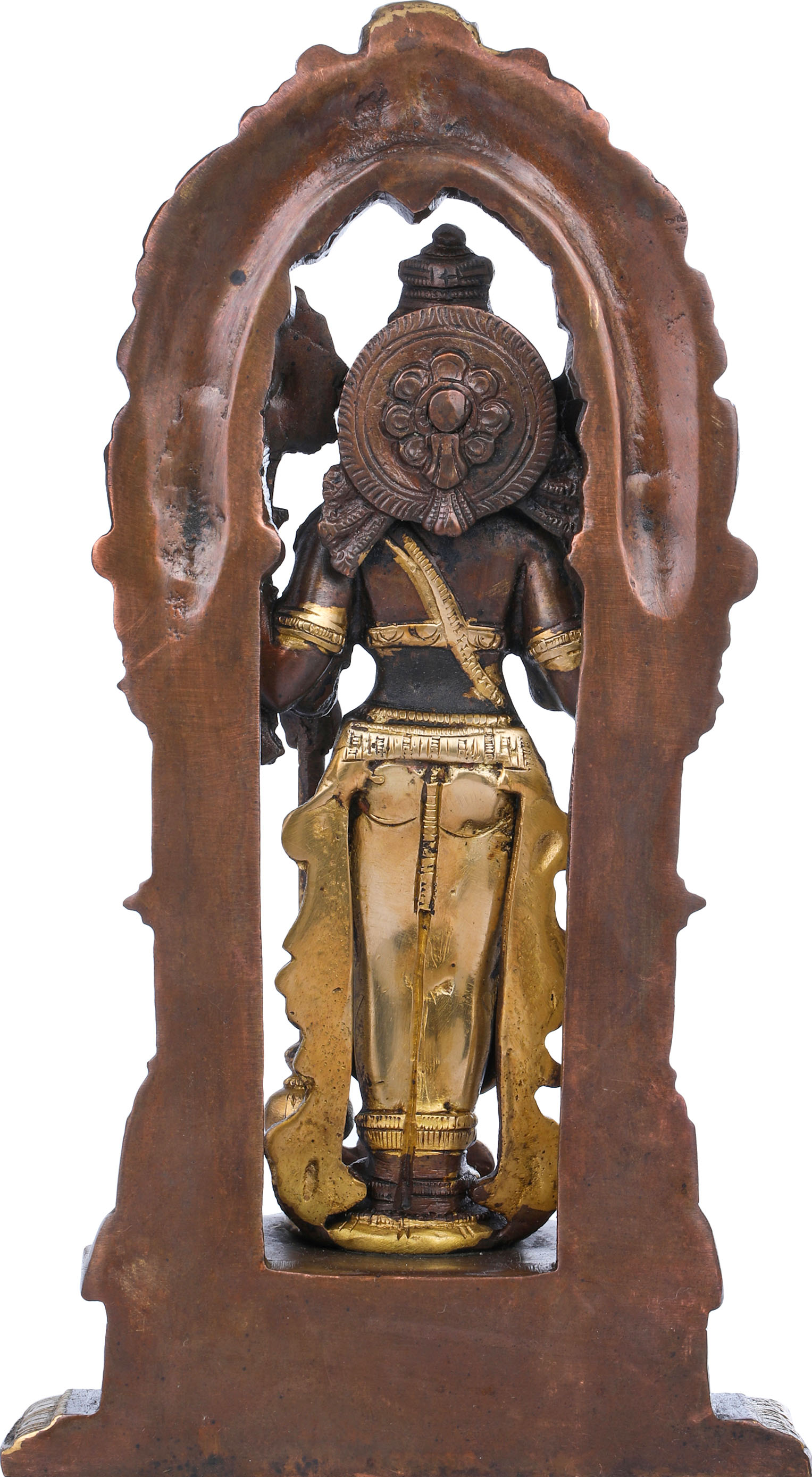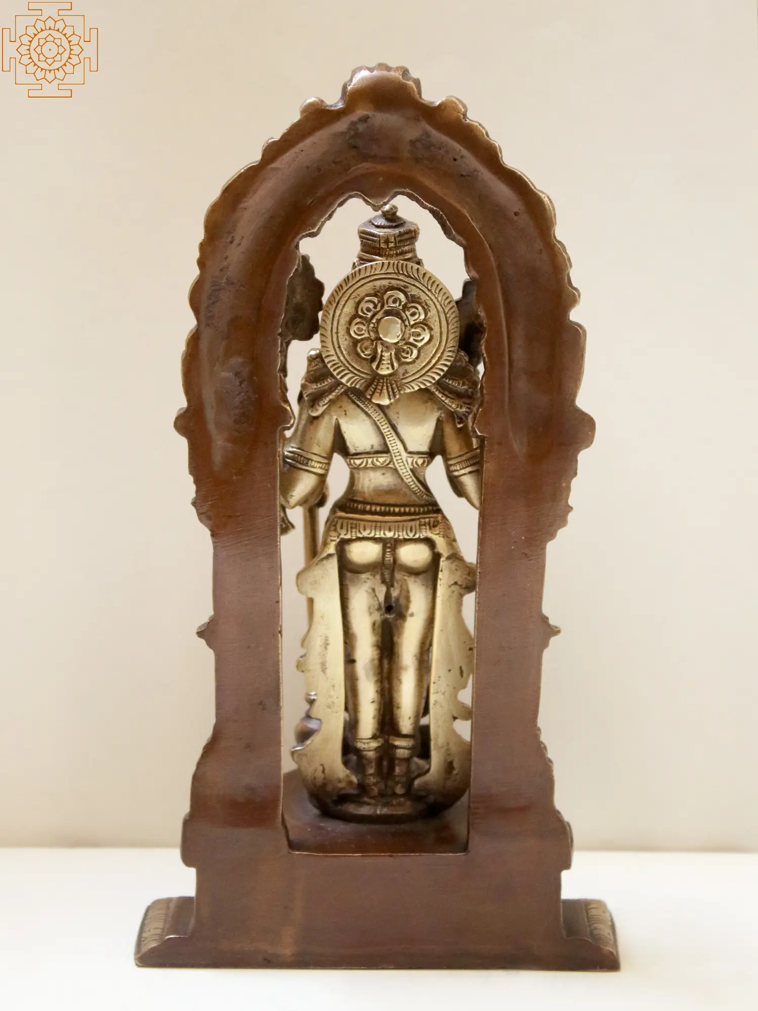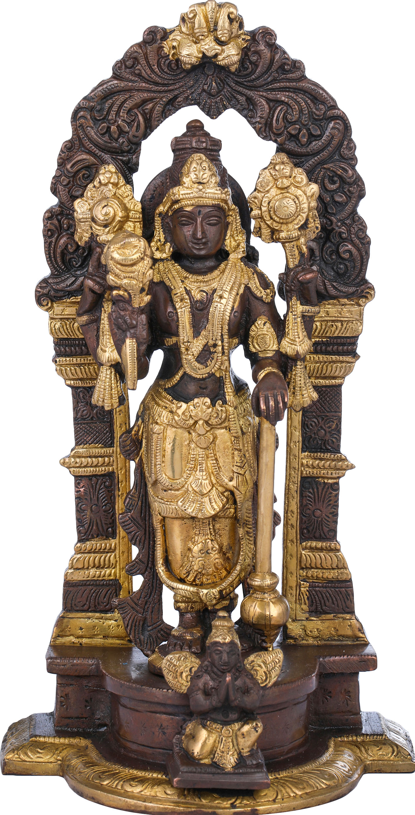 Experience the divine energy of Lord Vishnu with this magnificent brass statue. Lord Vishnu, the preserver and protector, is a prominent figure in Sri Vaishnava tradition. This statue portrays Lord Vishnu standing on a Garuda pedestal, symbolising his eternal vigilance. Display it in your home to invite blessings of protection and preservation, in alignment with the sacred principles of Hinduism.