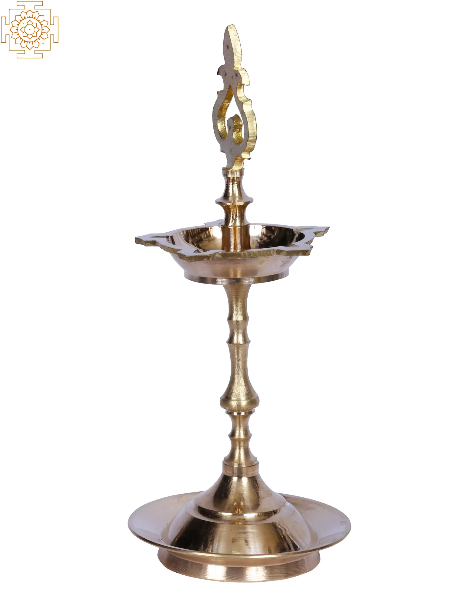 The detailed craftsmanship of this brass lamp is evident in every curve and contour. The polished brass gleams, reflecting the light and adding a touch of opulence. The stem is gracefully shaped, leading to a decorative top finial that adds an artistic flourish. The lamp's bowl is designed to hold oil and a wick, ready to be ignited and fill your surroundings with a gentle, warm glow. Its sturdy base ensures stability, making it a safe and beautiful addition to your altar, puja room, or any area dedicated to spiritual practice. This lamp is not merely decorative; it is a functional piece of art that connects you to centuries of devotional practices and artistry.
