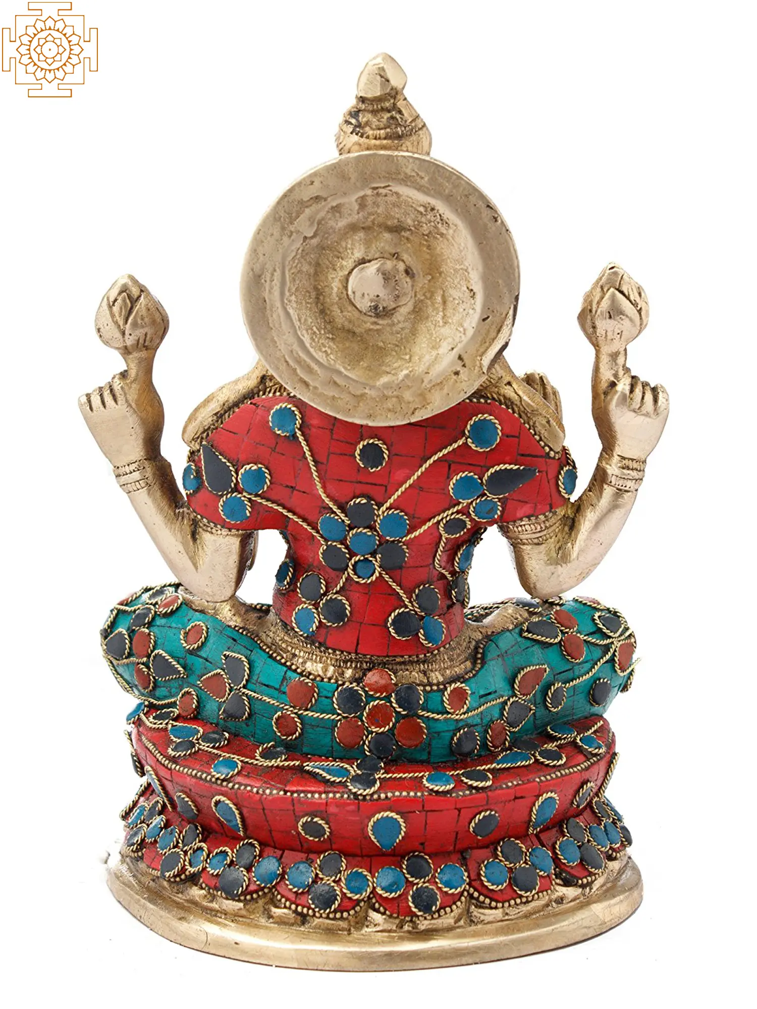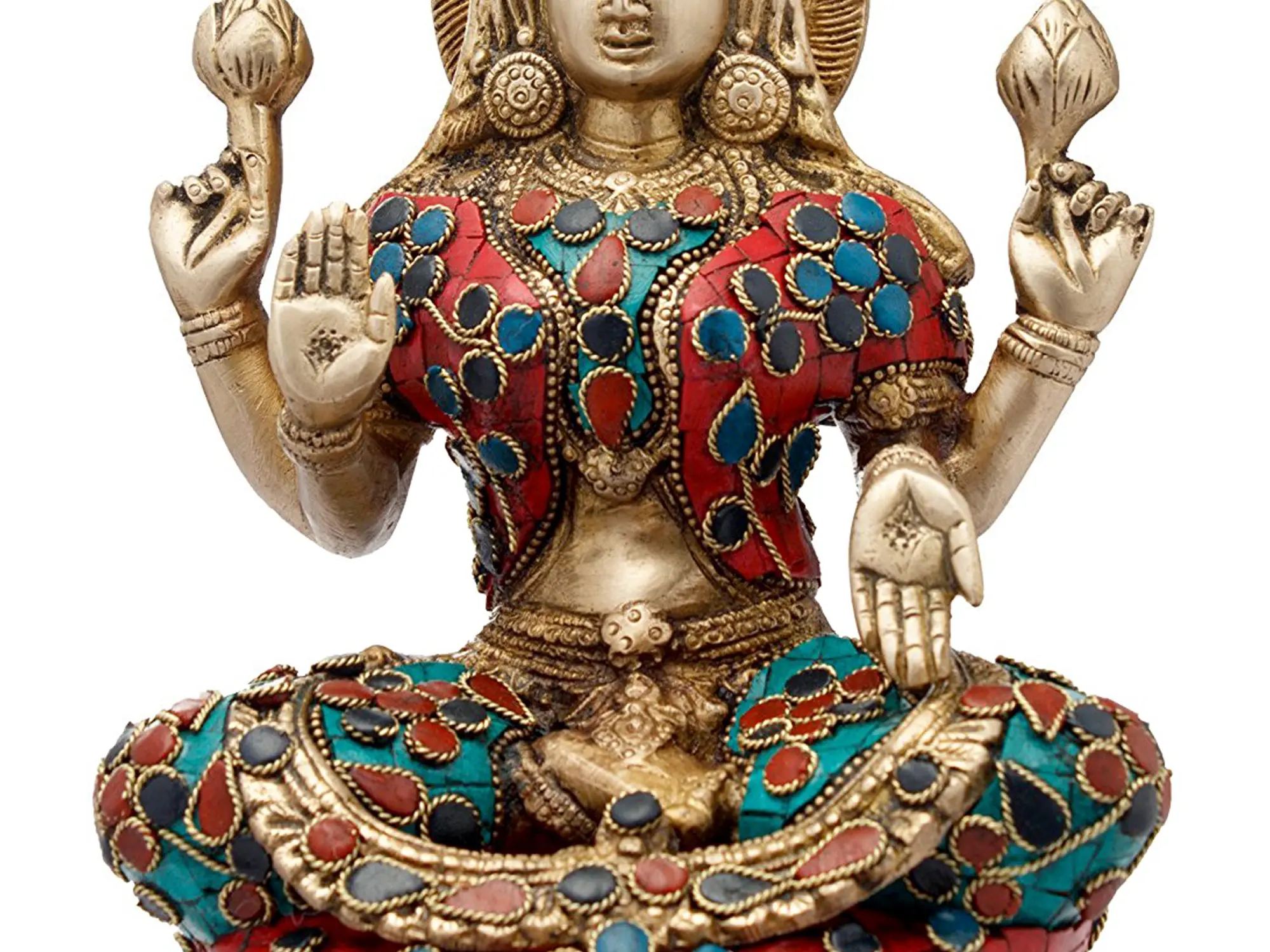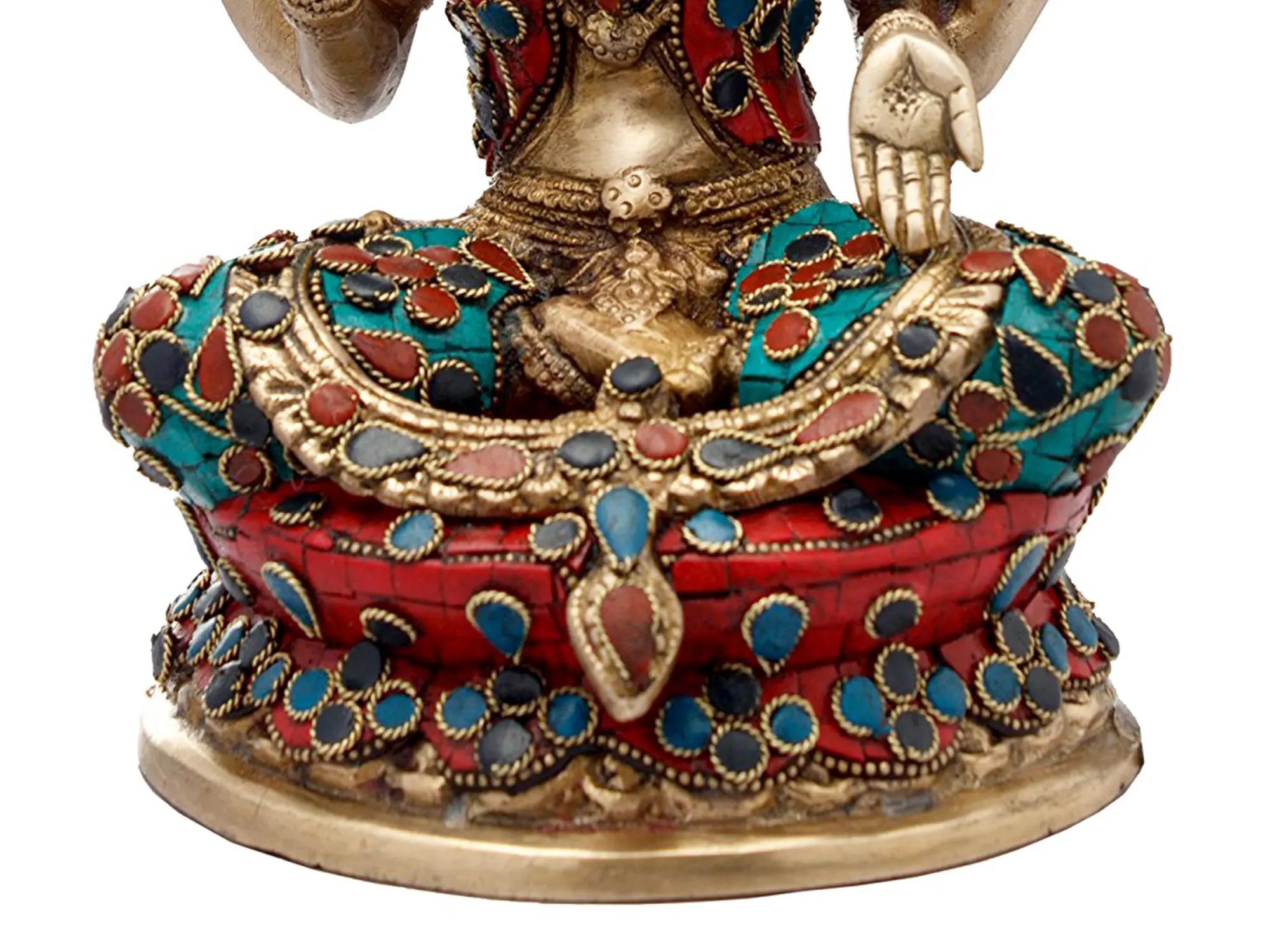 This remarkable brass sculpture of seated Goddess Lakshmi is a visual masterpiece, with her saree and the pedestal inlaid in complementary colours. Goddess Lakshmi represents wealth, prosperity, and abundance as Chaturbhujadharini in Abhaya and Varada mudras. Indian artisans have skillfully crafted this sculpture, symbolising the blessings of Lakshmi in a vibrant and artistic form. By placing it in your home, you invoke the goddess's blessings and create an atmosphere of opulence, harmony, and financial well-being.