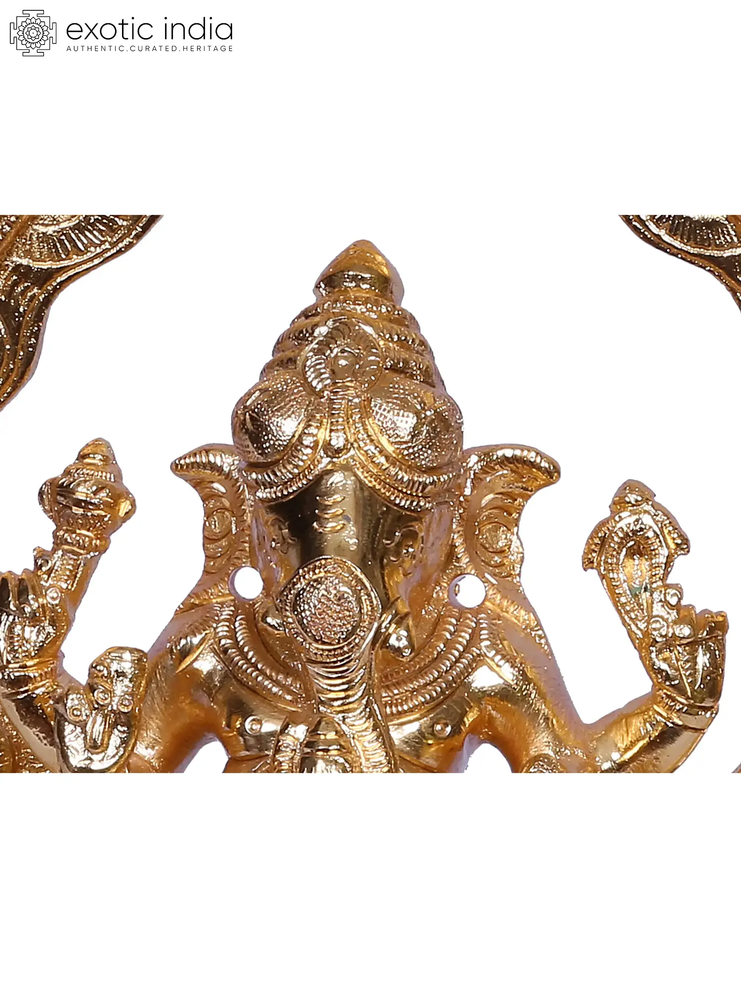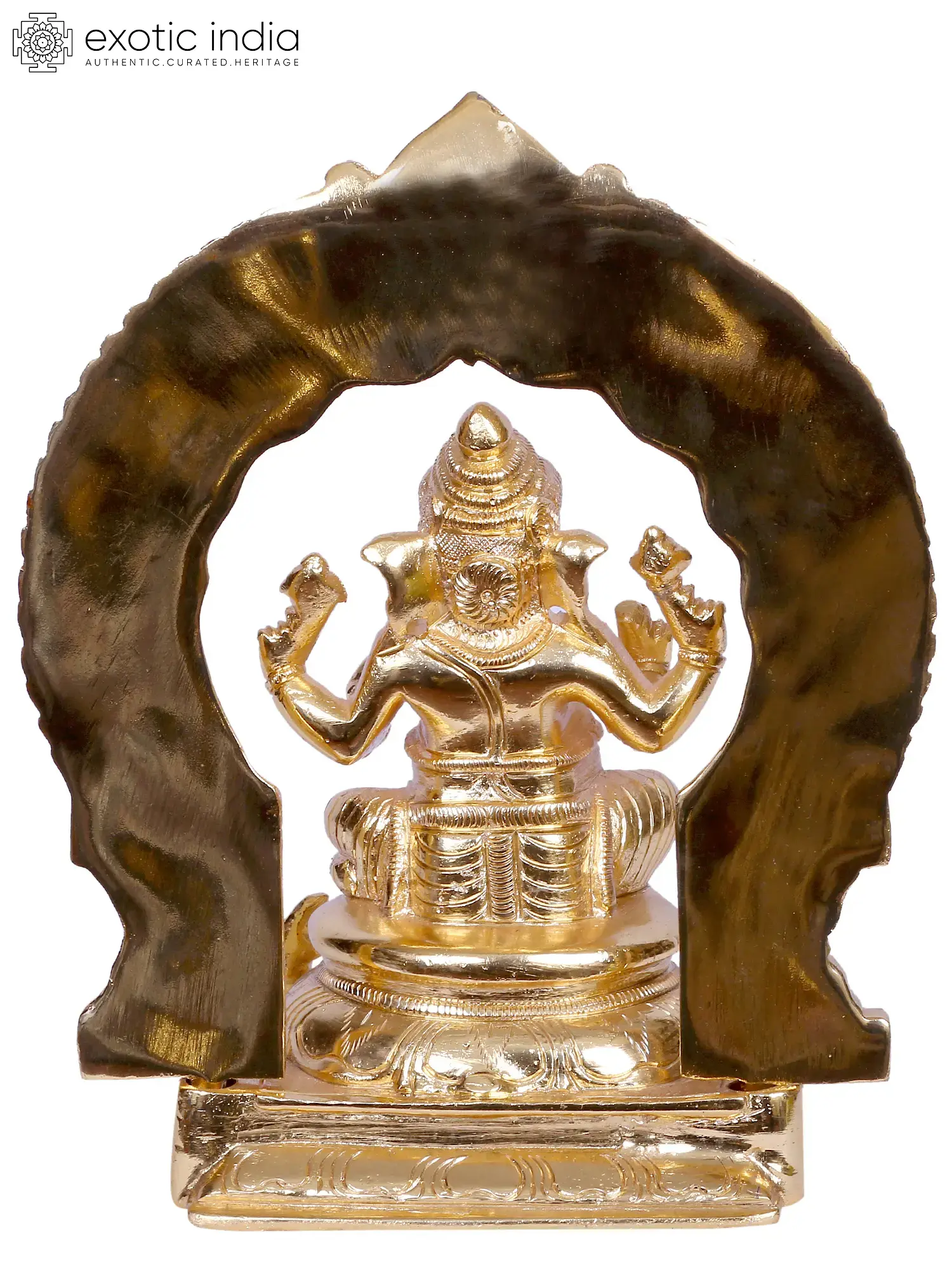 Each curve and contour of this sculpture speaks of meticulous artistry. Lord Ganesha is depicted in a seated posture, a symbol of stability and composure. His trunk is curled delicately, and his large ears signify his capacity to listen to all prayers. The four arms, a common iconography, represent his power to bestow protection, grant boons, and remove impediments. In his hands, he might hold symbolic objects such as a noose, an axe, a bowl of modak (his favorite sweet), or his own broken tusk, each imbued with profound meaning. The intricate details of his jewelry and the fine pleats of his dhoti showcase the skilled craftsmanship that has gone into its creation. The statue is framed by an ornate arch, reminiscent of temple toranas, further enhancing its regal and sacred aura.