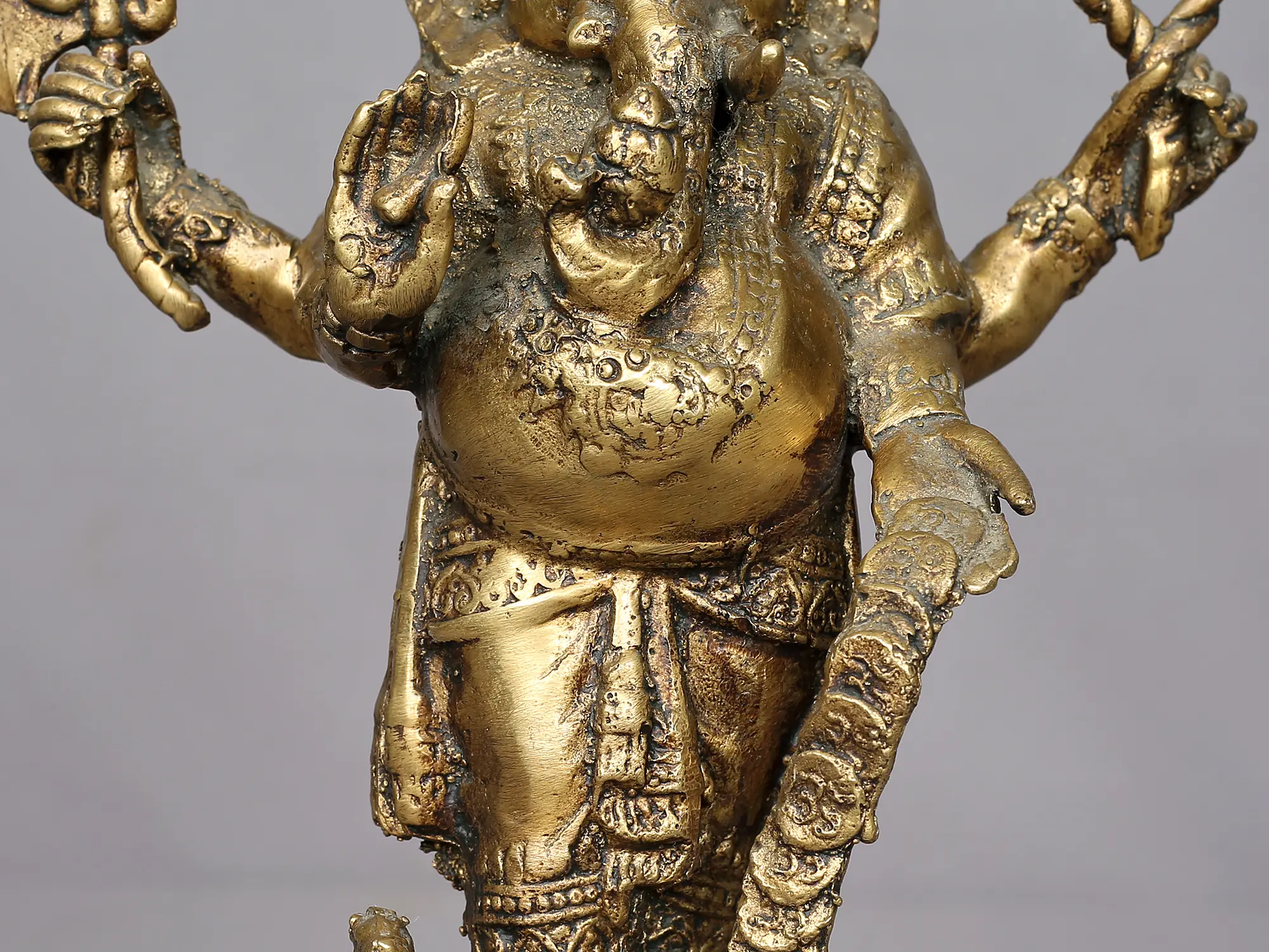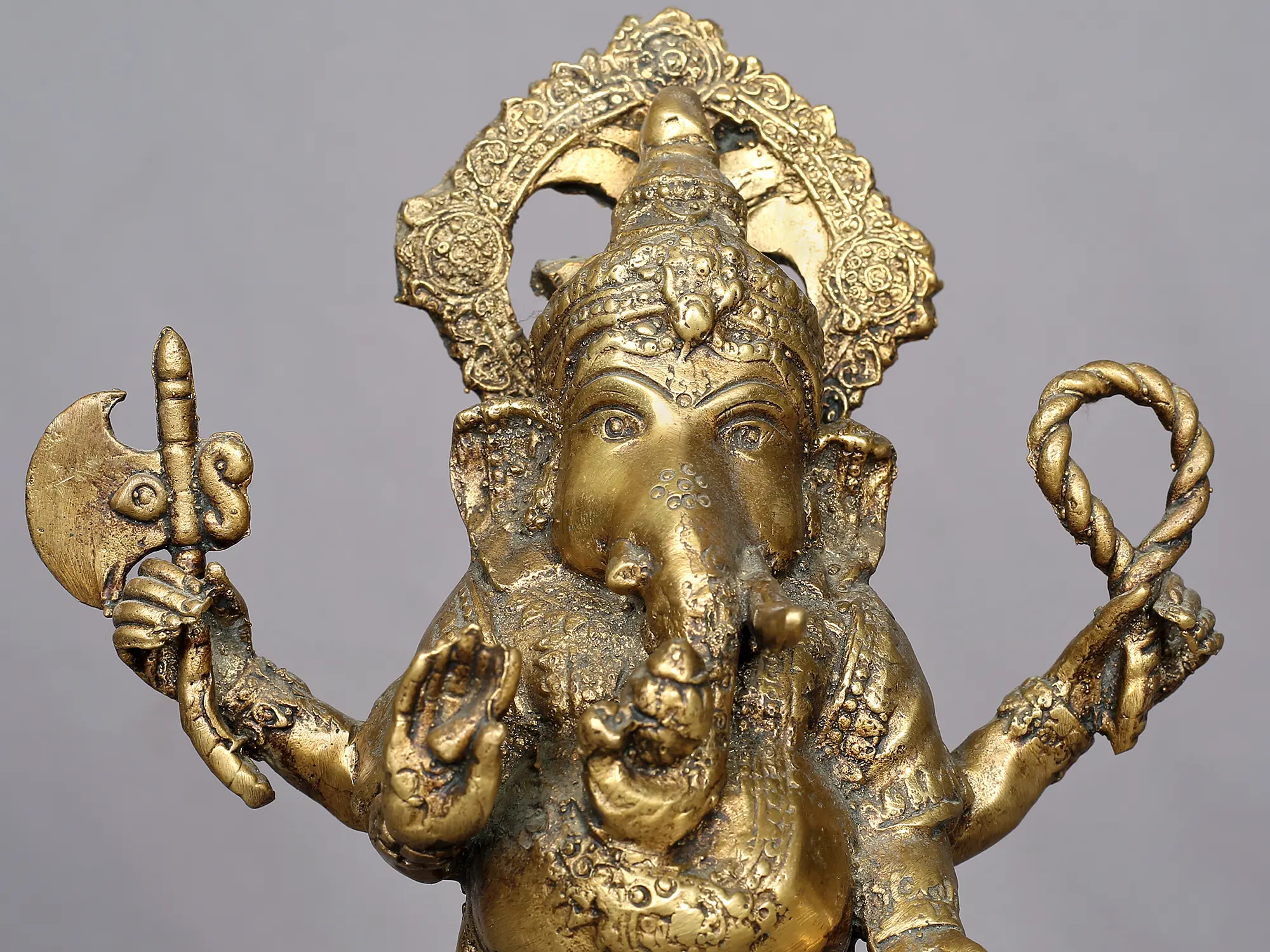 Sri Ganesha, the Lord of Auspiocusness is a popular deity in Hindu culture across the globe. His powers and benevolence are revered in the iconography of this brass statue from Nepal, which depicts the elephant-faced god in the regional style, with characteristic Nepalese detail that gives the statue an artistic appeal.