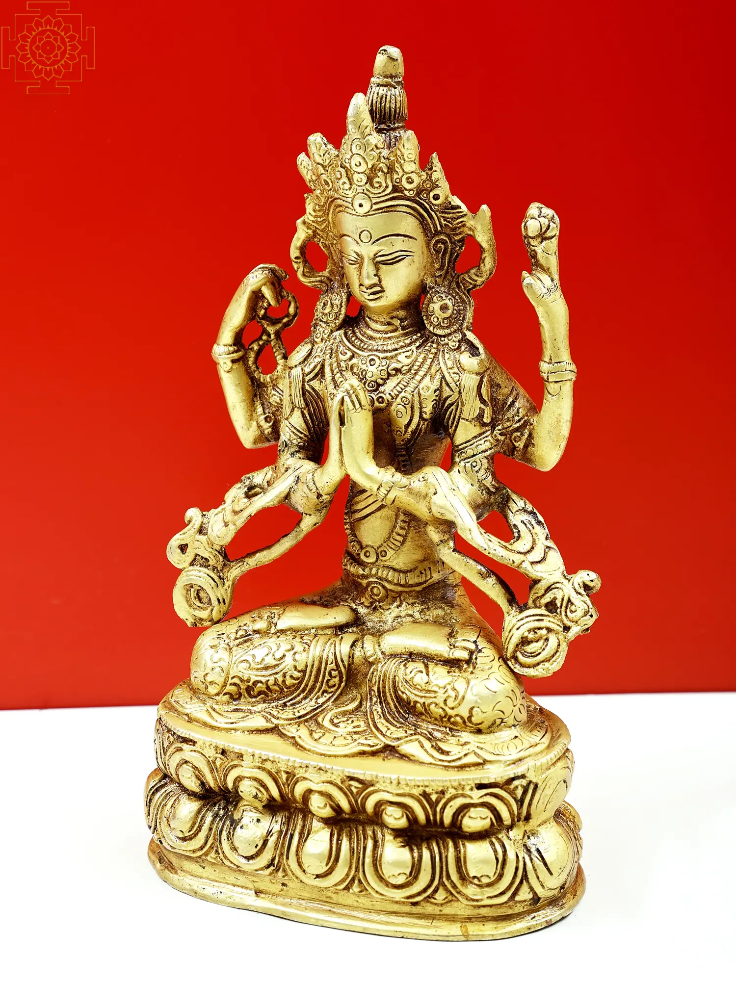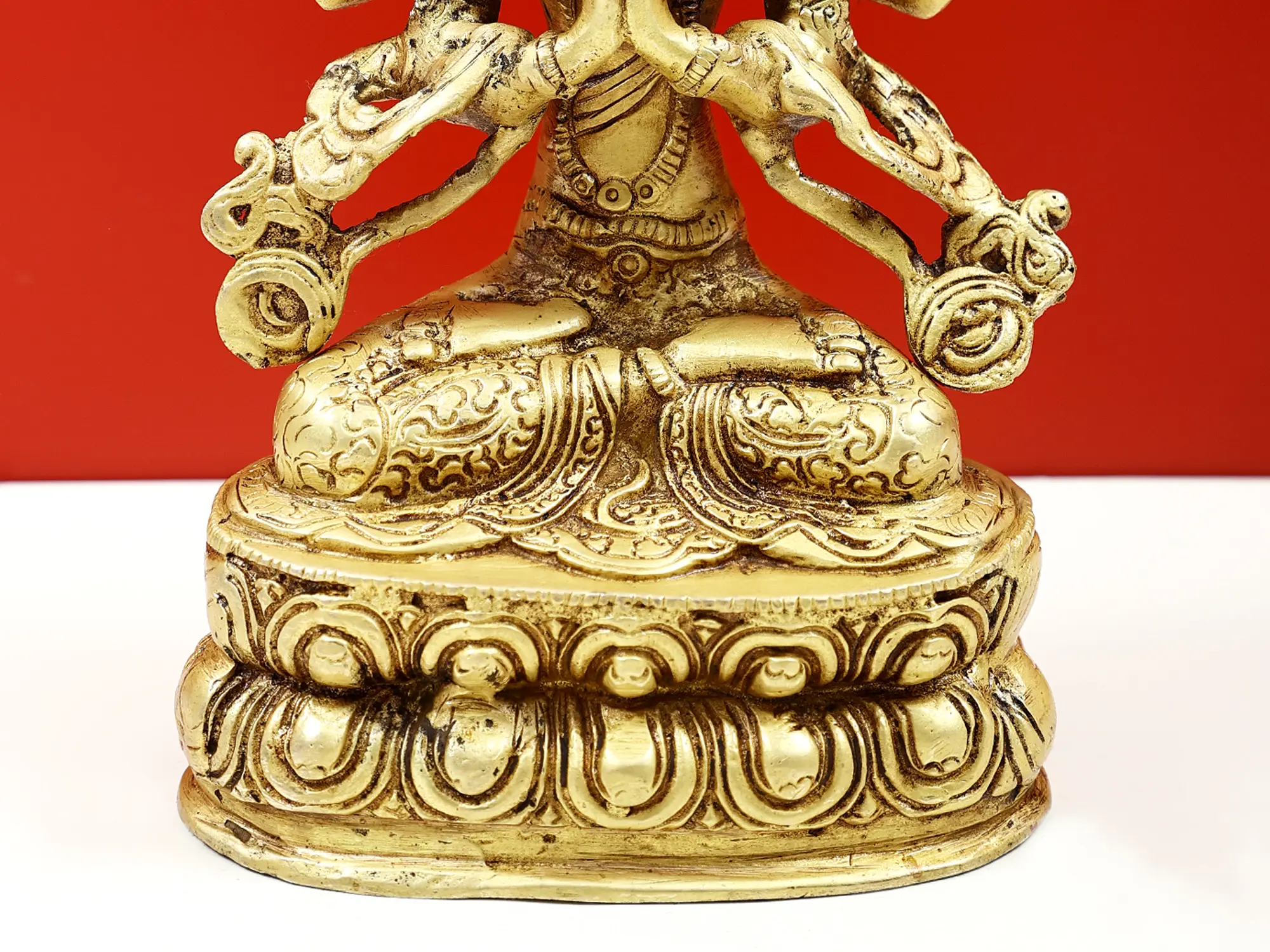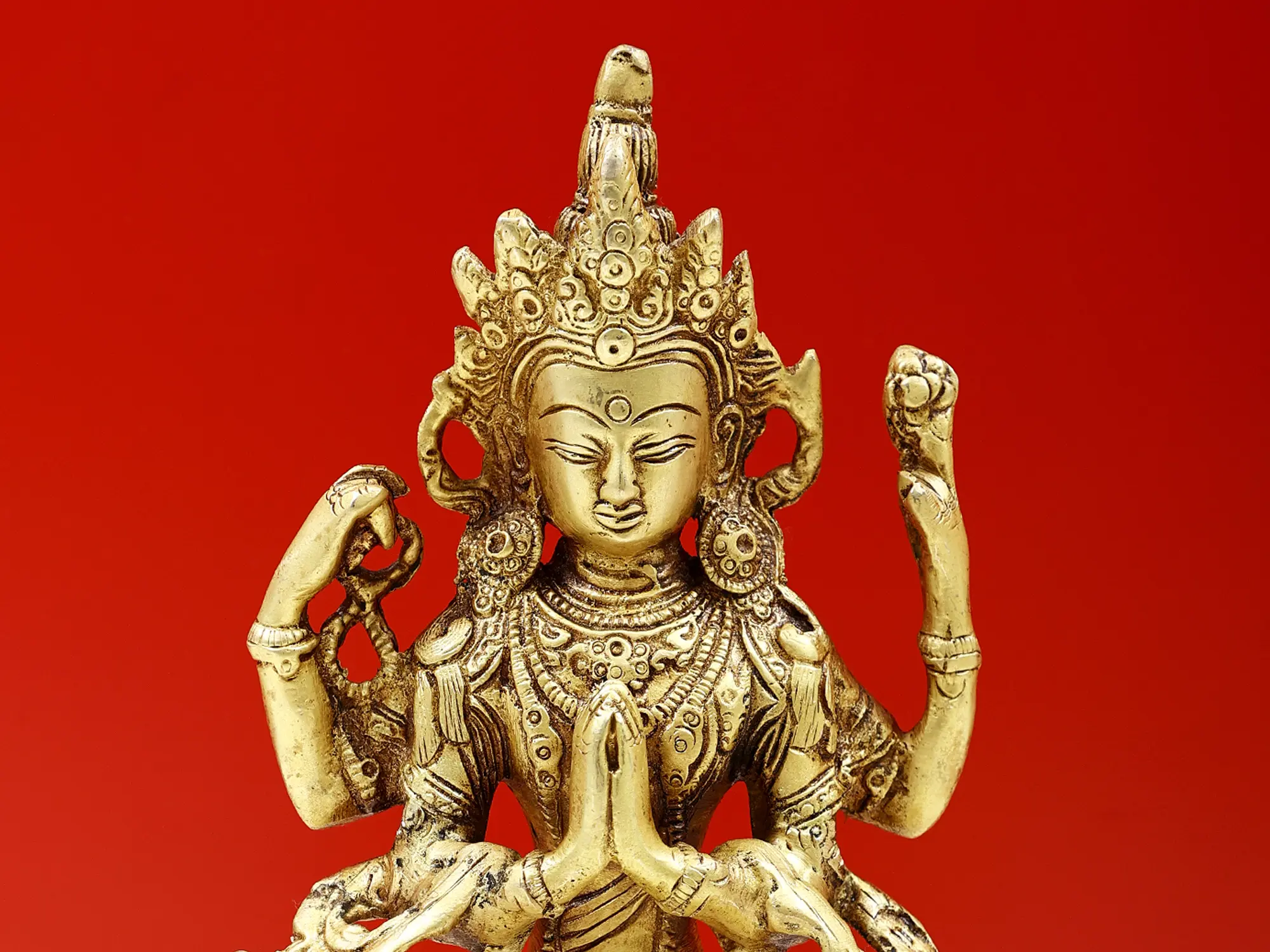 Chenrezig, the embodiment of compassion, emerges within the 9" Brass Tibetan Buddhist Deity. His many arms symbolise boundless empathy, reaching out to alleviate suffering. In his upper hands, he holds a mala, bestowing blessings, and a lotus, signifying purity. His presence is a beacon of enlightenment, and the sound of his mantra, 'Om Mani Padme Hum', resonates within his being. As this brass sculpture graces our world, we're reminded of our innate capacity for kindness. Chenrezig's gaze becomes a mirror, reflecting the potential for compassion that lies within us all.