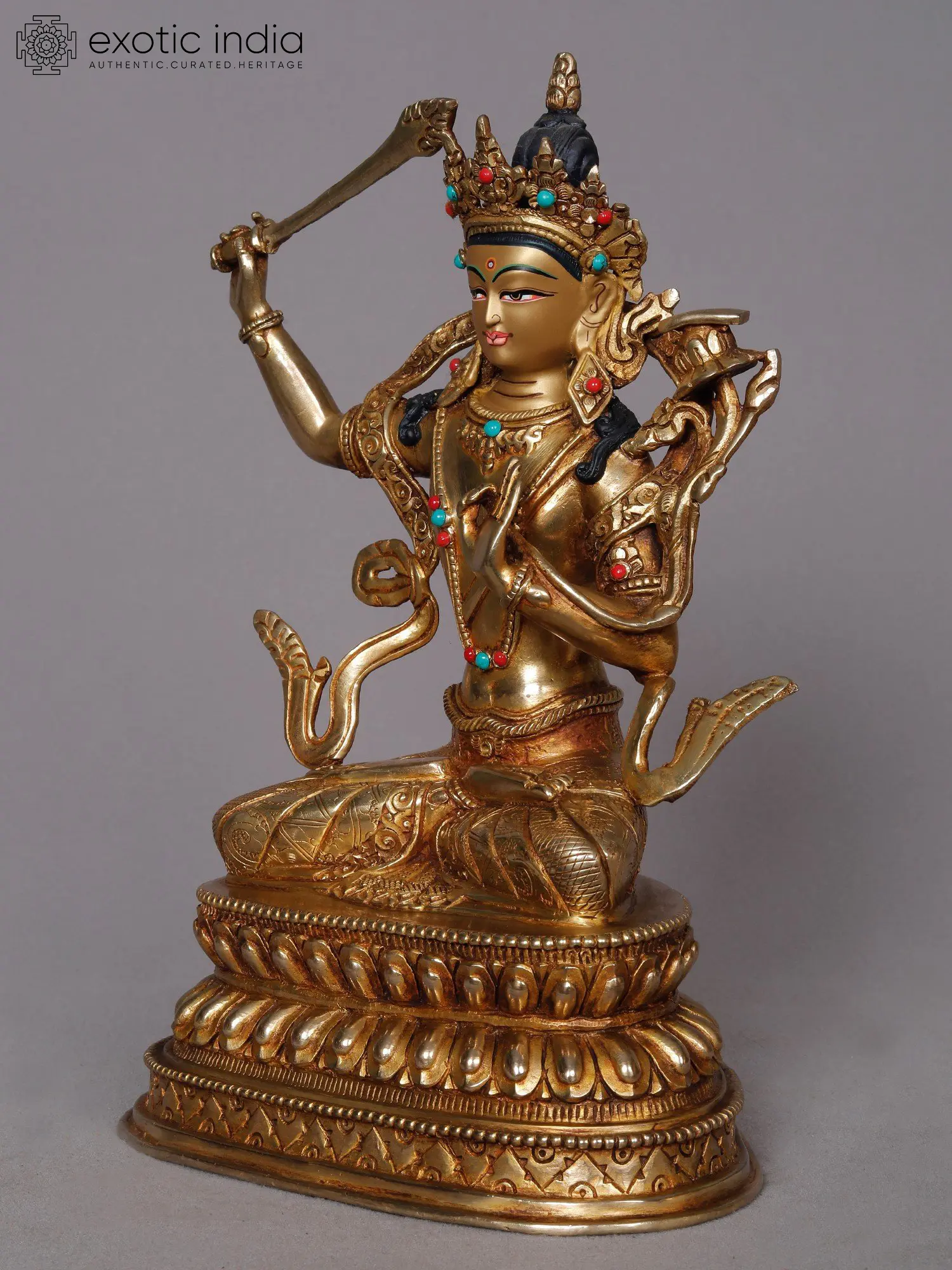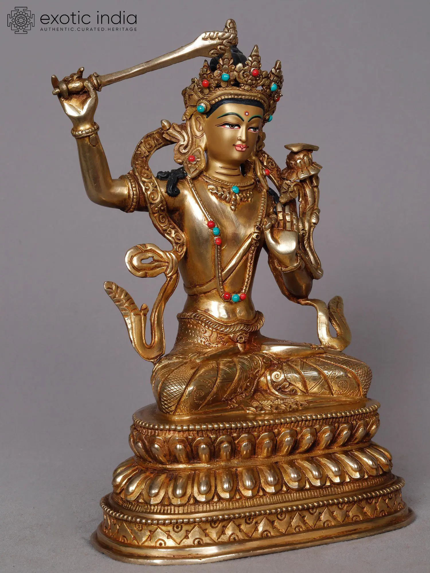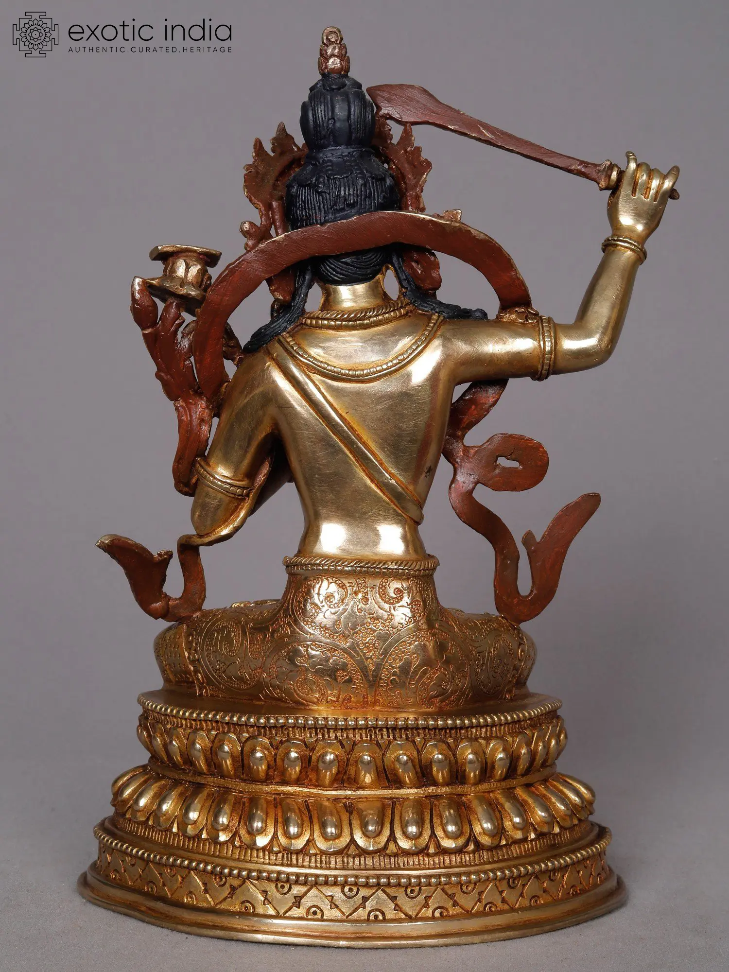 Manjushri, or the Bodhisattva of Wisdom, wields the Prajna khadga, or Sword of Wisdom, in his hand. This sacred blade is believed to radiate luminous rays that pierce through the darkness of ignorance, illuminating the path to enlightenment.
