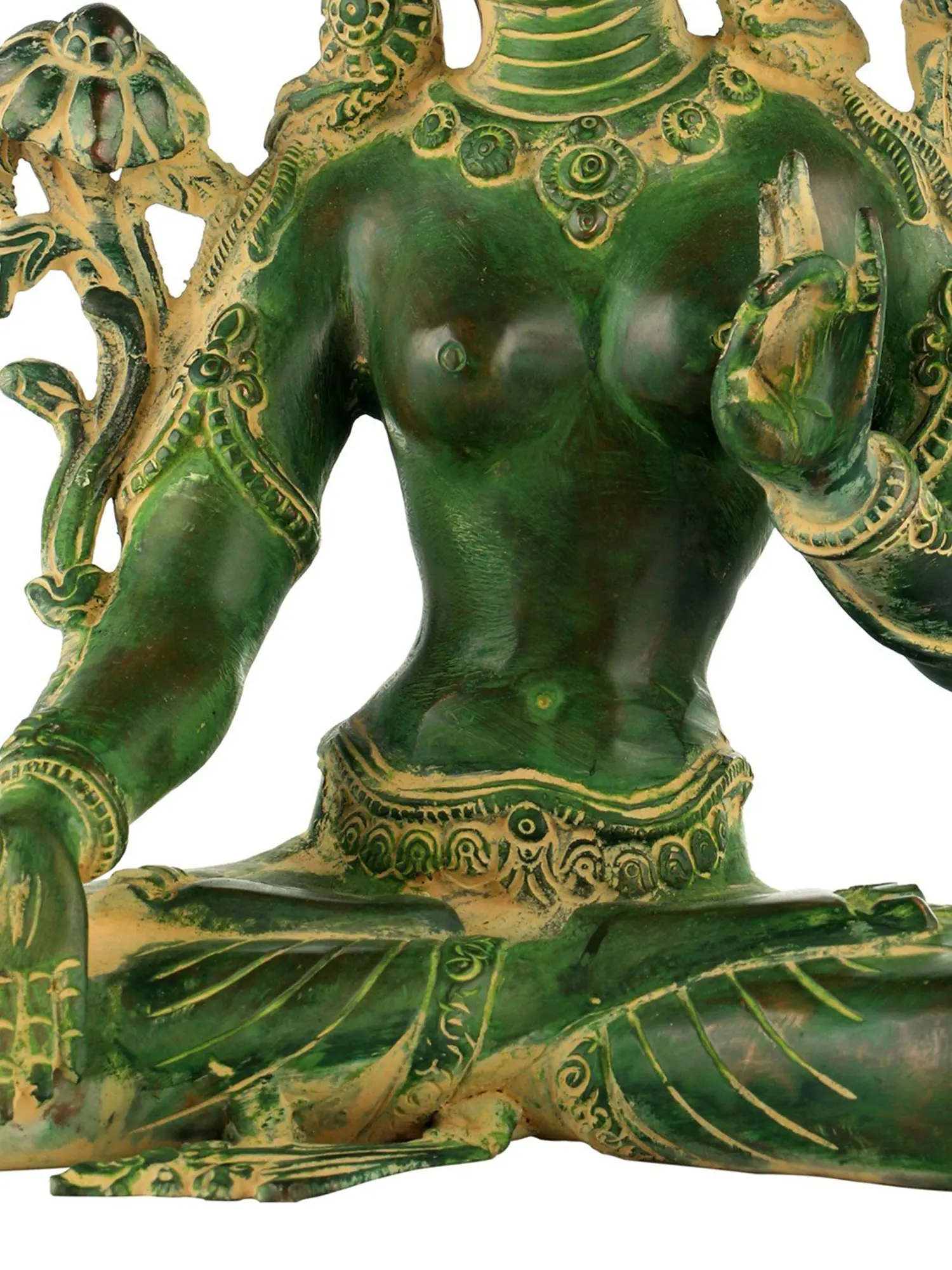 Personifying compassion, purity, and the capacity to ease suffering, the White Tara is a highly regarded figure in Buddhism. By using brass to give the statue an aged and refined appearance, this depiction expertly portrays her tranquil and graceful beauty. Crafted from this noble substance, the artwork represents blessings, healing, and protection. It serves as a focus of devotion and inspiration for people looking for spiritual direction and comfort. Brass has been added to the sculpture, enhancing its aesthetic and cultural significance and highlighting the rich history and symbolism connected to White Tara in Buddhism.