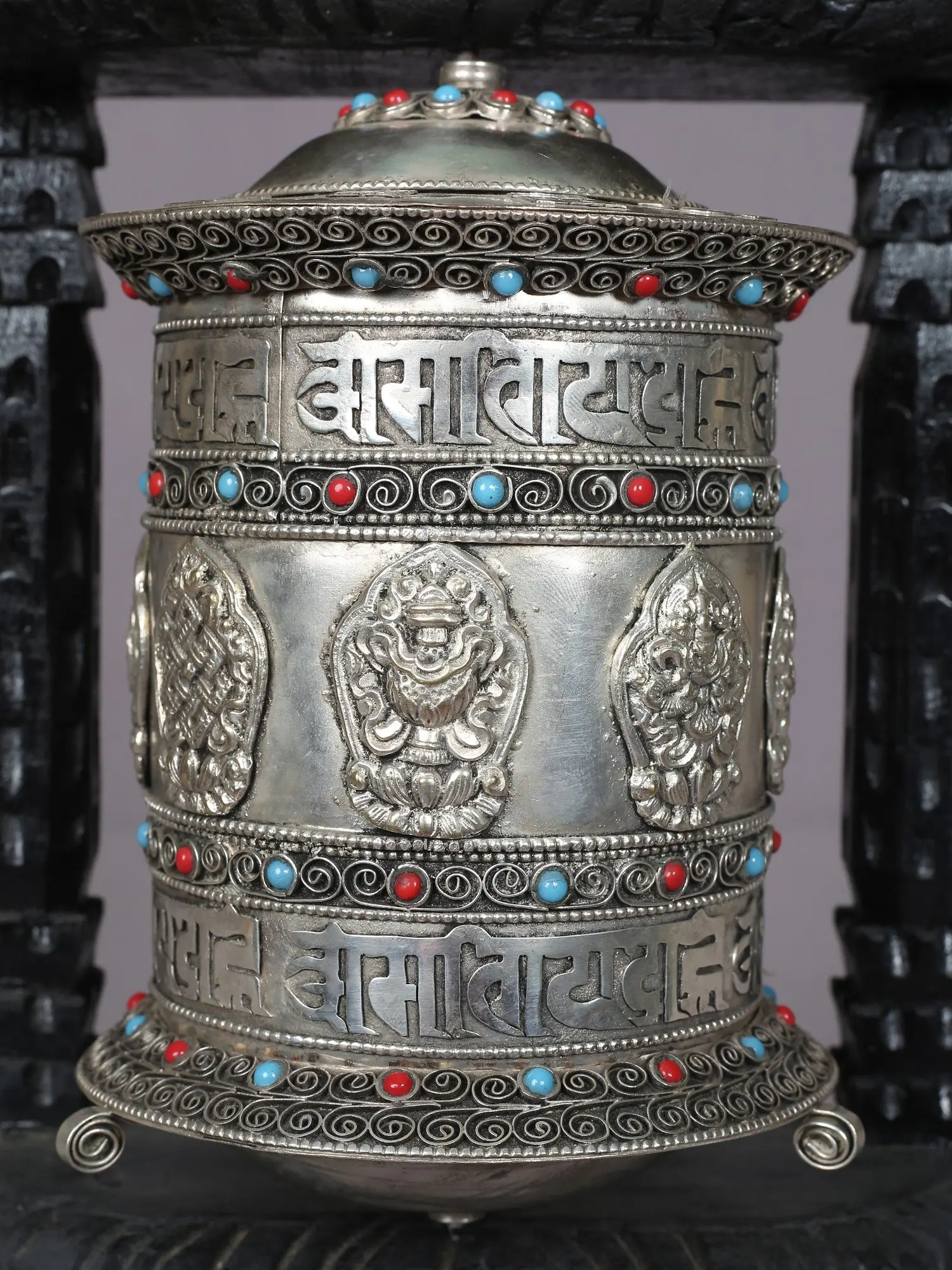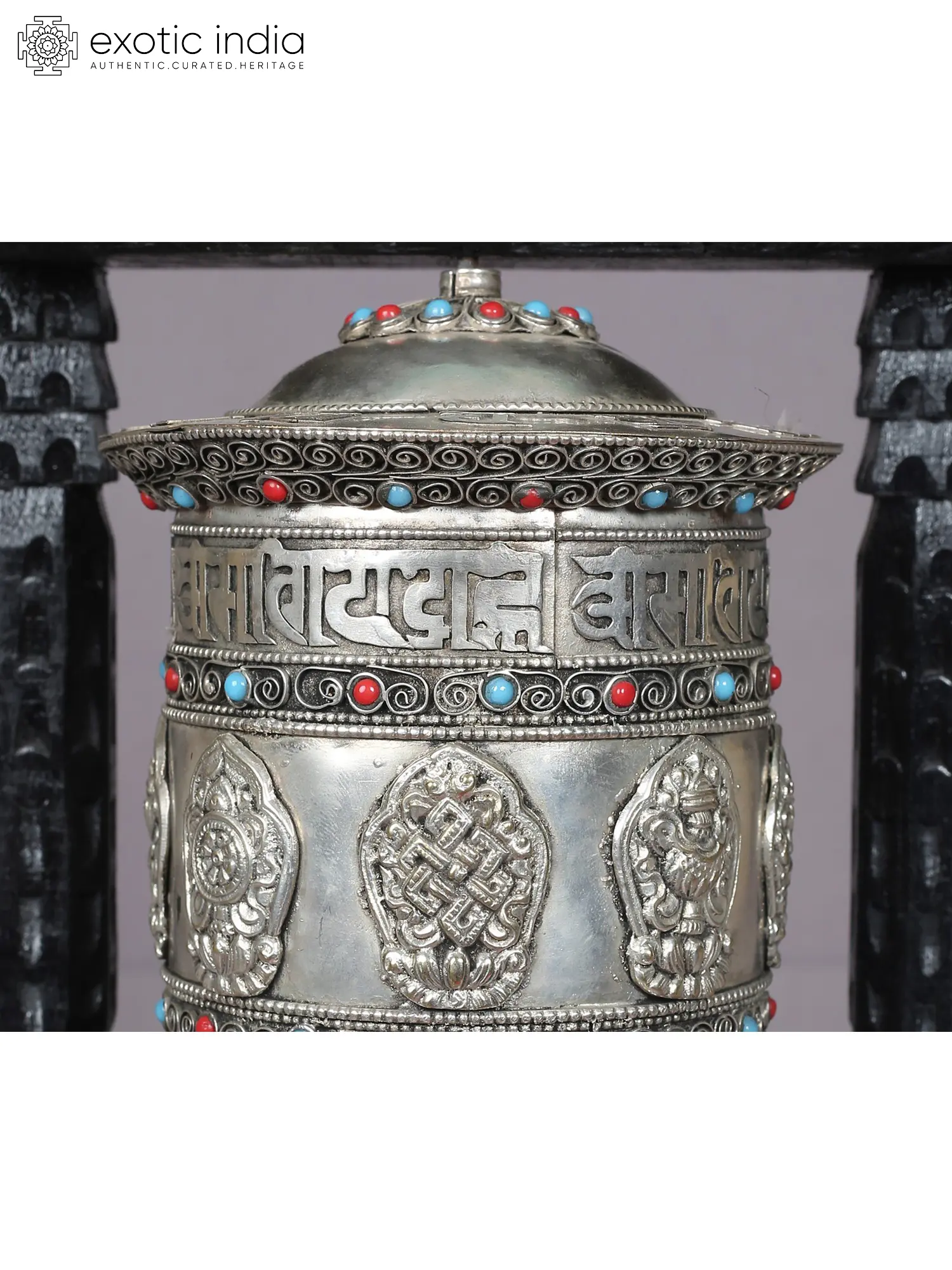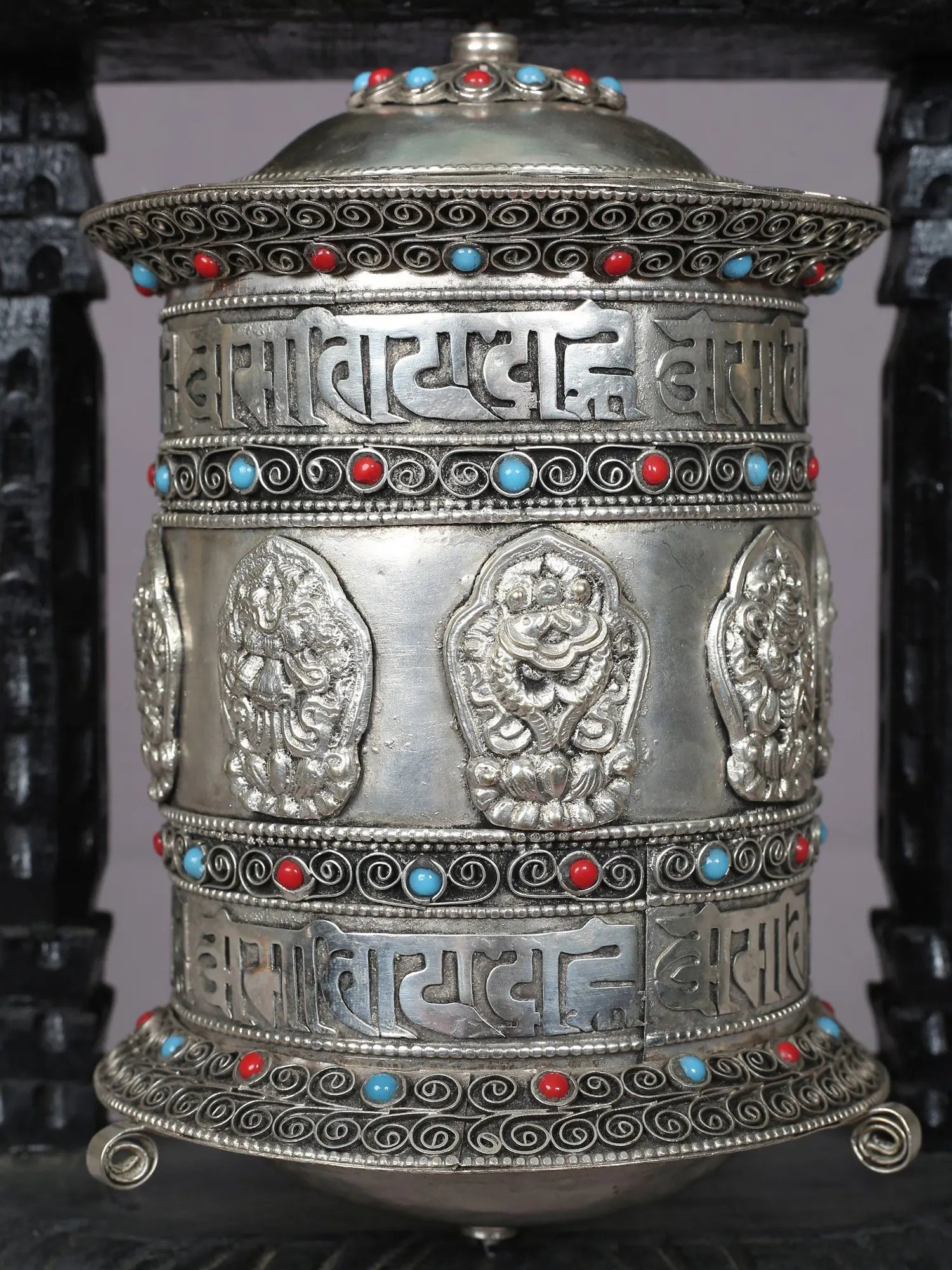 This Buddhist Prayer Wheel from Nepal, made of brass and painted in silver, is a revered tool in the meditation process. The wheel contains a scroll with the mantra inscribed, and spinning it is believed to have the same spiritual benefits as orally reciting the mantra. This practice is integral to Tibetan Buddhism, emphasizing the transformative power of prayer and meditation.