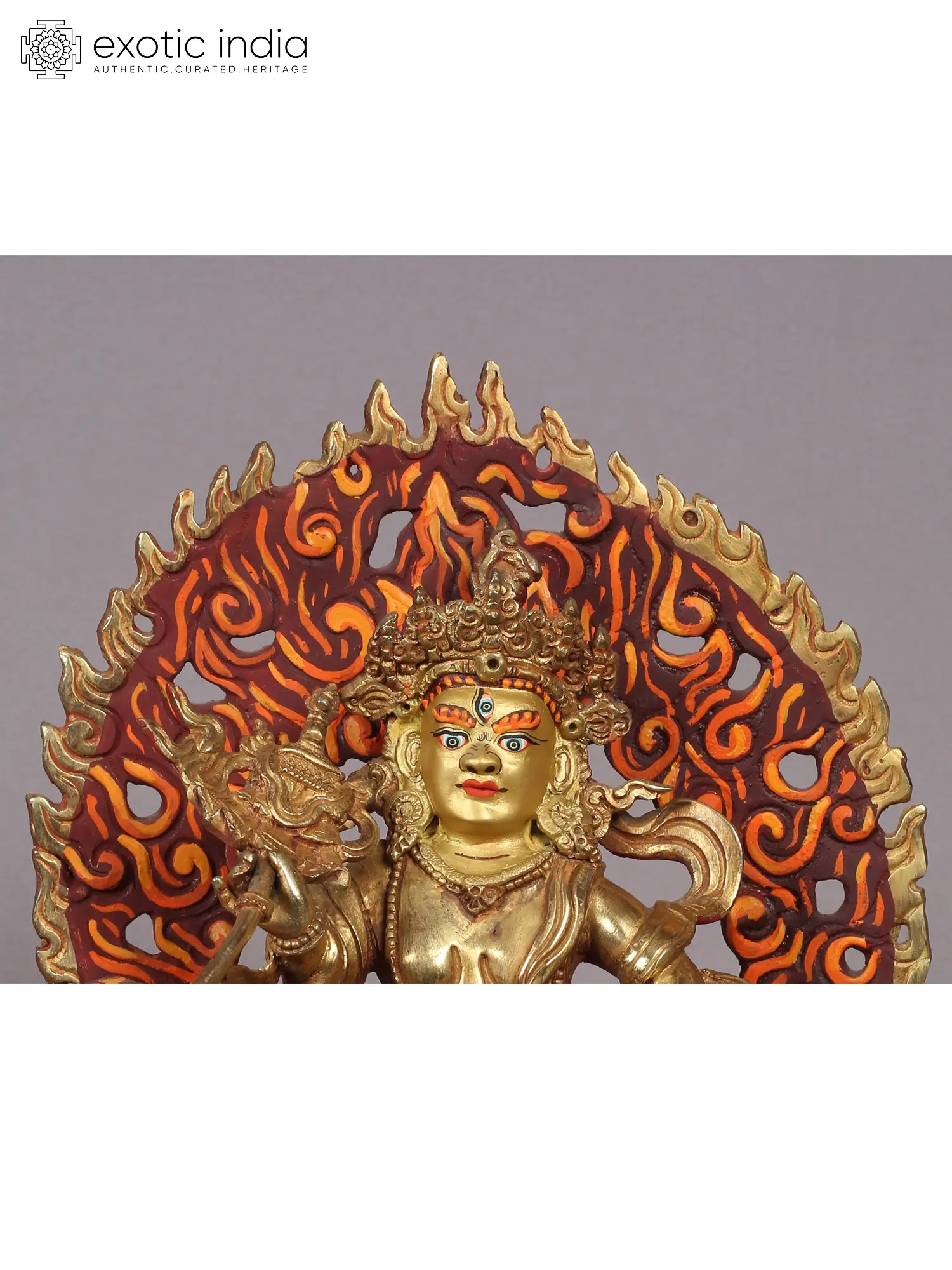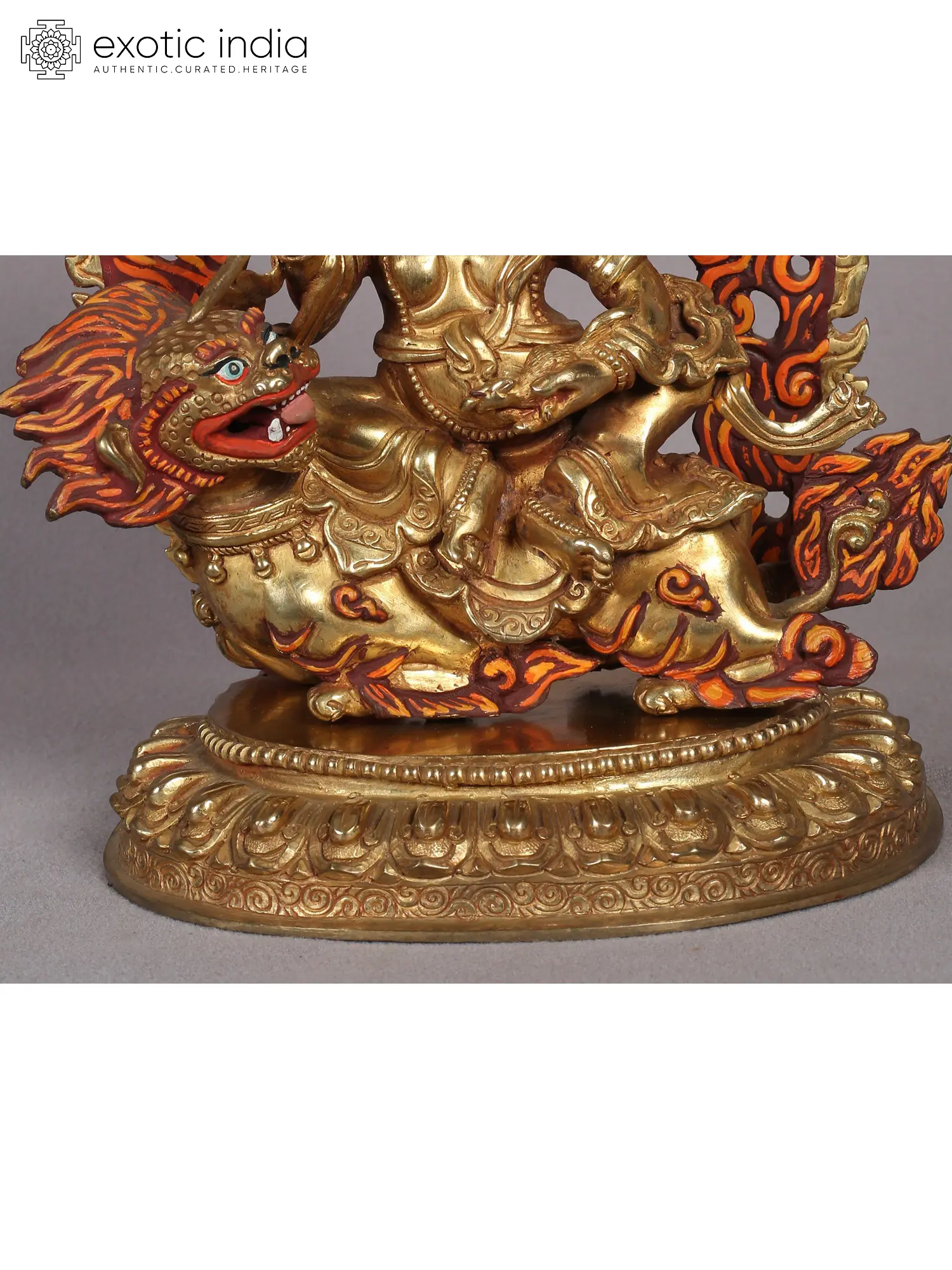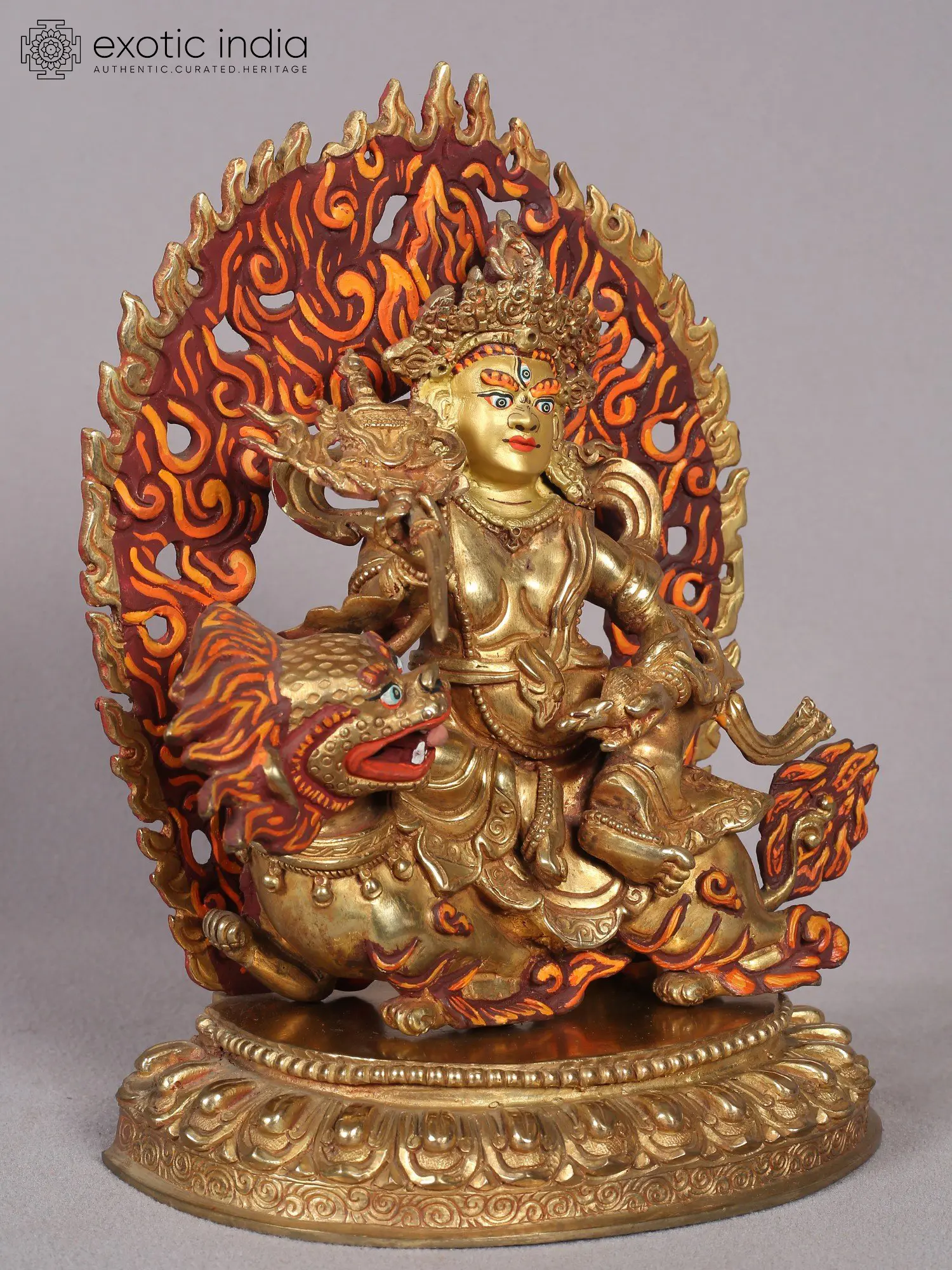 Singh Kubera is shown to be seated on a spacious base, with his right foot extended towards a conch shell placed atop a blossoming lotus. This plump figure wears regal attire, including a crown adorned with ribbons and jewelry. By his side, a mongoose is featured, symbolizing his triumph over the nagas (serpent deities) and representing the conquest of greed. As the God of Wealth, Kubera can be seen squeezing the mongoose, causing it to release a cascade of precious jewels.