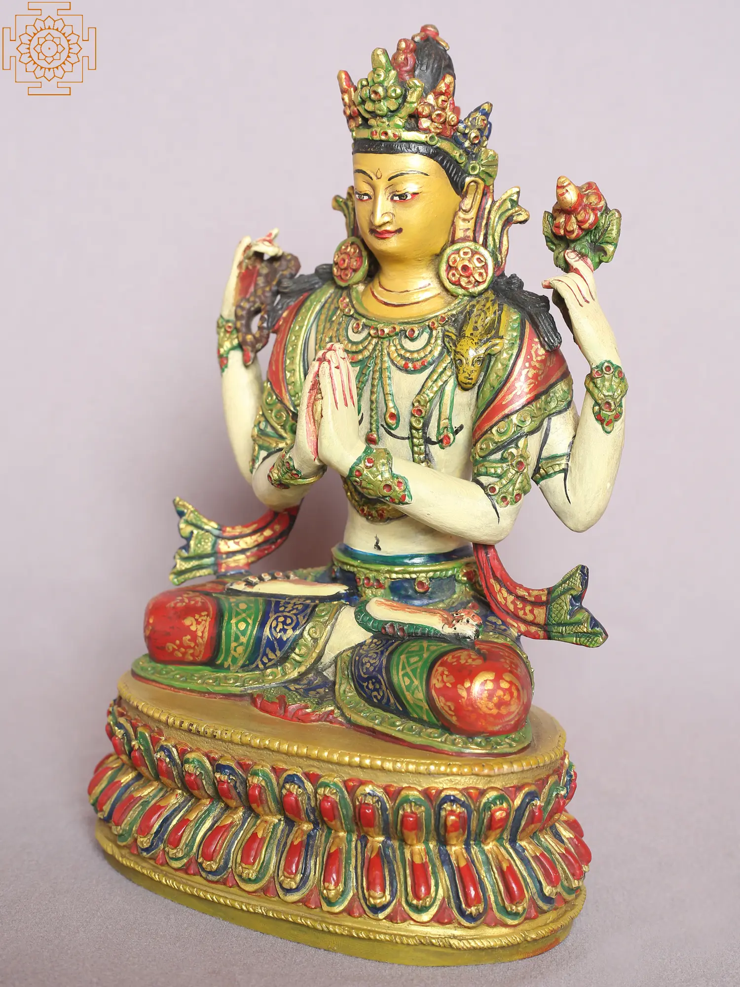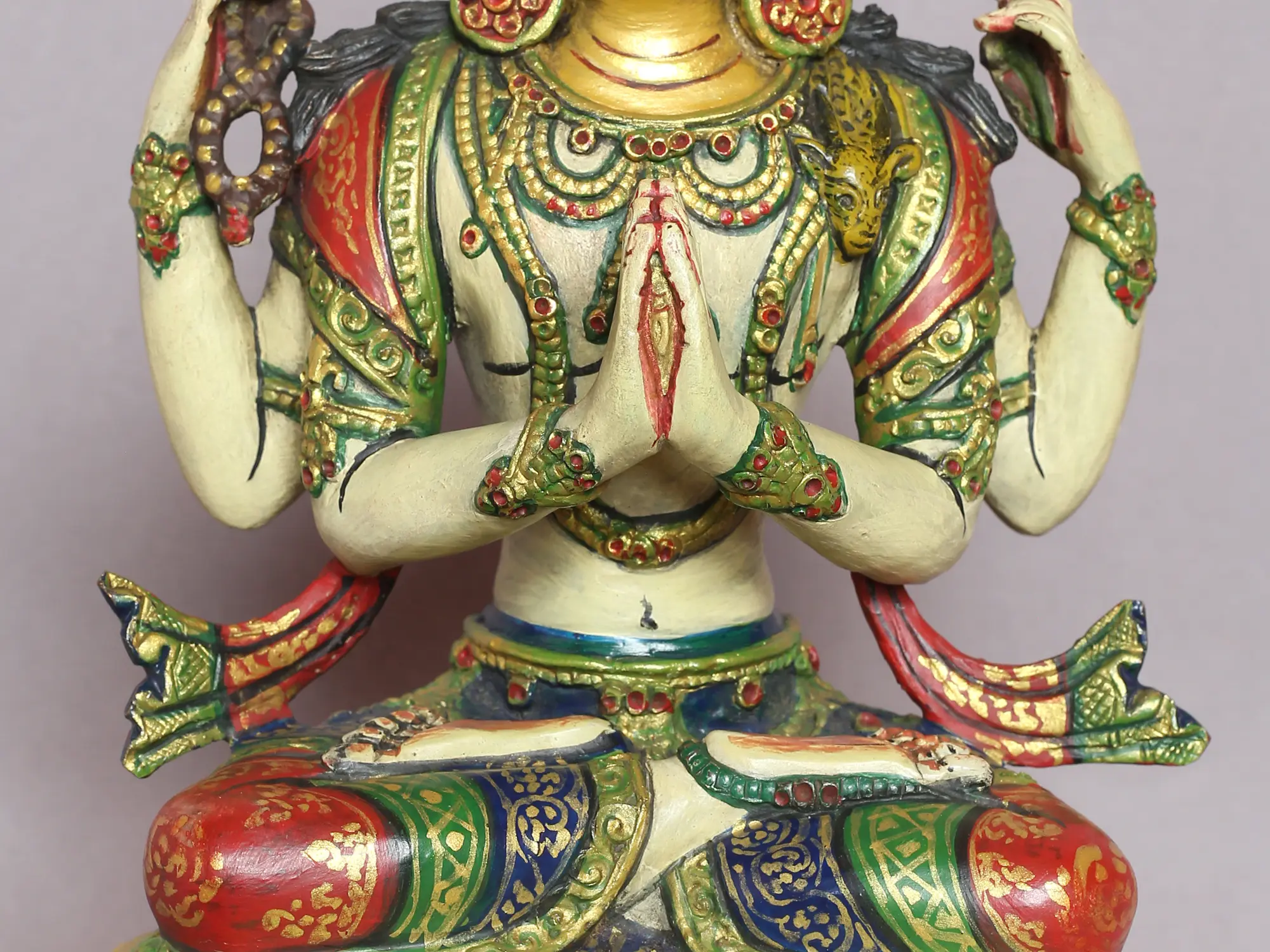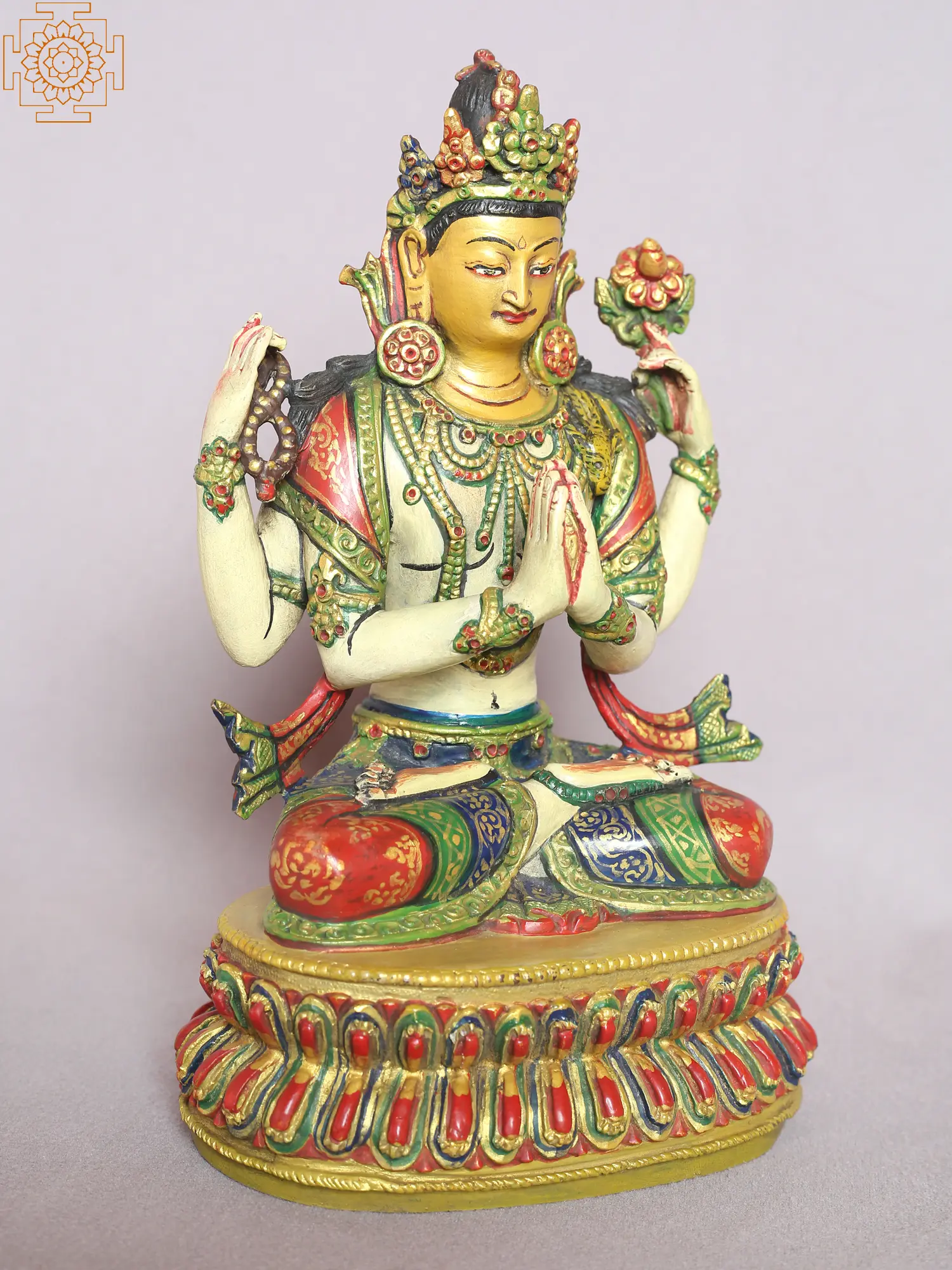 Chenrezig is enthroned on a beautiful lotus seat, ornamented with traditional jewelry and brocaded attire. He holds the rosary and lotus in his secondary hands and with his primary hands joined in front, he holds the Chintamani, or wish-fulfilling jewel.