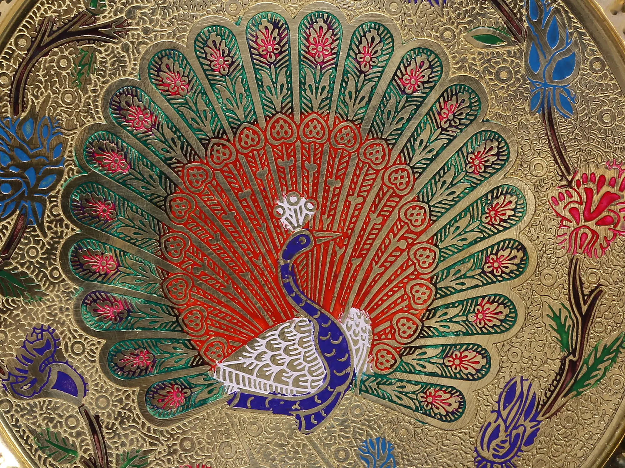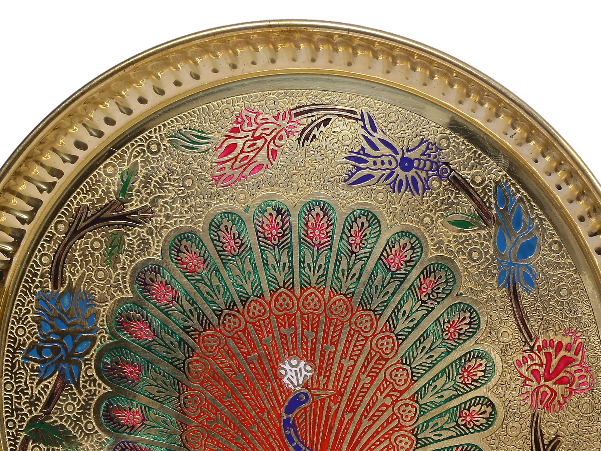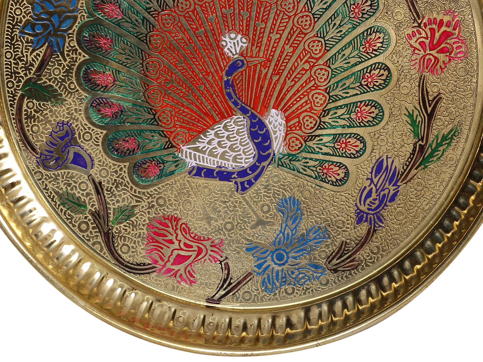 This magnificent plate has a captivating peacock pattern that has been painstakingly carved in brass and is embellished with brilliant hues. The beautiful handiwork is evidence of the artists' ability and knowledge who meticulously created this piece. The plate's generous size makes it perfect for displaying fruits, sweets, or as a decorative centrepiece in your home or office. The eye-catching peacock pattern represents beauty, grace, and abundance, making it a symbol of prosperity and good fortune. With its striking aesthetics and cultural significance, this magnificent work of art is an ideal addition to your decor collection or a thoughtful gift for someone special.