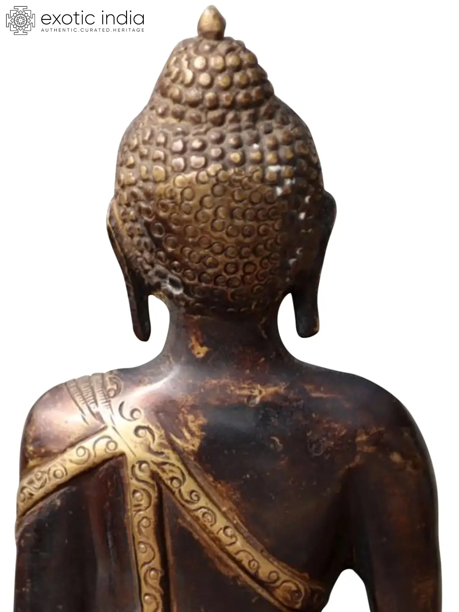 In his hand in the Dhyana mudra, placed in his lap, is the alms bowl, a symbol of austerity. His right-hand dangles toward the ground, in the Bhumisparsha mudra or the earth-touching gesture. Crafted in solid metal, the copper statue is permeated by the tranquil presence of the Buddha, meditating upon whom, the follower can find streams of enlightenment within.
