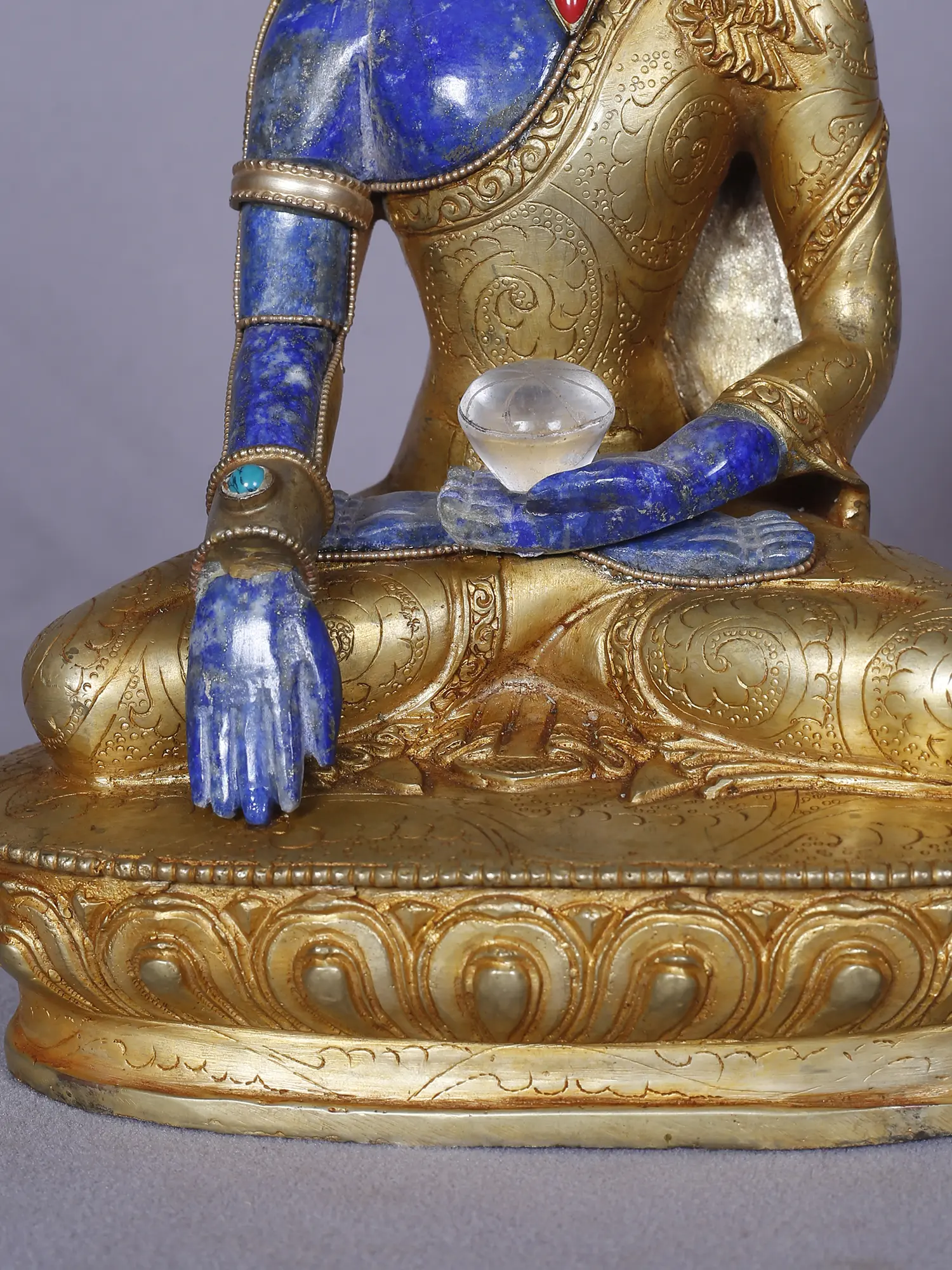 The vibrant blue lapis lazuli used in this statue is not simply a decorative element; it holds deep symbolic meaning. Throughout history, lapis lazuli has been prized for its rich color and believed to possess spiritual properties. In ancient Egypt, it was used in jewelry and amulets, associated with divinity and protection. In Buddhism, the deep blue symbolizes the vastness of the sky and the boundless nature of enlightenment. The use of this precious stone in the statue enhances its spiritual power and makes it a truly exceptional piece. The intricate detailing of the gold accents perfectly complements the deep blue, creating a stunning visual contrast that captivates and inspires.
