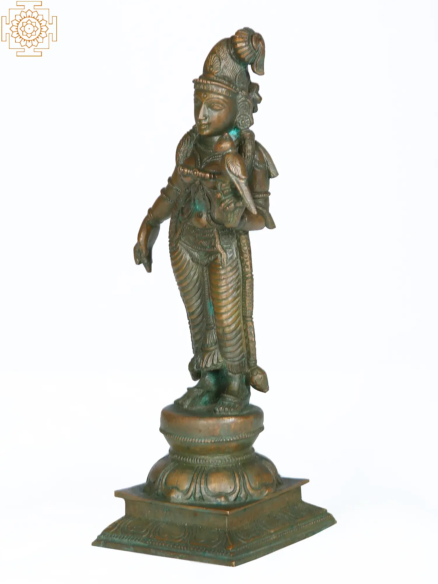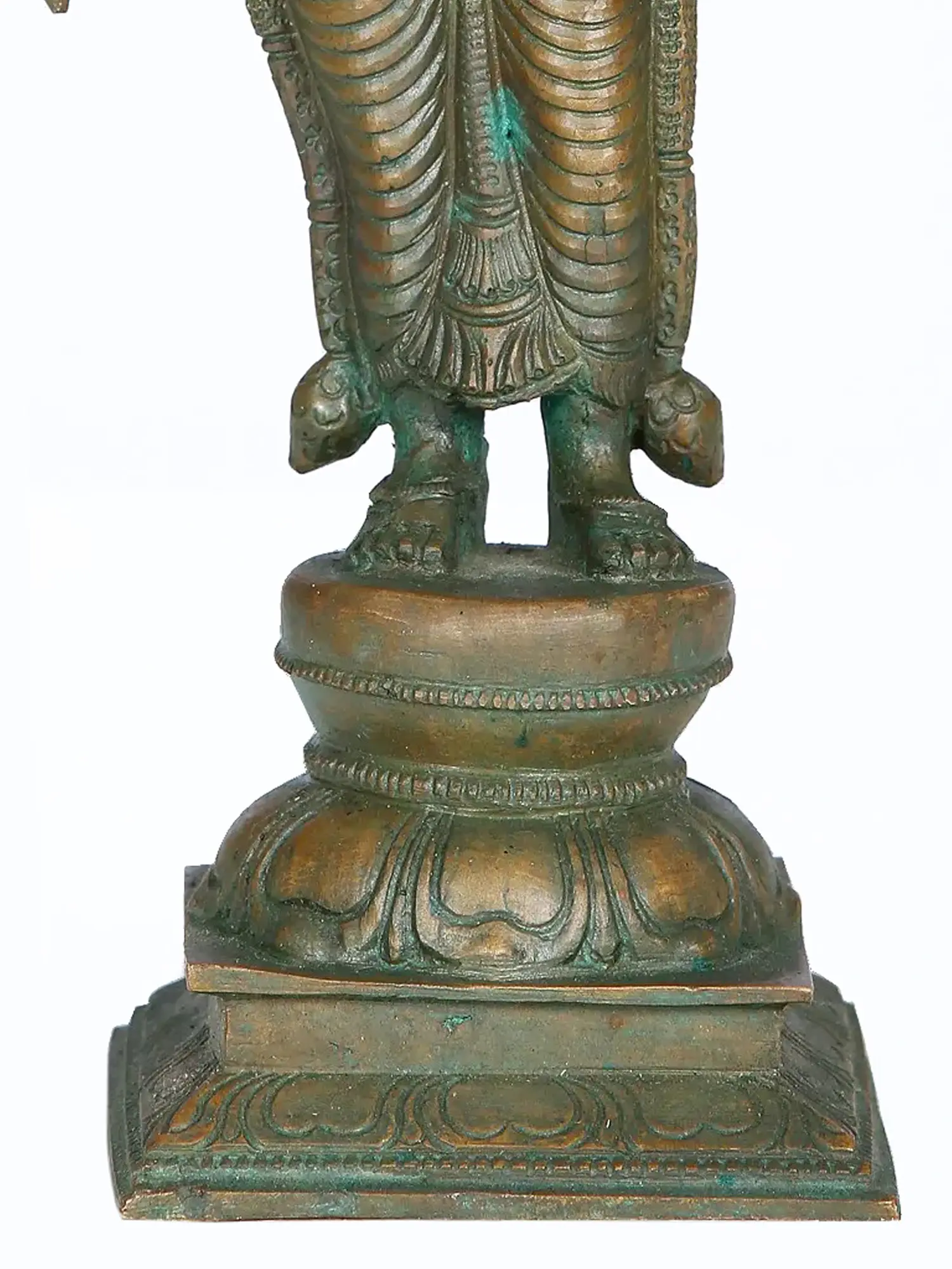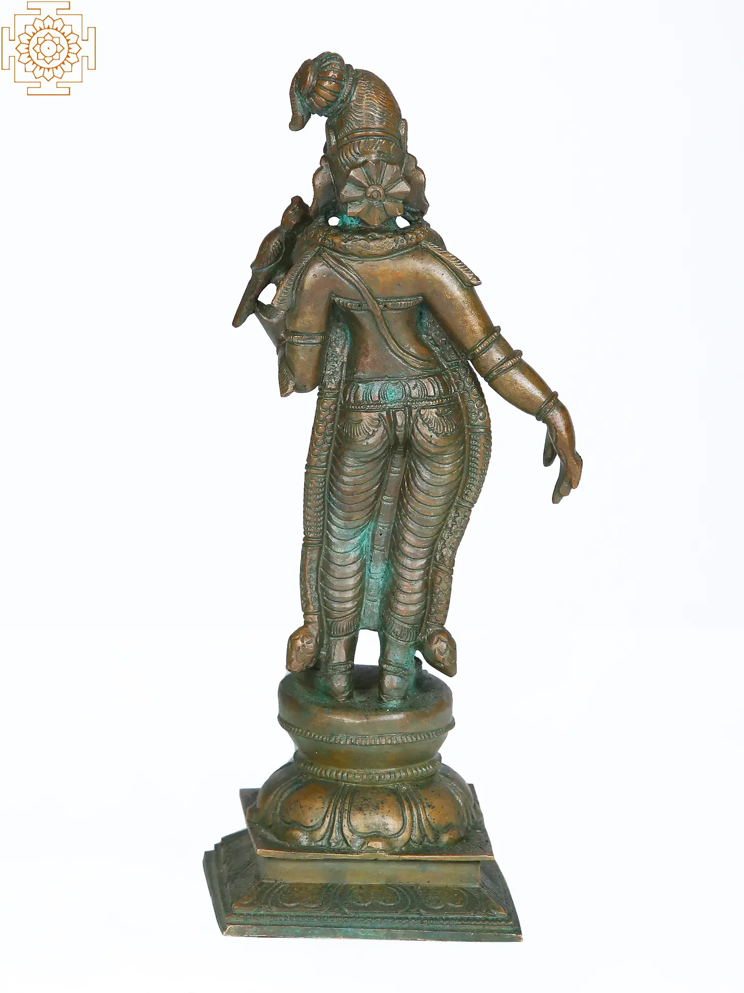 Goddess Andal, the singular female Alvar among South India’s twelve Hindu poet-saints, is venerated as an incarnation of Goddess Bhudevi. Affiliated with the Sri Vaishnava tradition, Devi Andal penned two seminal Tamil works - “Thiruppavai” and “Nachiar Tirumozhi”, recited during the revered Margazhi festival. Revered in a Tribhanga posture on a lotus pedestal, she wears regal attire adorned with a floral garland and ornate jewelry. Holding a lotus with a perched parrot, Andal symbolizes grace, beauty, purity, prosperity, and devotion. Crafted using the ancient Madhuchista Vidhana (Lost-Wax) technique in Panchaloha bronze from Swamimalai, this mesmerizing creation encapsulates the essence of devotion and the auspicious connection between the divine and mortal realms.
