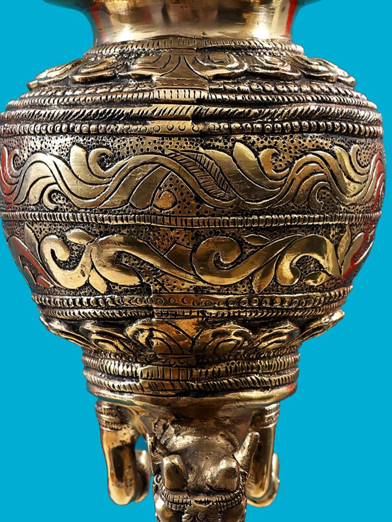 The artistry displayed in this handmade brass vase is truly remarkable. Each curve, each etched pattern, speaks of skilled craftsmanship passed down through generations. The rich, golden hue of the brass itself is considered auspicious in many Indian traditions, symbolizing purity, prosperity, and the divine light. The decorative motifs adorning the body of the vase are reminiscent of ancient Indian textile patterns and architectural carvings, adding layers of cultural and historical significance. These intricate designs are not merely ornamental; they often carry symbolic meanings, representing fertility, abundance, and the cyclical nature of the universe, aligning perfectly with the themes of creation and destruction inherent in Lord Shiva's cosmic dance. The flowing water or milk from the vase can be seen as a representation of the celestial Ganga, which flows from Shiva's matted locks, symbolizing purification and spiritual rejuvenation.
