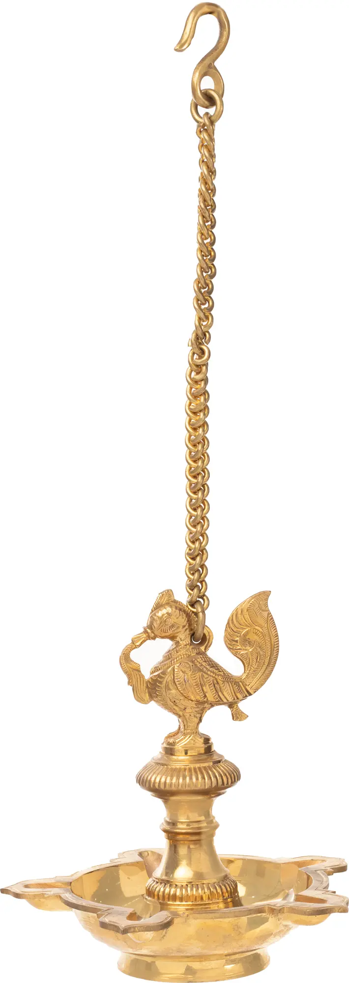 The roof-hanging lamps in Kerala are known as Koothu Villaku. This brass lamp is also a roof-hanging lamp and is lit during festivals. It has five wicks and a graceful peacock motif as the crown image. The peacock is a symbol of growth and prosperity, and its presence atop a lamp signifies the role of this lamp in perpetuating the exact attributes. The lamps are made of high-quality brass, ensuring its presence for generations.