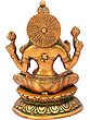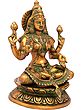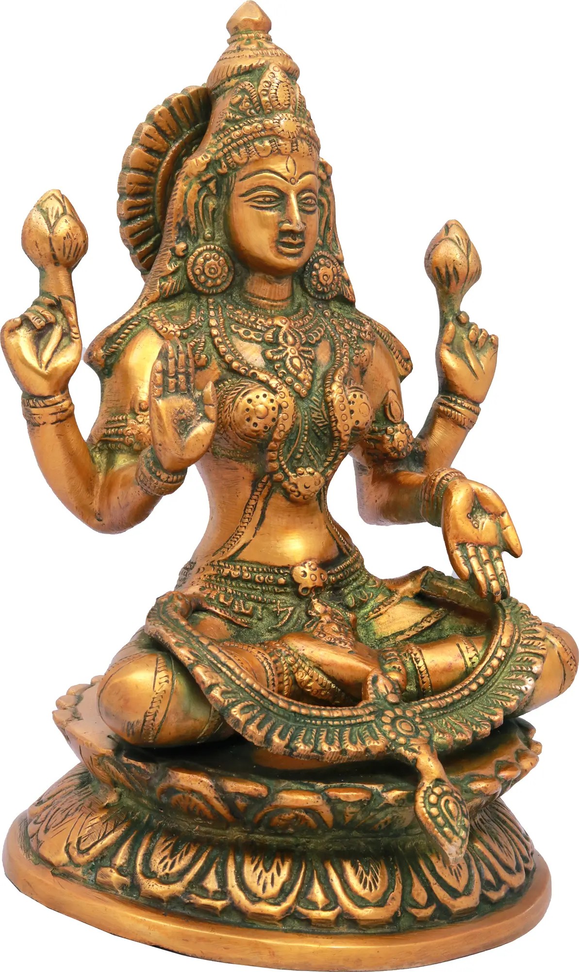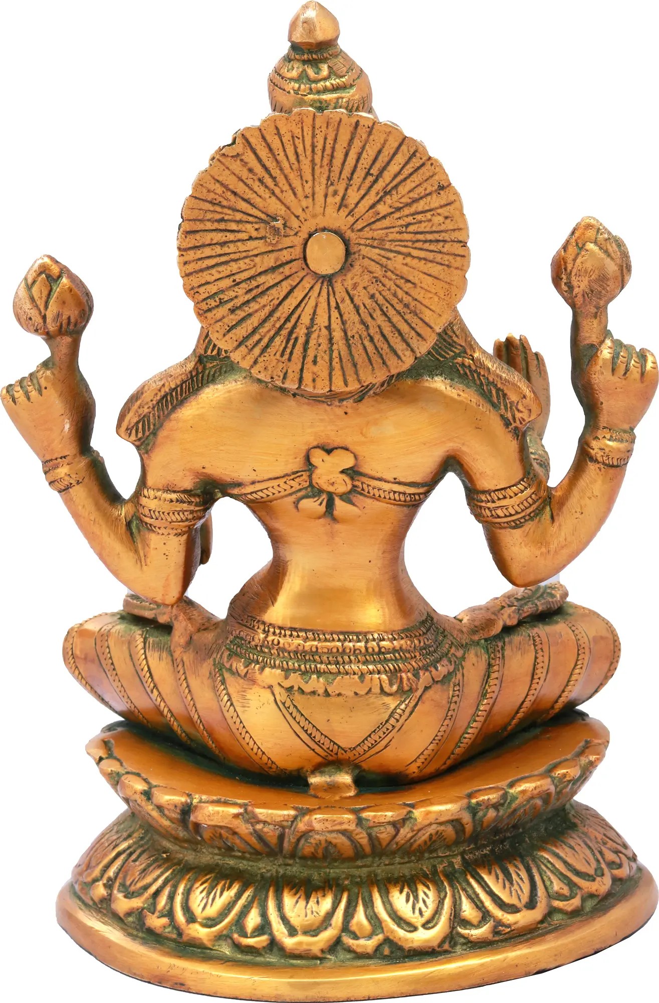 Her four arms signify her power, to bestow upon her devotees, the four purusharthas: Dharma, Artha, Kama, and Moksha. In this beautiful golden brass statue the goddess is represented as sitting in Siddha Hastasana upon a circular lotus pedestal.