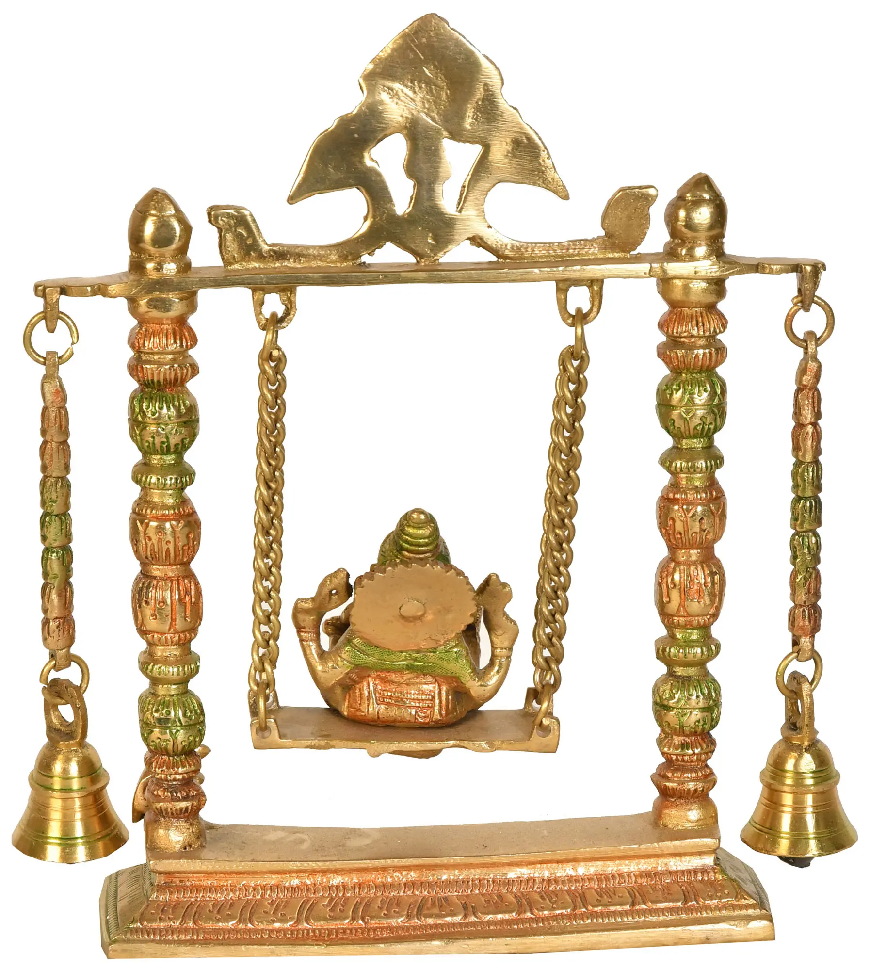 In this sacred swing crafted from brass, Lord Ganesha is embraced with divine elegance, bringing enchantment to your sacred space. The special allure of this swing lies in the melodious chimes emanating from the adorned bells on its sides. With a gentle sway, these sweet notes permeate the air, bestowing blessings and infusing your surroundings with a serene and sacred aura.