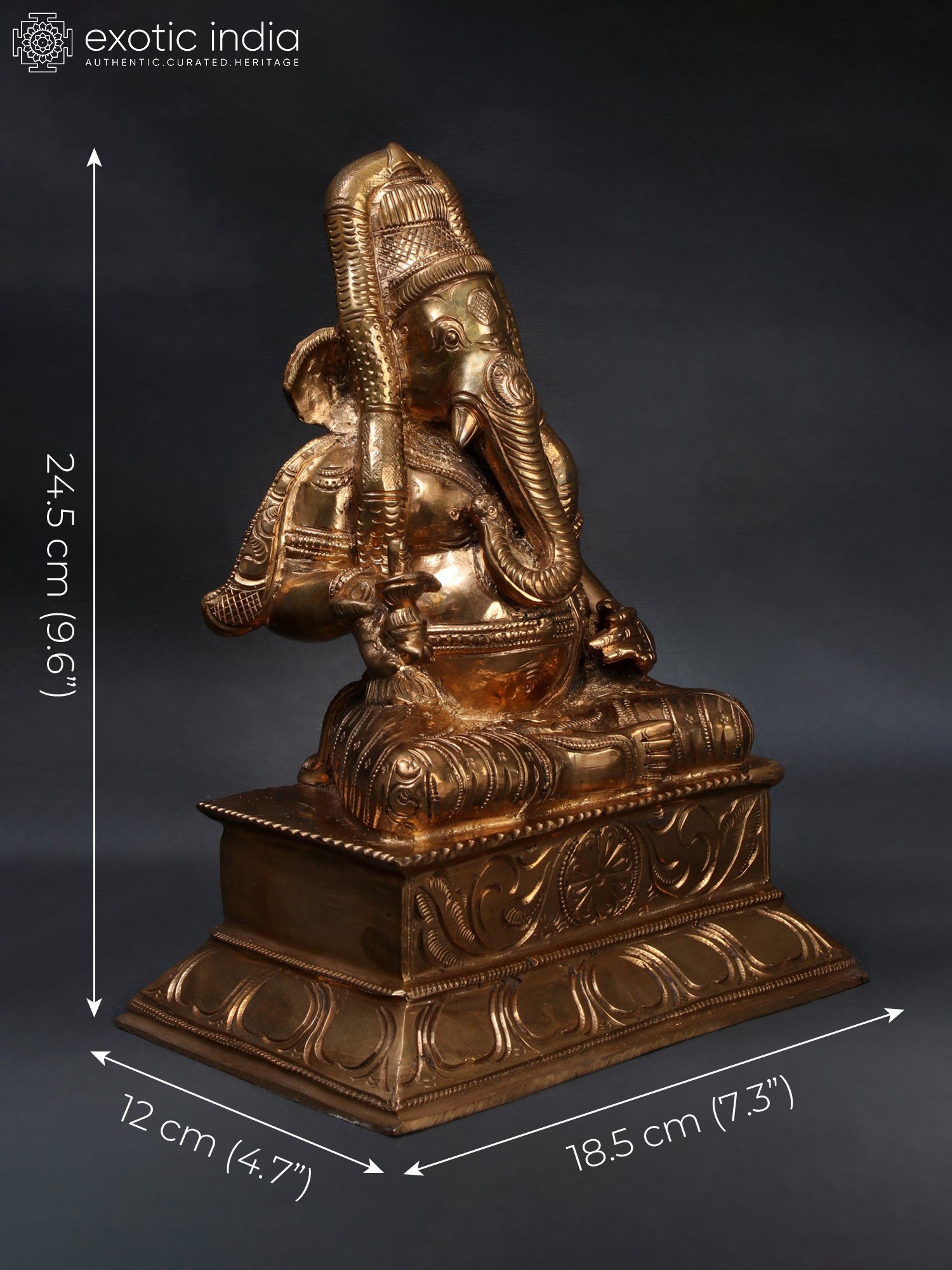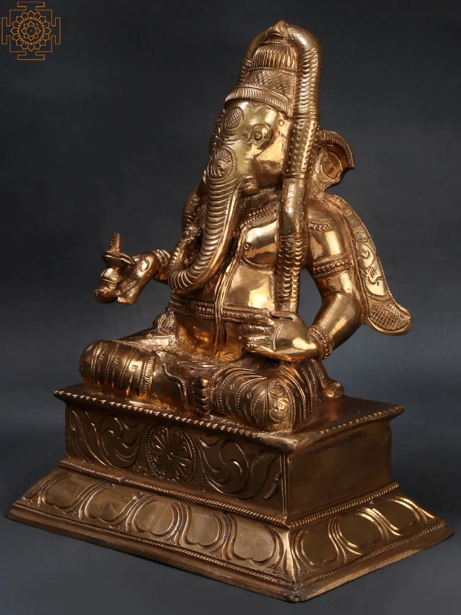 Made in Panchaloha bronze from Swamimalai, this stunning creation depicts Lord Ganesha (an elephant-headed deity) who is known as the god of obstacles, wisdom, and success. Handmade with care, this exquisite piece depicts Ganesha wearing a long South Indian garland, holding a Shivalinga in his hand. The statue depicts the relationship between the father and his son. Crafted using the Madhuchista Vidhana (Lost-Wax) technique, this statue is a true work of art and is a symbol of prosperity, good luck, and protection.