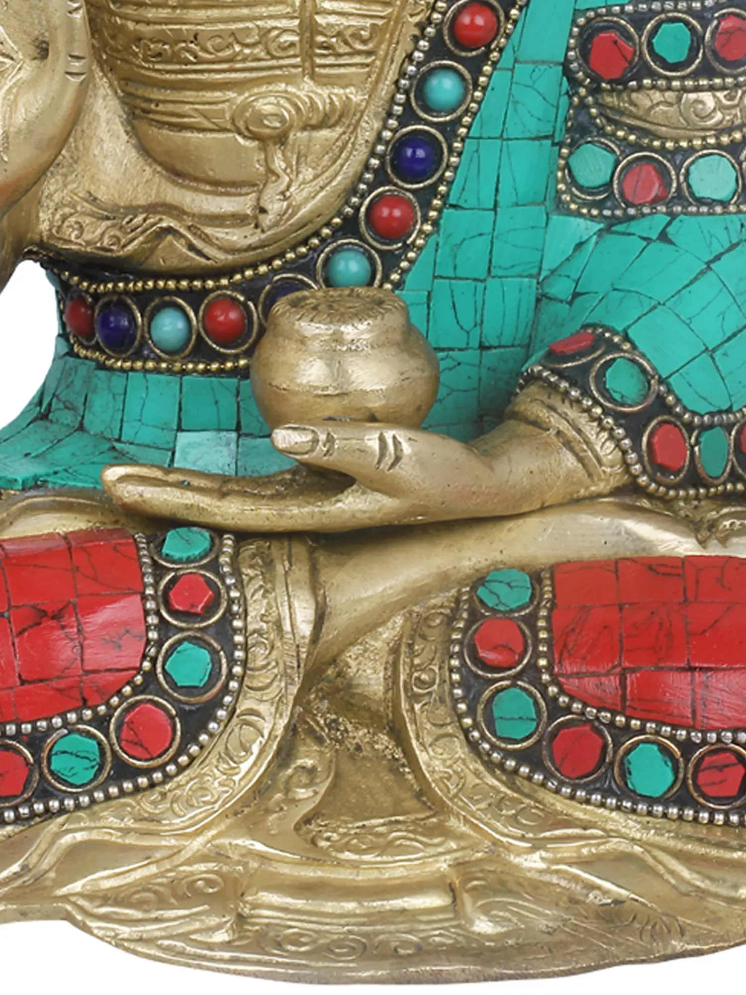 This exquisite brass statue captures the serene countenance of Gautama Buddha, the enlightened one, in a pose of profound meditation. Handcrafted in India with meticulous attention to detail, this piece embodies the spiritual essence and artistic heritage of Tibetan Buddhism. The warm luster of the brass is richly adorned with vibrant inlays of turquoise and coral, traditionally associated with healing, protection, and spiritual elevation in Buddhist iconography. The Buddha sits in the lotus posture, the universal symbol of spiritual, mental, and physical grace. His eyes are gently closed, inviting introspection and peace, while his urna, the dot between his eyebrows, signifies spiritual insight. The ushnisha, the cranial protuberance, represents his heightened consciousness and wisdom. His right hand is raised in the Abhaya Mudra, the gesture of fearlessness and protection, assuring devotees of his benevolent presence and offering solace from worldly anxieties. In his left hand, he cradles a small alms bowl, a humble reminder of his renunciation of worldly possessions and his dedication to the path of enlightenment. The robes of the Buddha are intricately decorated with a mosaic of red and turquoise stones, bordered by delicate brass filigree. These colors hold significant meaning; turquoise is often seen as a stone of the heavens, symbolizing wisdom and tranquility, while red coral represents vitality, passion, and life force. Together, they create a visually captivating representation of balance and harmony, reflecting the core tenets of Buddhist philosophy. The craftsmanship reflects the ancient tradition of Indian metalwork, where each piece is imbued with a sense of sacredness and artistic devotion. This statue is not merely an object of art but a focal point for meditation and a tangible connection to the teachings of the Buddha.