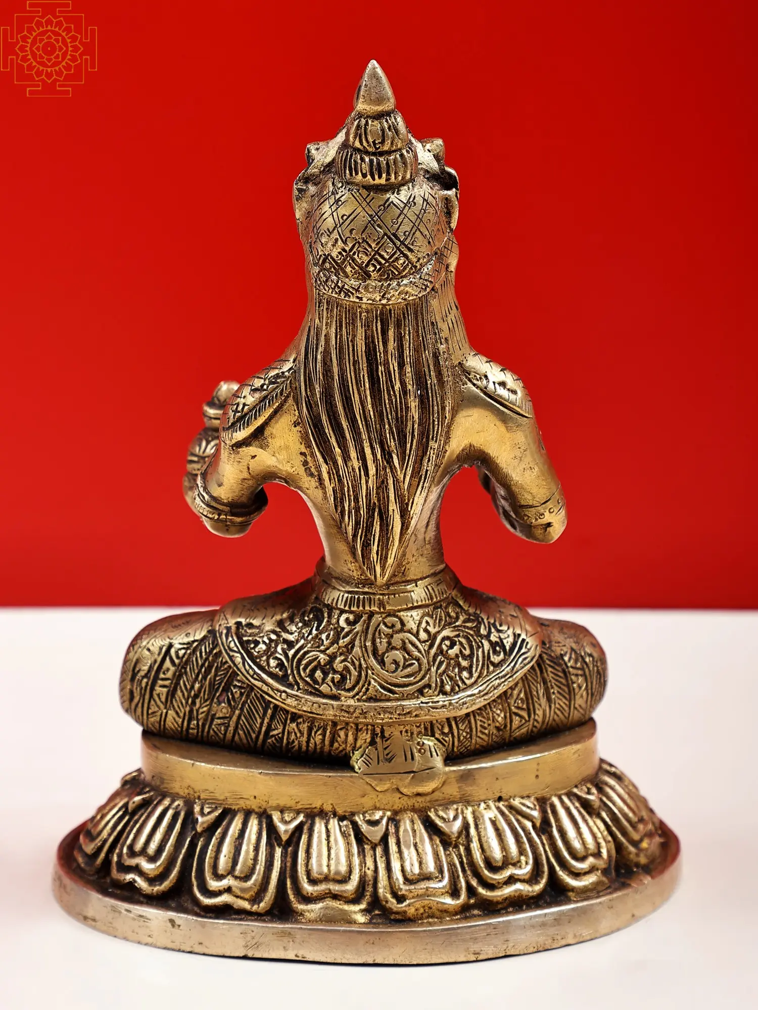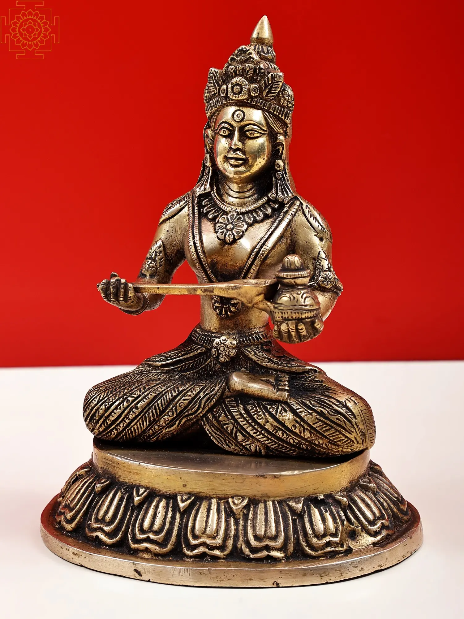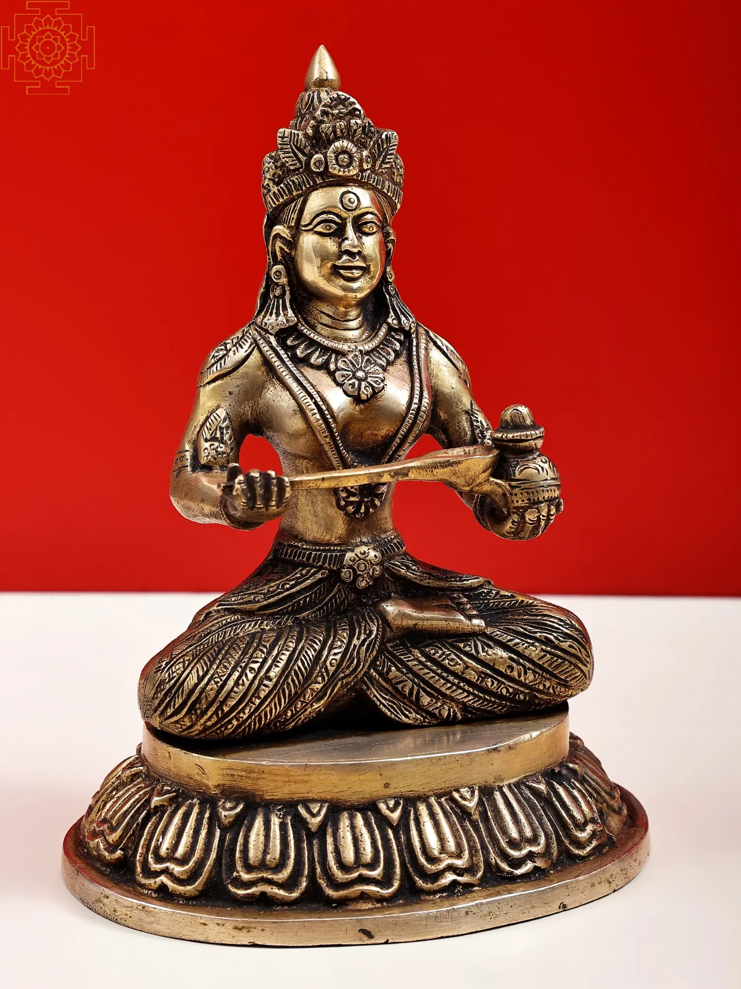 Worshipped mainly in Kashi, as an incarnation of Devi Parvati, goddess Annapurna in this brass statue is sculpted seated on a beautiful Kamalasana (lotus throne), wearing delicate ornaments and a dhoti whose folds are carefully delinated with fine incised lines.