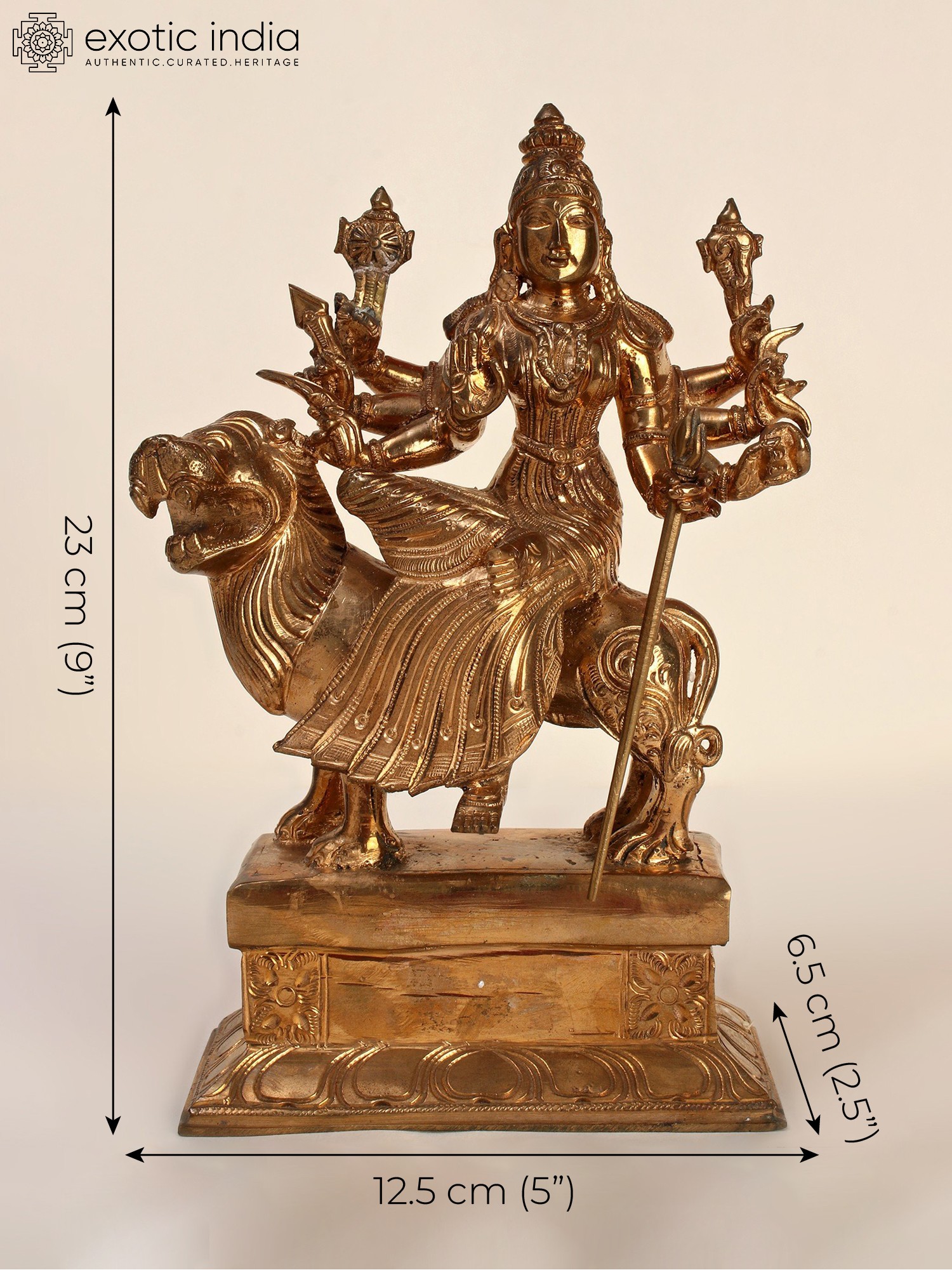 Maa Durga in this glistening bronze icon is regally seated on her Simha-vahana (lion mount) whose flowing mane and gaping mouth have been perfectly captured by the maker of this Panchaloha. Goddess Durga is in the posture of royal ease or Lalitasana, with her right leg placed in her lap and her left leg dangling, the sole refuge for those in pain and trouble. Devi in this bronze murti is in her Ashtabhuja or eight-armed form, which she takes to annihilate the forces of evil.