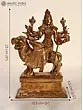 The magnificent bronze Maa Durga composition is positioned on a rectangular platform on which floral patterns are etched. With her left hand firmly holding her potent weapon- Trishula (trident) and her right hand raised to affirm fearlessness in her devotees, goddess Durga in this icon is the exemplary roopa of a mother as protectress and nurturer.
