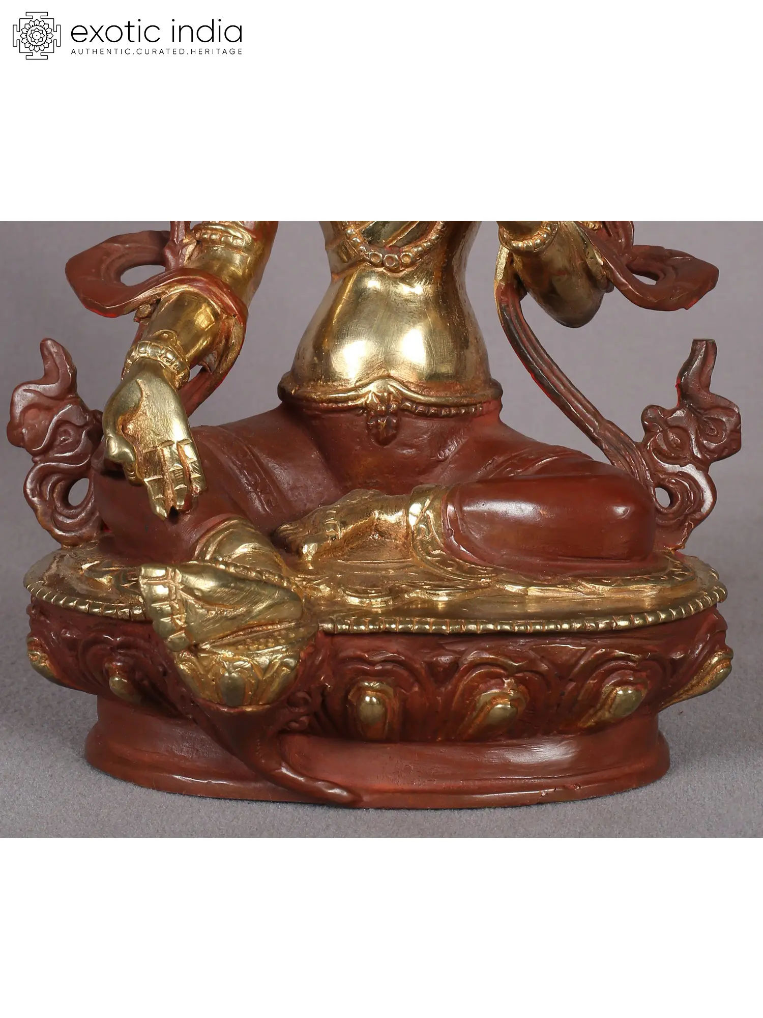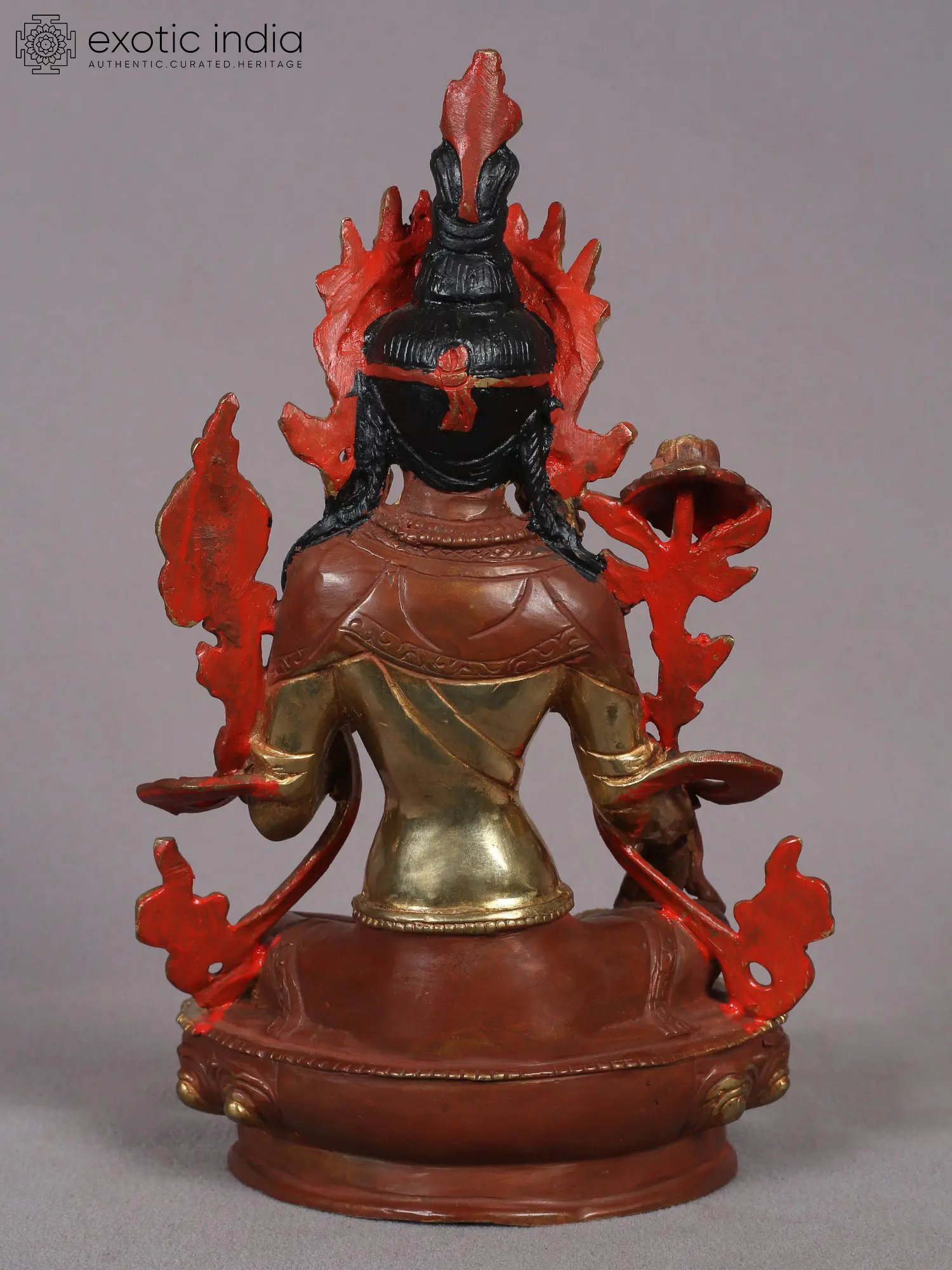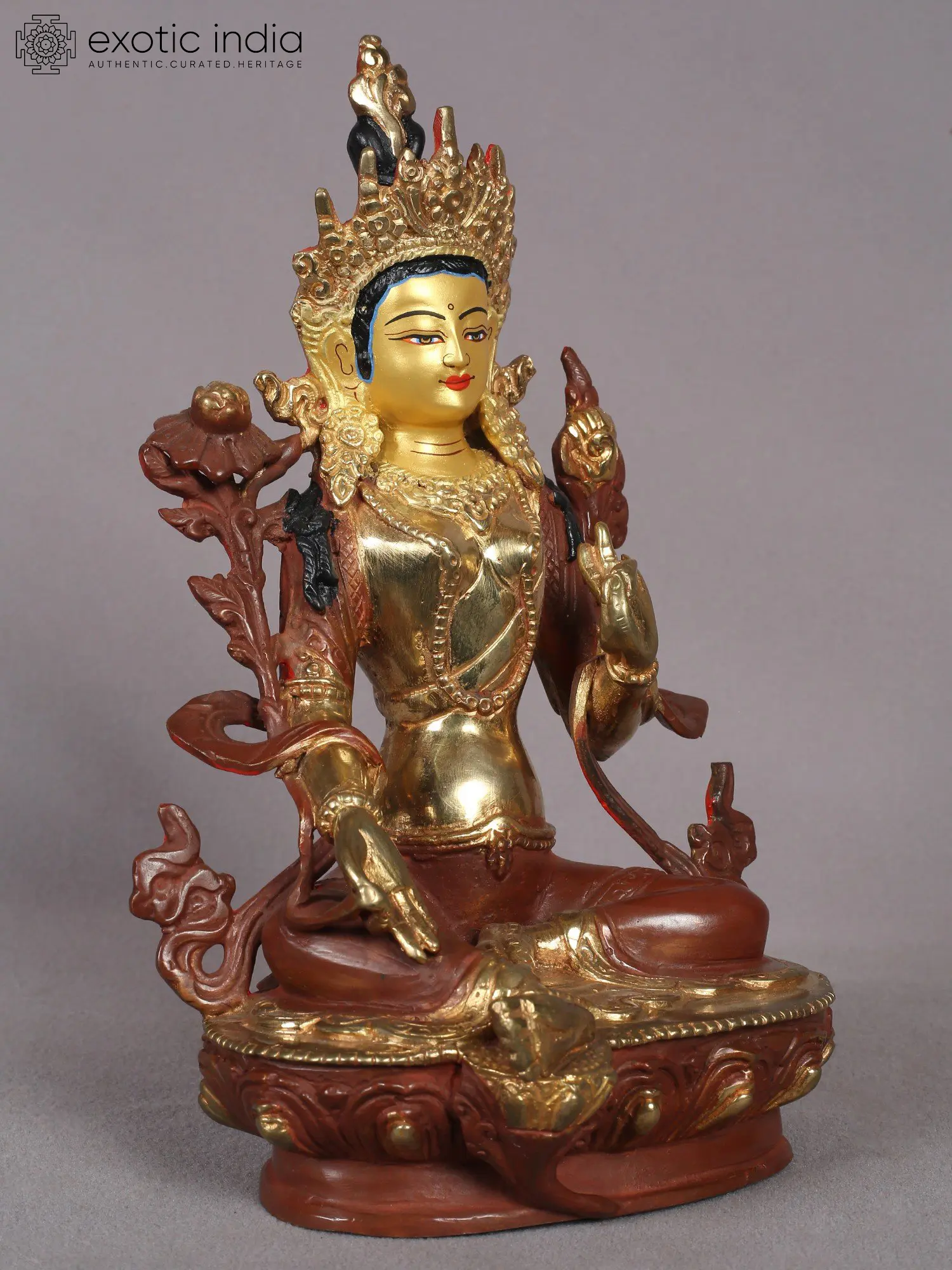 Green Tara's right hand can be seen in two variations: either extended across the knee or placed over the knee with the fingers pointing upwards, signifying a fearless gesture. This exquisite statue is crafted from copper and adorned with a gold-plated finish, adding to its elegance and significance in Buddhist symbolism.