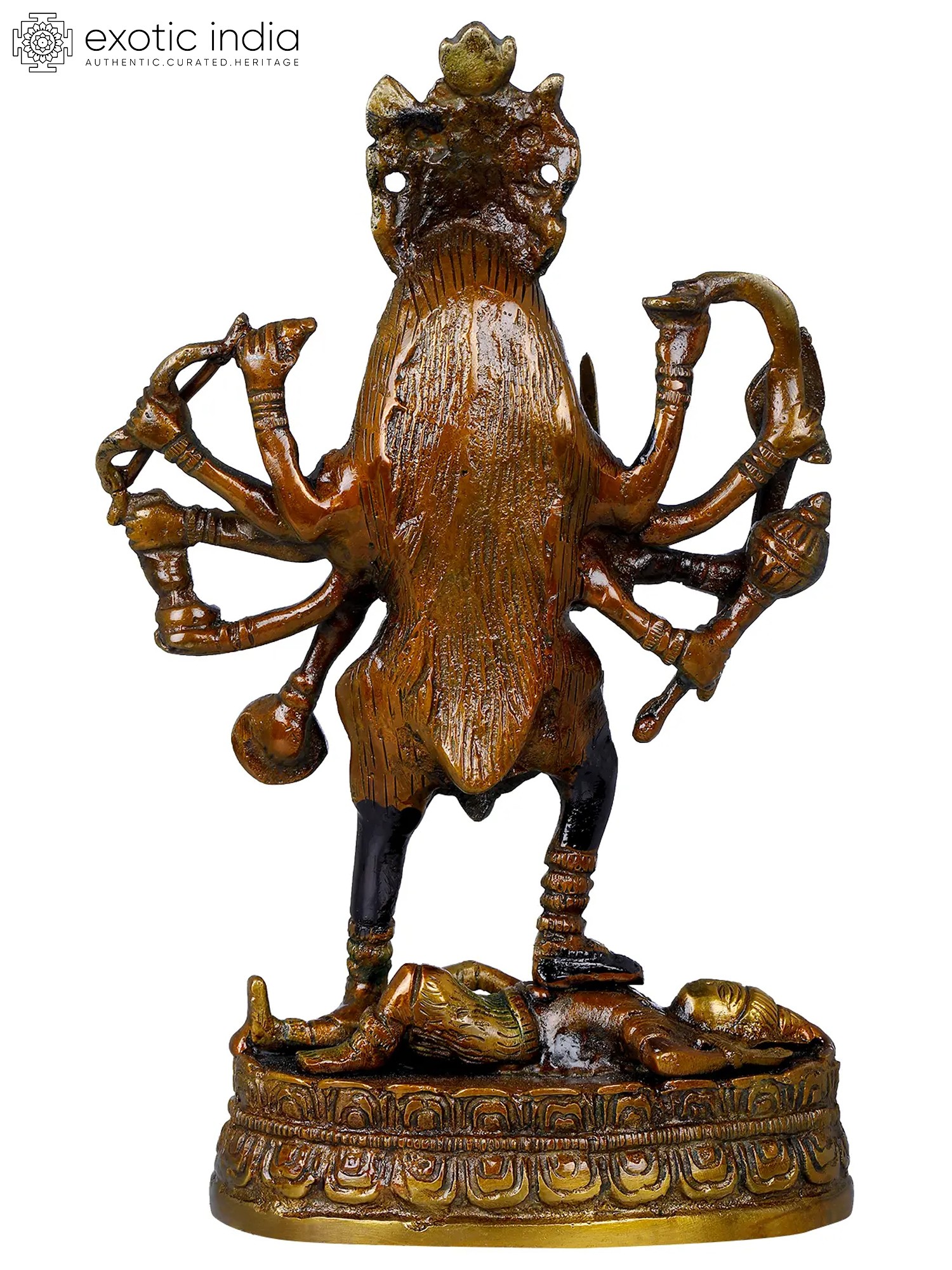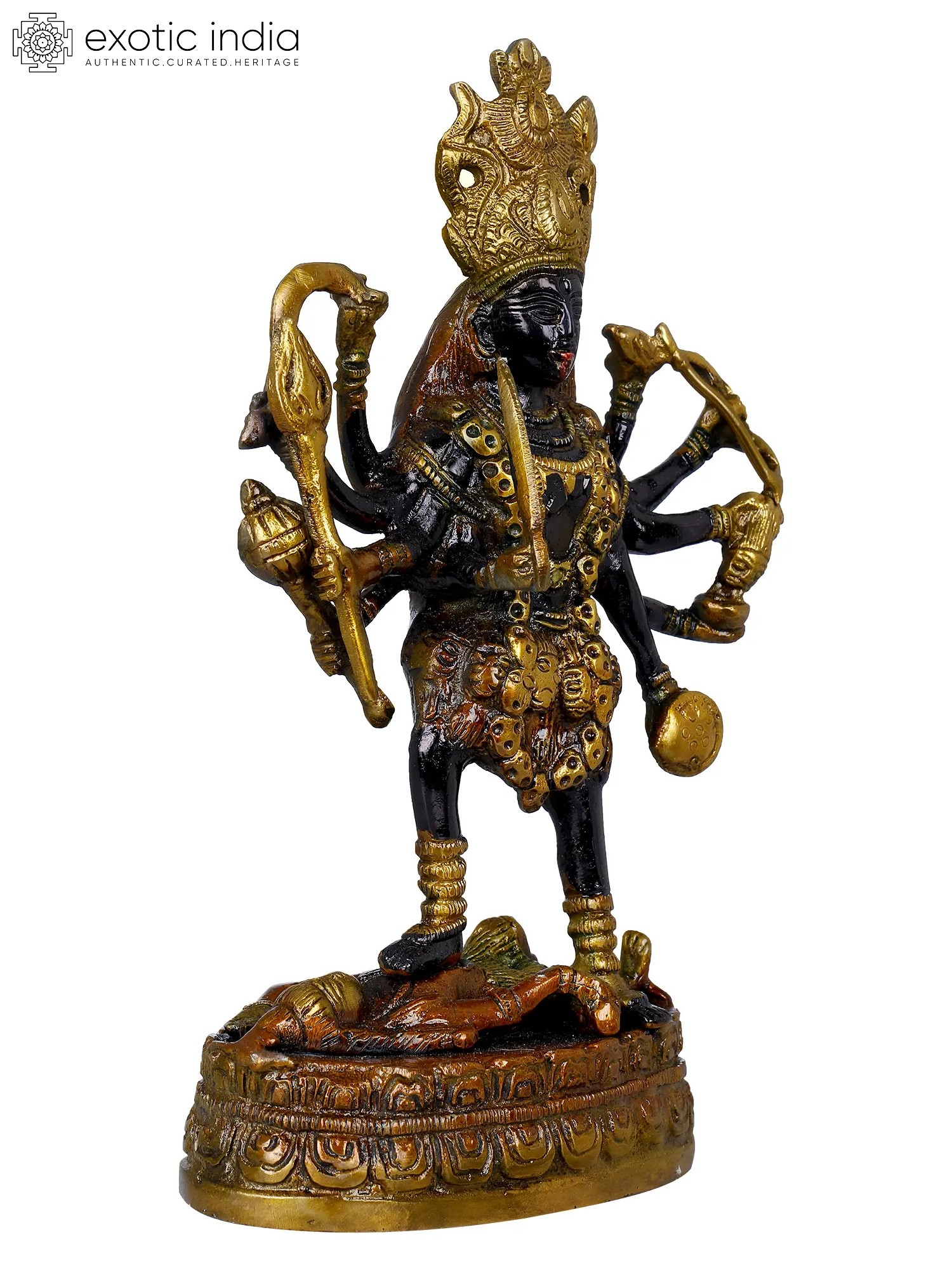 This brass statue depicts kali in her fierce form with the traces of Tantra clearly visible in her appearance. With her left leg placed on the chest of Lord Shiva, she looks fearless and vibrant with the energy she possesses. Holding various weapons in her hand, she has declared an open war against the forces of evil.