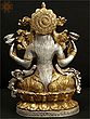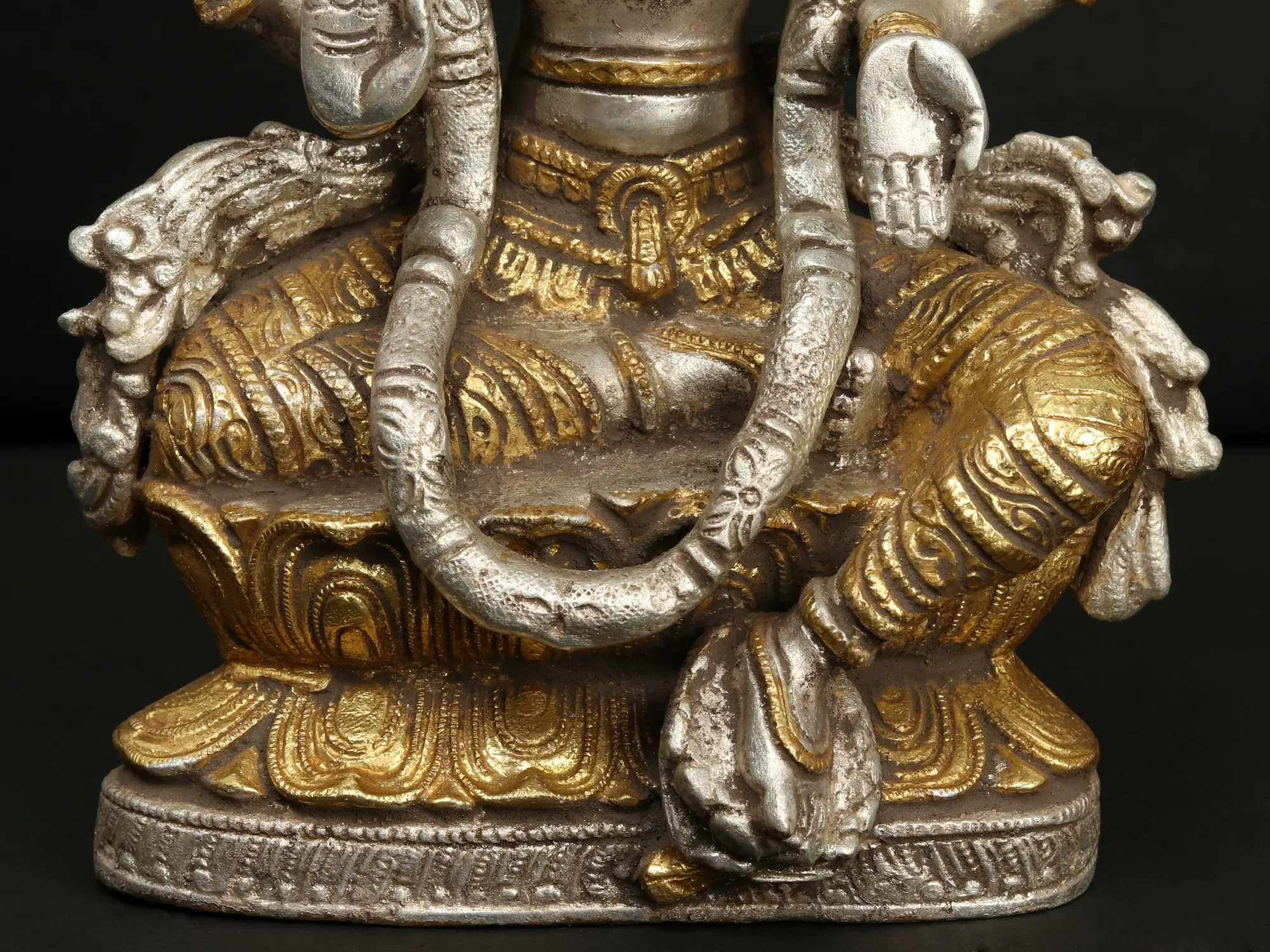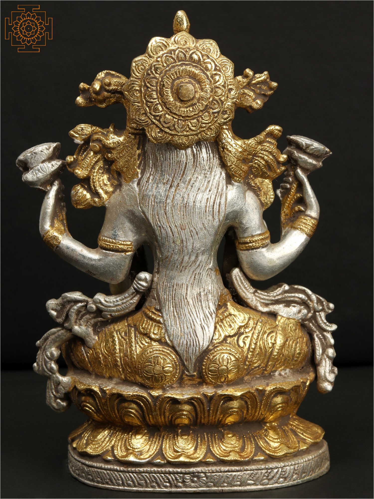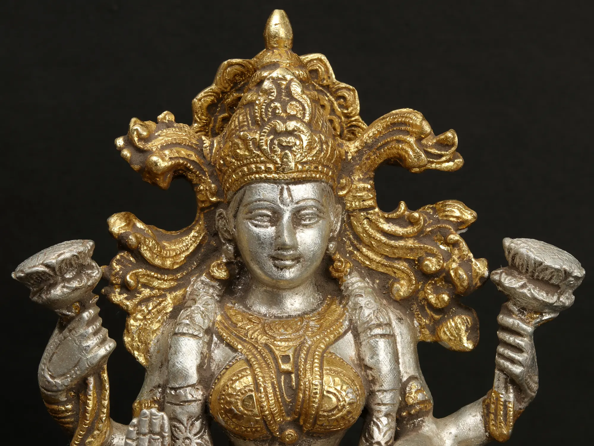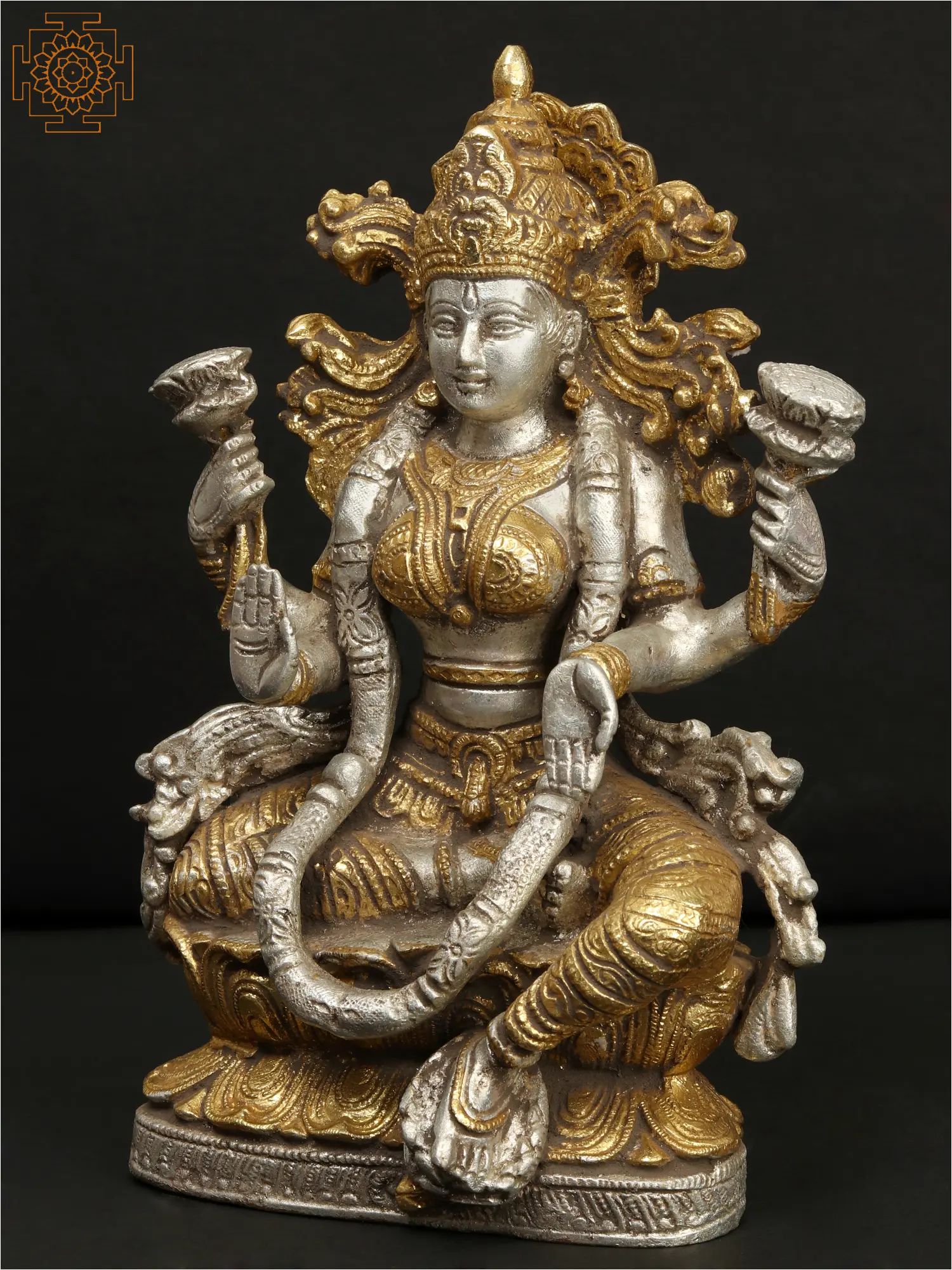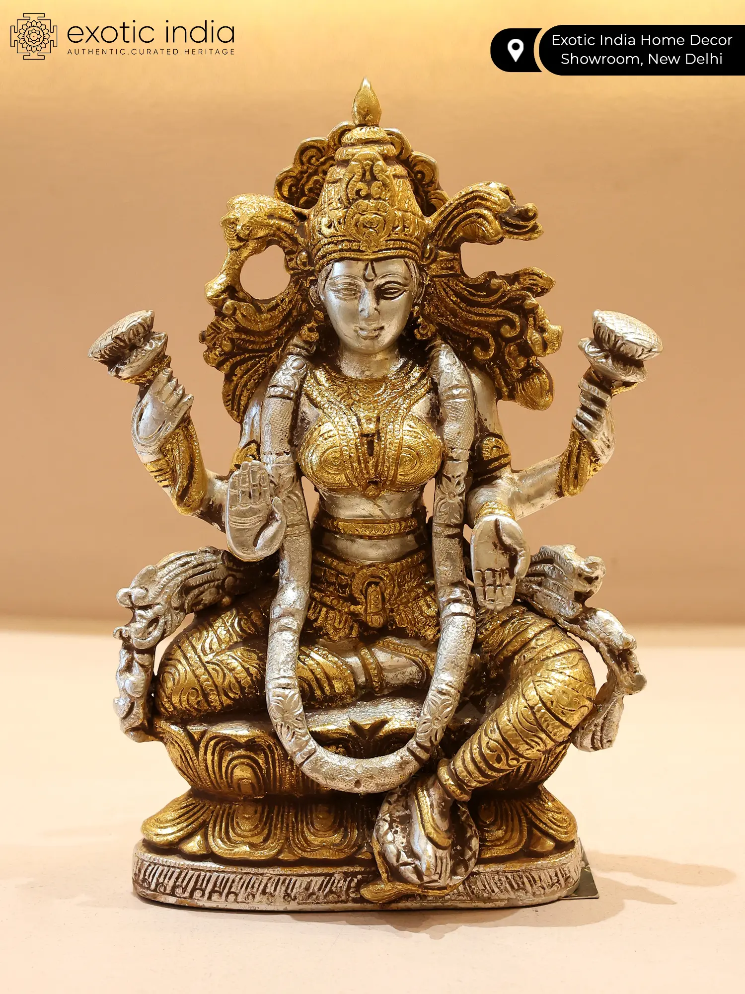 Goddess Lakshmi, also known as “PadmaSundari” (She who is as beautiful as a lotus) the embodiment of wealth and prosperity, graces us in her divine form. Seated gracefully on a blooming lotus in “Lalitasana”, she radiates celestial allure. Adorned with a garland of lotus flowers, she embodies purity, prosperity and abundance. The “Rajas Guna” courses through her, embodying desire and creativity, while the “Iccha Shakti”, the power of will, flows through her essence. Her left hand, poised in the “Varada Mudra”, bestows boundless blessings. Lotus blossoms, symbols of purity, grace her upper hands. Cloaked in regal splendour, bedecked in ornate jewels, and crowned majestically, she represents opulence and grandeur. This statue, carved in brass, is a timeless marvel that transcends mortal realms.