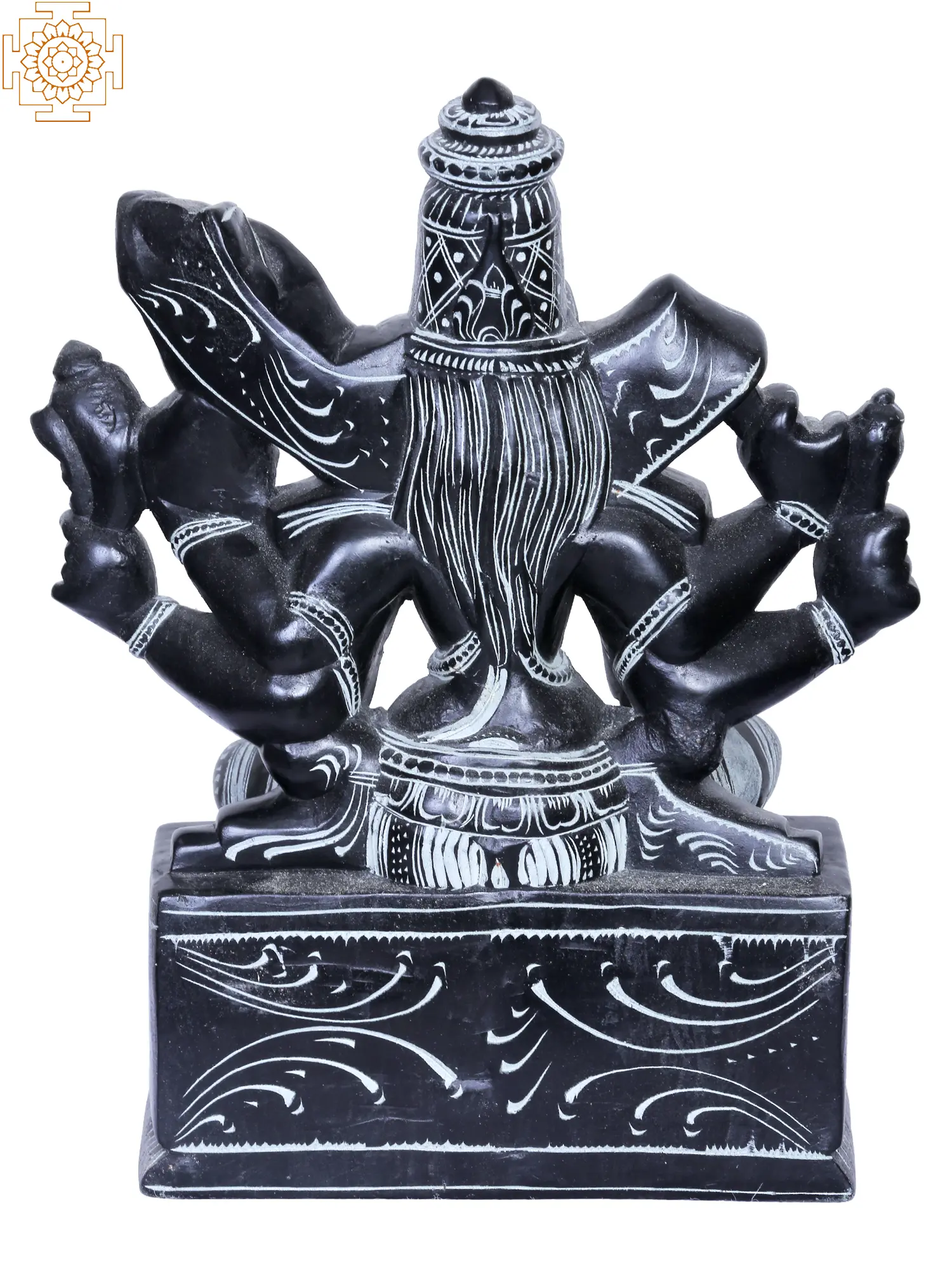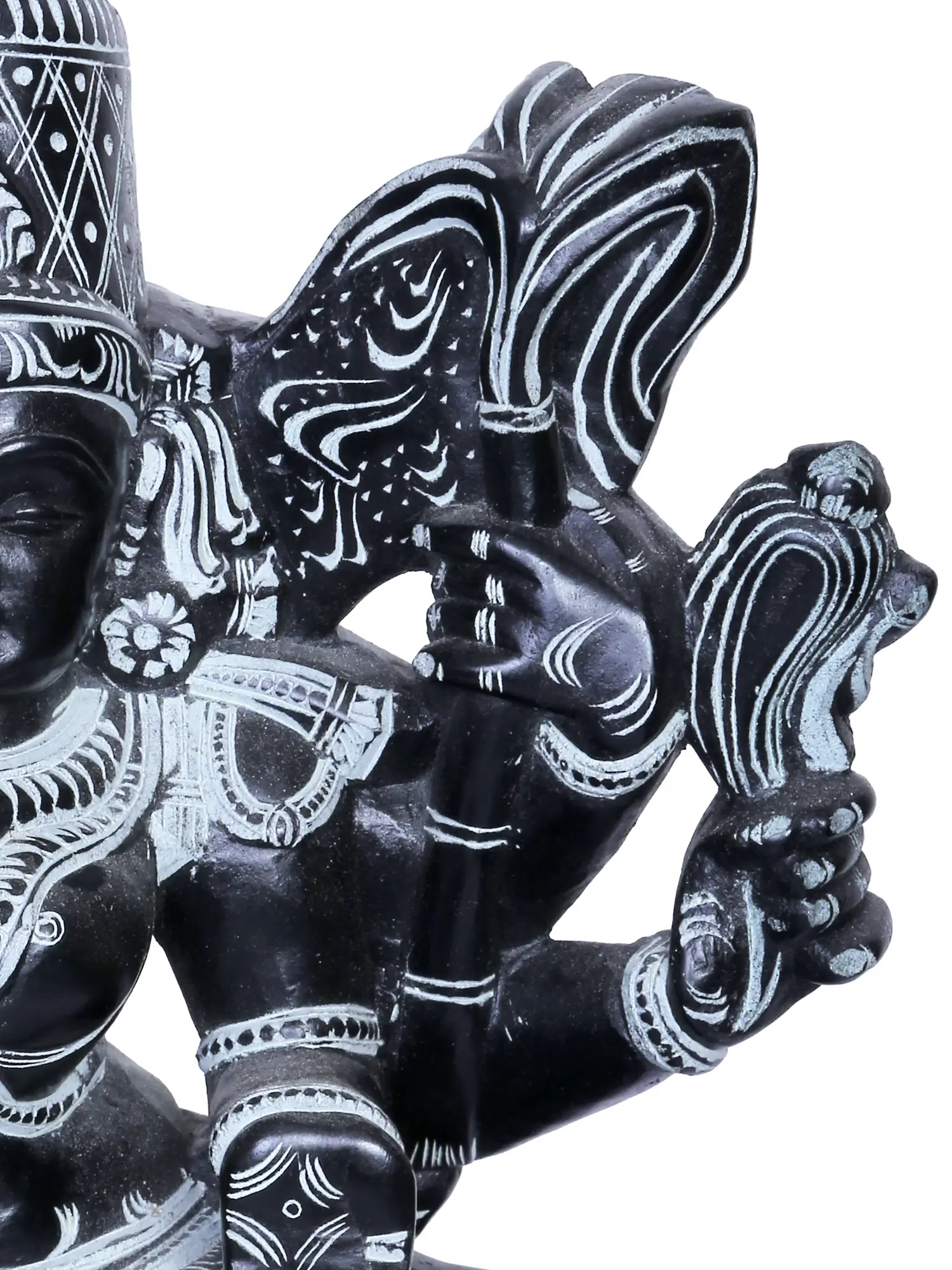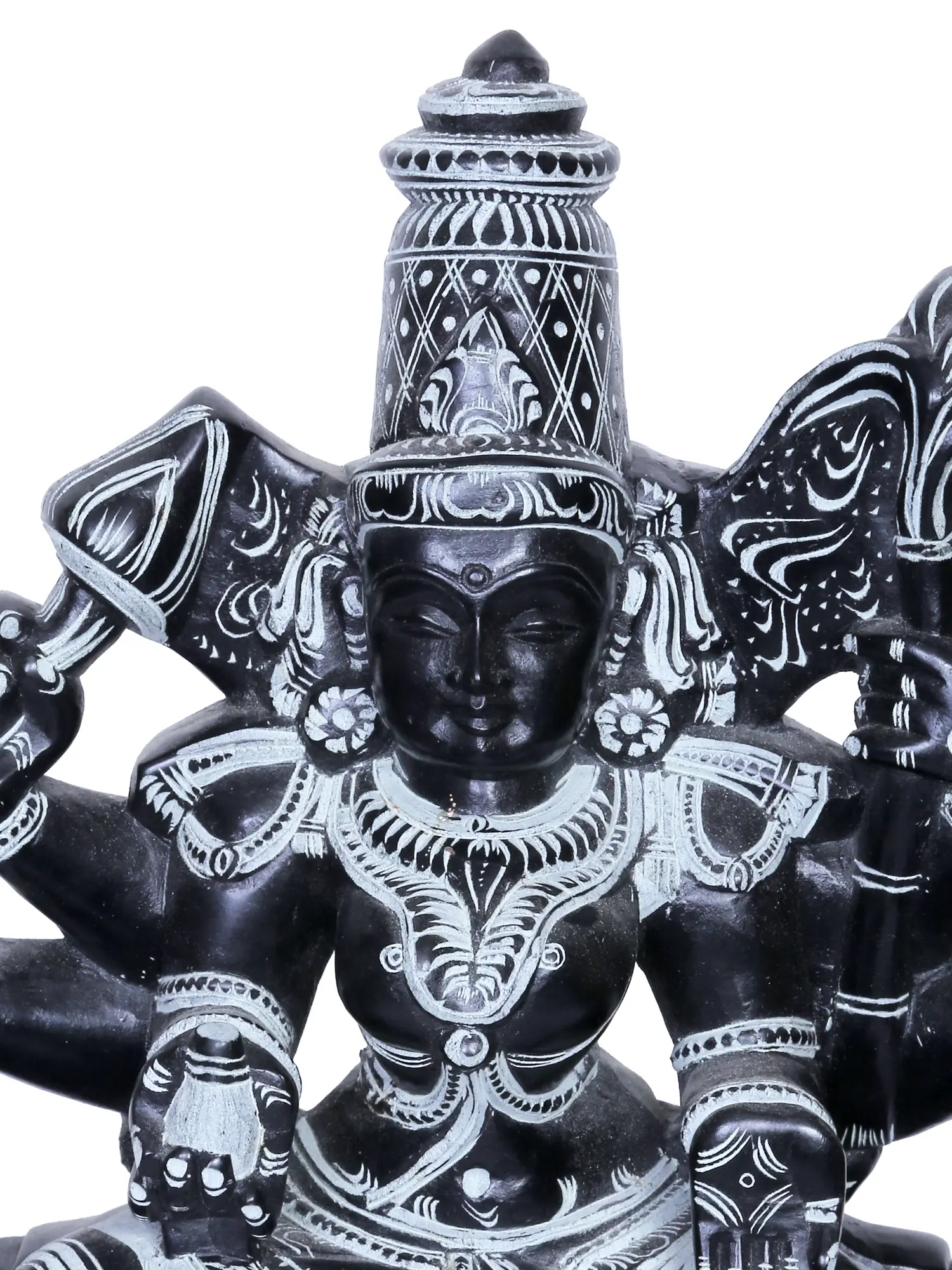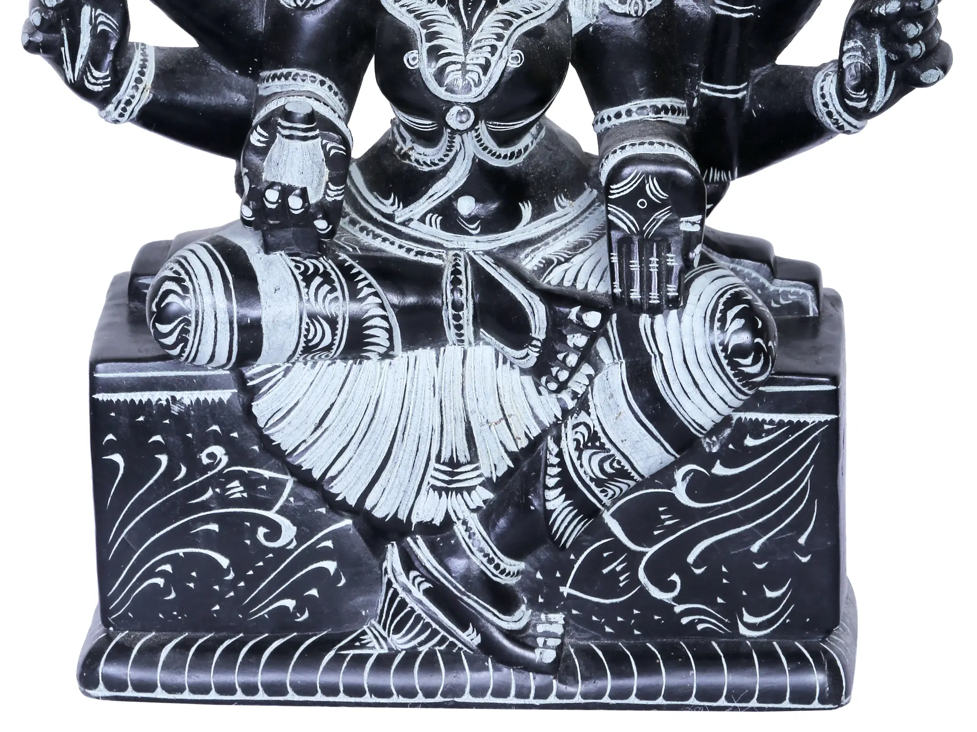 Hailing from the renowned stone carving traditions of Mahabalipuram, this statue is a testament to centuries of artistic heritage. The skilled artisans have meticulously sculpted the form from dark, resonant stone, imbuing it with a palpable spiritual aura. The intricate details, from the divine ornamentation adorning her body to the powerful stance, reflect a deep understanding of the iconographic traditions associated with the Goddess. The contrasting white accents highlight the masterful carving, making each fold of her garment and each expression of her divine visage stand out with remarkable clarity.