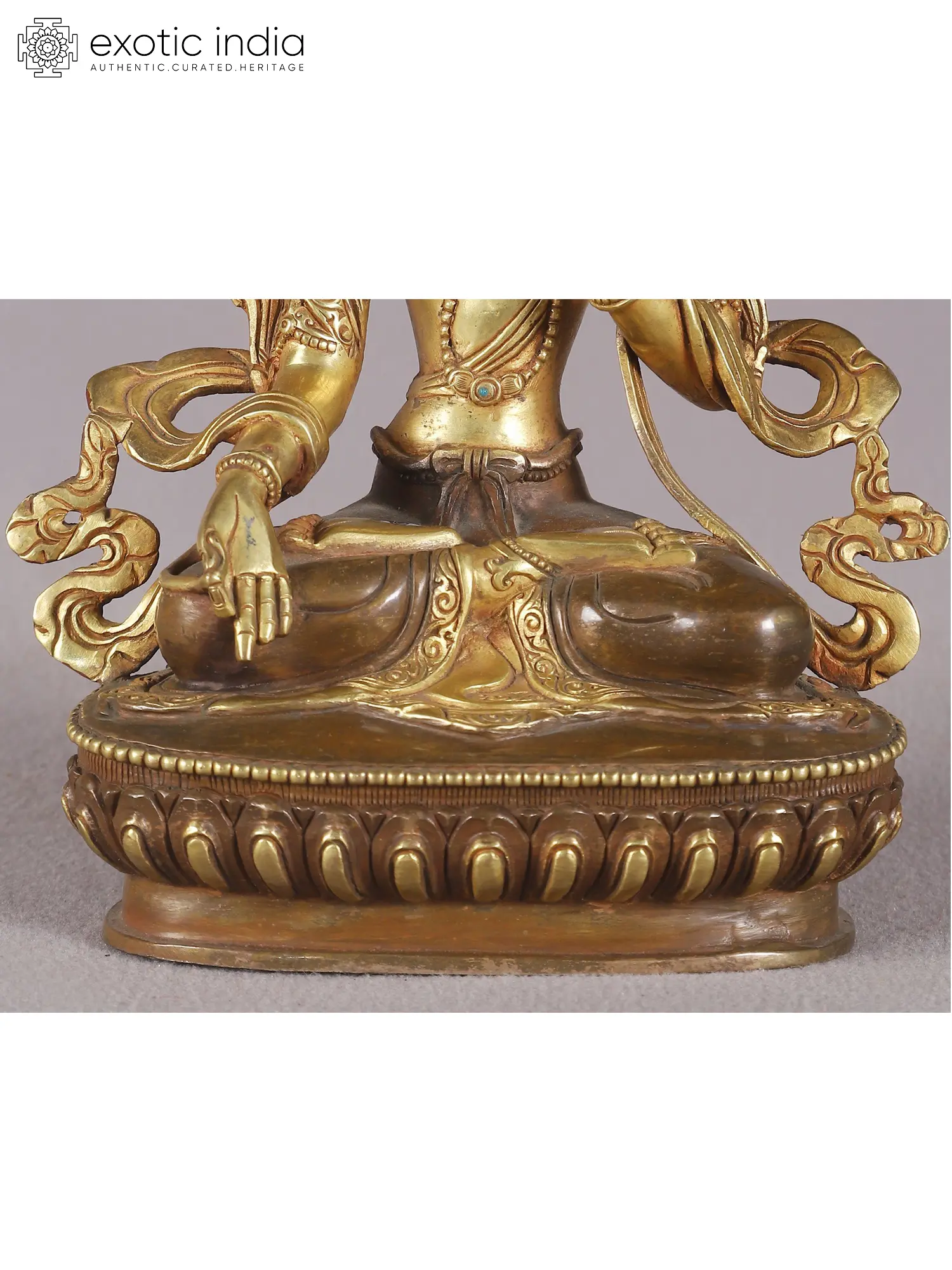 Now comes the most important part of Nepalese art which is gold gilding. This is done by the traditional fire gilding method. A mixture of mercury and 18K gold is applied on the surface of the statue and heat is applied using a flame torch. The result is that mercury evaporates along with impurities, leaving a pure 24K gold finish.