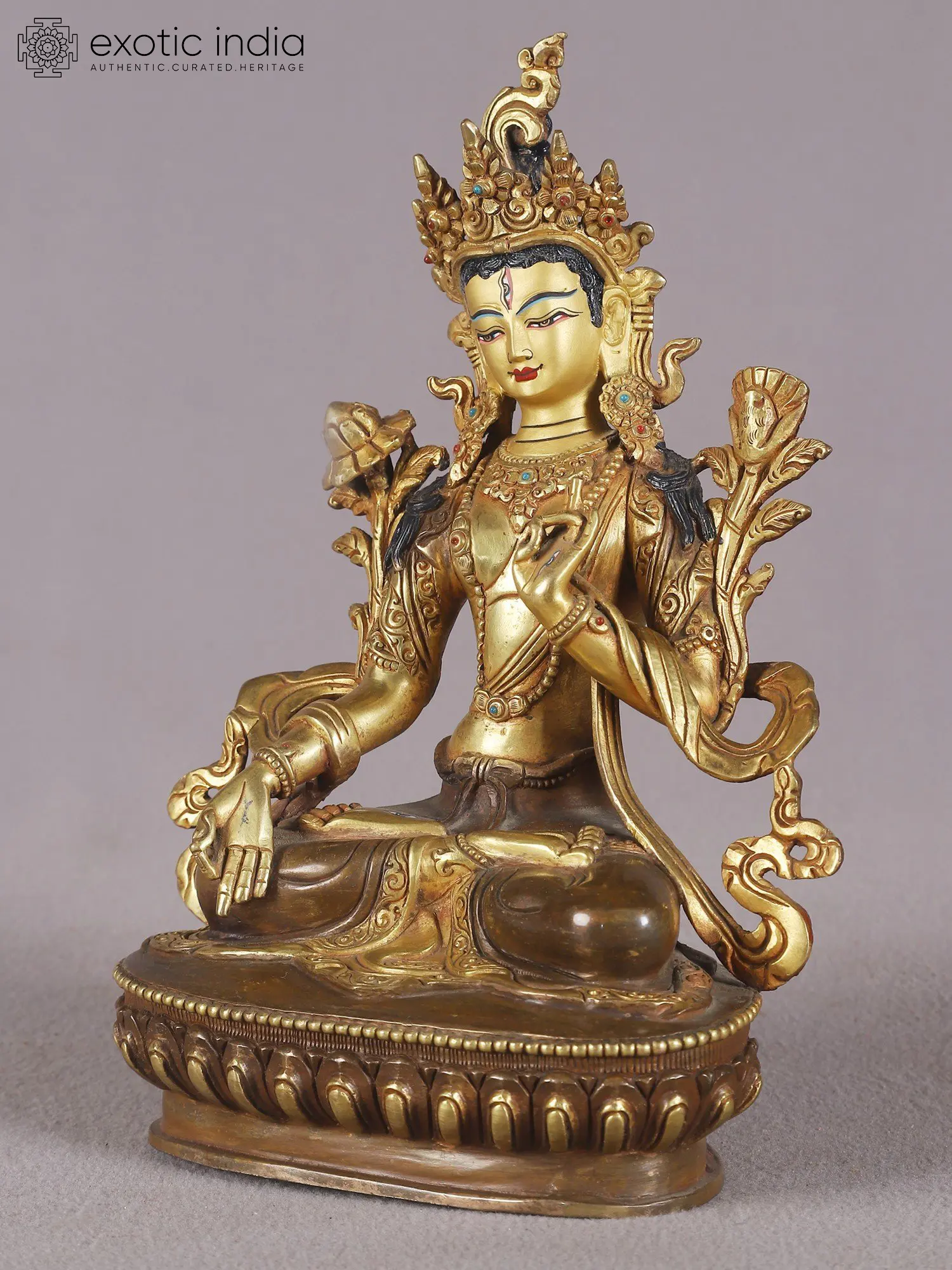 This exquisite idol depicts White Tara, one of the most revered goddesses in Tibetan Buddhism, embodying swift compassion, longevity, and enlightened activity. Crafted from copper and delicately gilded with gold, this 9-inch statue is a testament to the artisanal skill of Nepalese artisans, who have for centuries been renowned for their ability to imbue metal with spiritual essence. The serene countenance of the goddess, with her half-closed eyes radiating a tranquil gaze, invites contemplation and peace. Her youthful beauty is accentuated by the elaborate crown and ornaments that adorn her, each detail meticulously rendered to signify her celestial status. ––––––––––––––––––