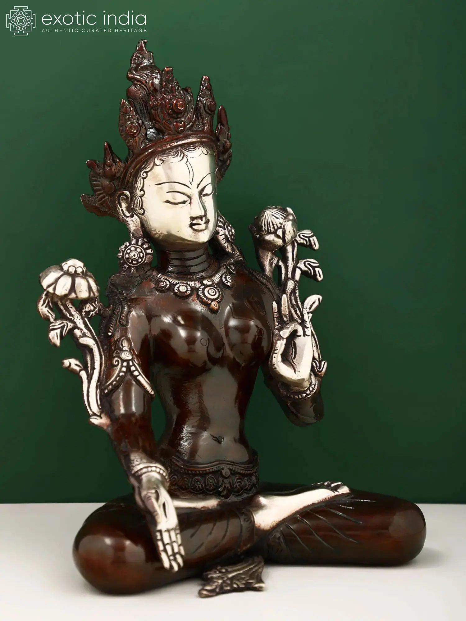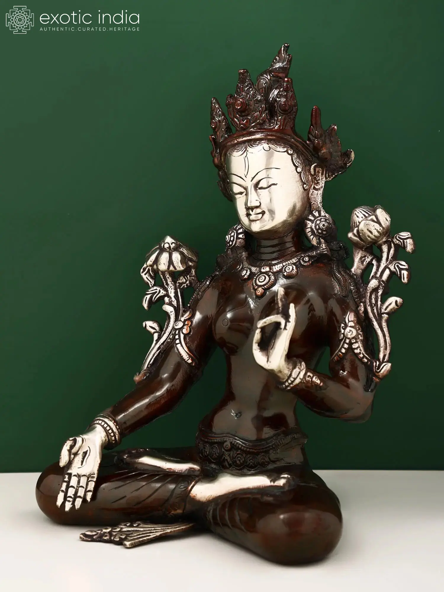 This 9-inch brass statue captures White Tara in a posture of serene contemplation and active compassion. Her peaceful countenance, with eyes gently closed in meditation, radiates an aura of profound calm. The delicate silver accents on her face, adornments, and hands provide a striking contrast to the deep, warm tones of the brass, highlighting her divine status. She holds lotuses in her upper arms, a common iconography signifying her connection to purity and enlightenment. Her right hand is raised in the gesture of *varada mudra*, the boon-granting gesture, offering blessings and protection, while her left hand rests in her lap, perhaps in *dhyana mudra*, the gesture of meditation, signifying inner peace and wisdom. The detailed headdress and jewelry further emphasize her regal and divine nature.