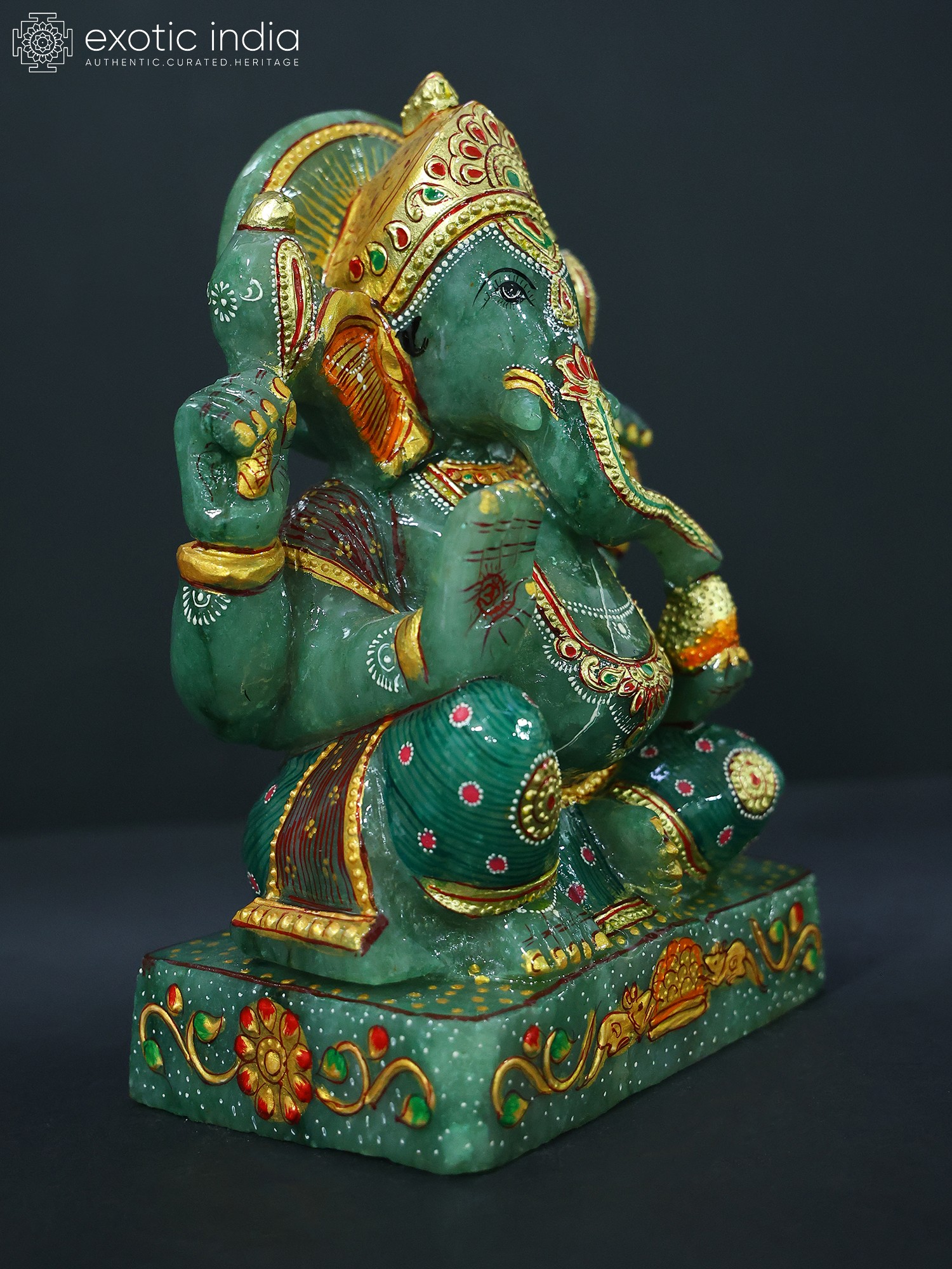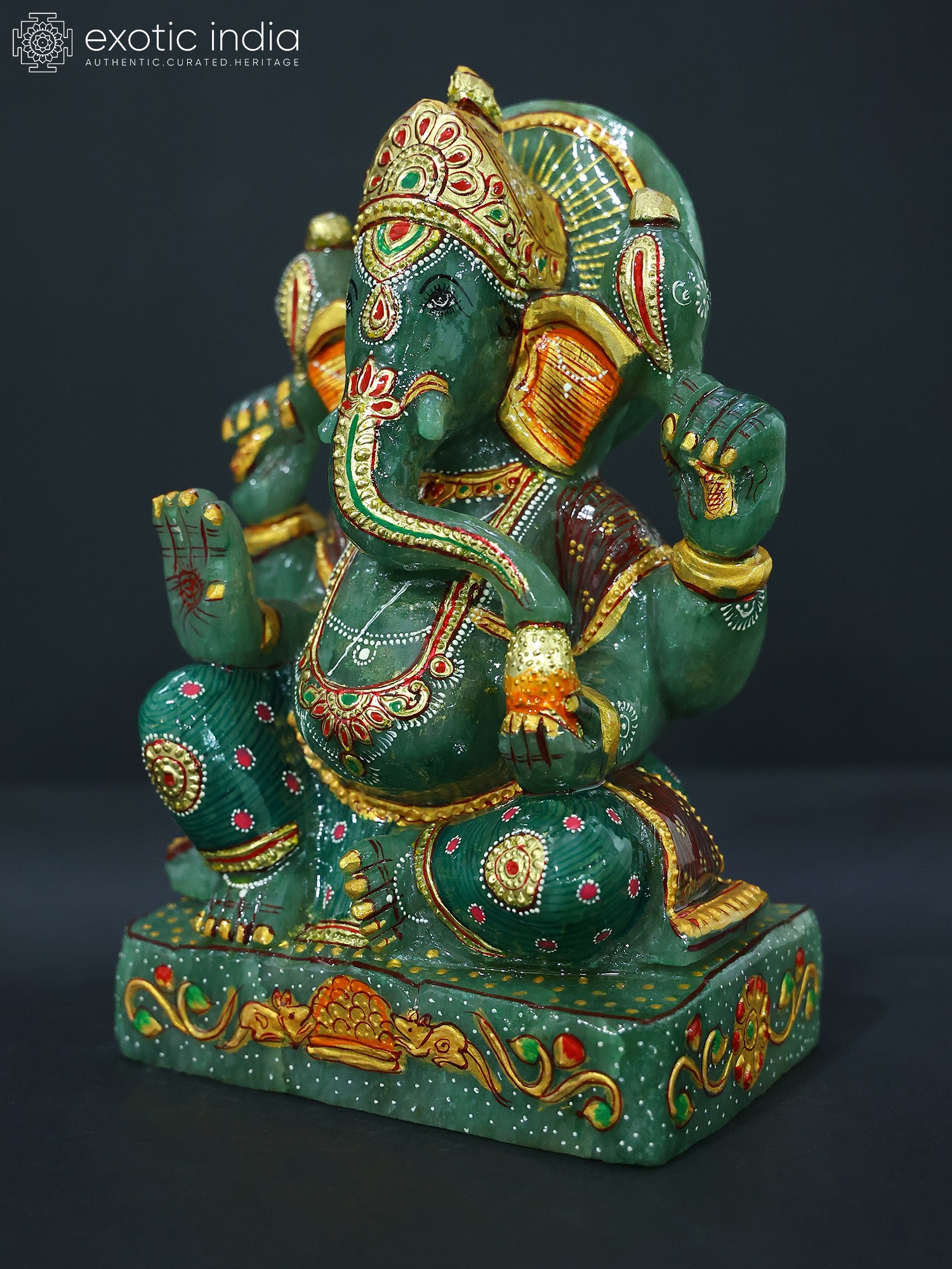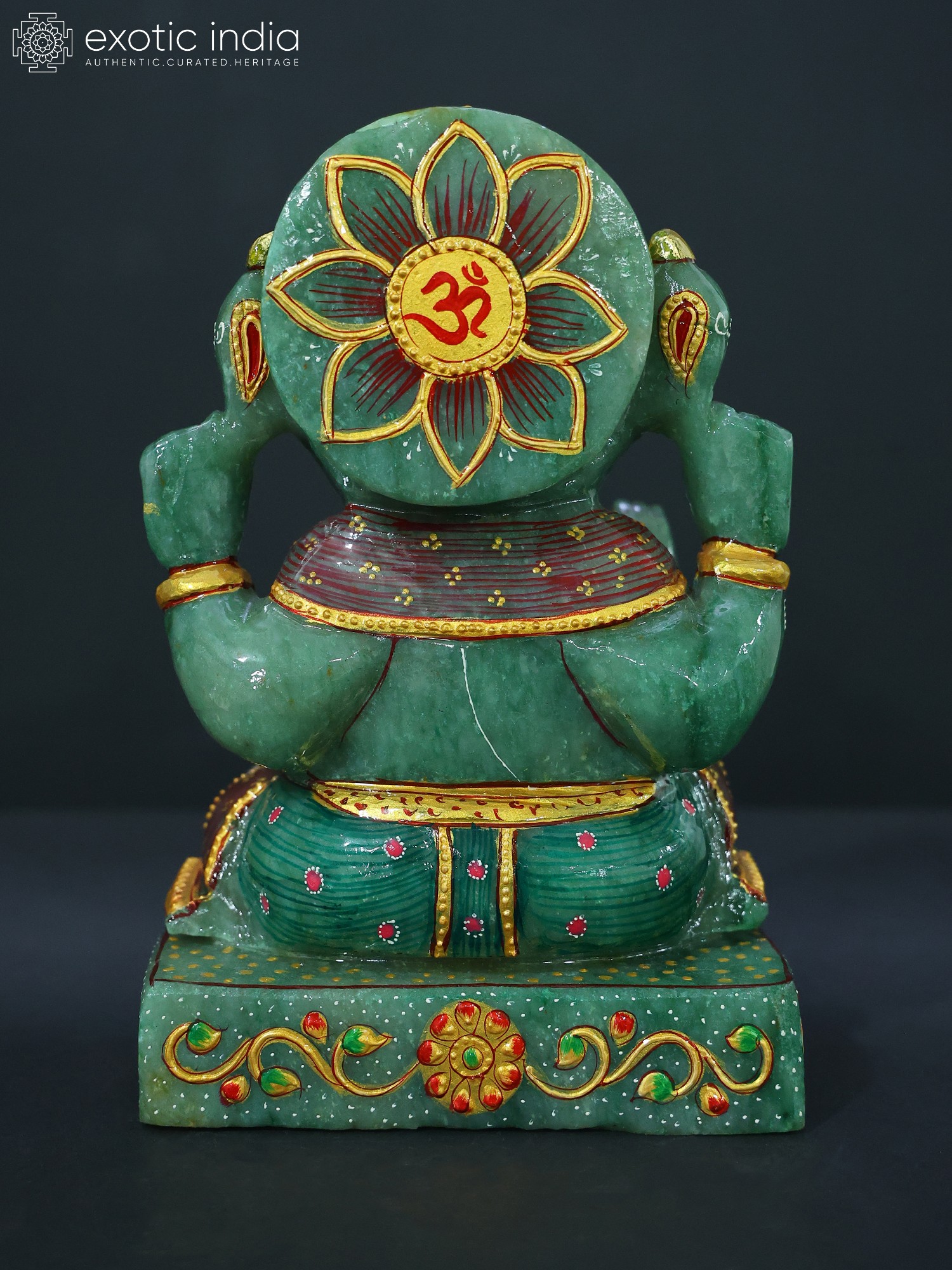 This exquisite sculpture captures the divine presence of Lord Ganesha, the remover of obstacles and the god of beginnings, rendered in the radiant and calming hue of green aventurine. This precious stone, often associated with growth, prosperity, and good fortune, imbues the deity with a palpable aura of serenity and abundance. The rich, deep green of the gemstone, interspersed with subtle inclusions that hint at its natural beauty, forms a captivating backdrop for the meticulously detailed craftsmanship.