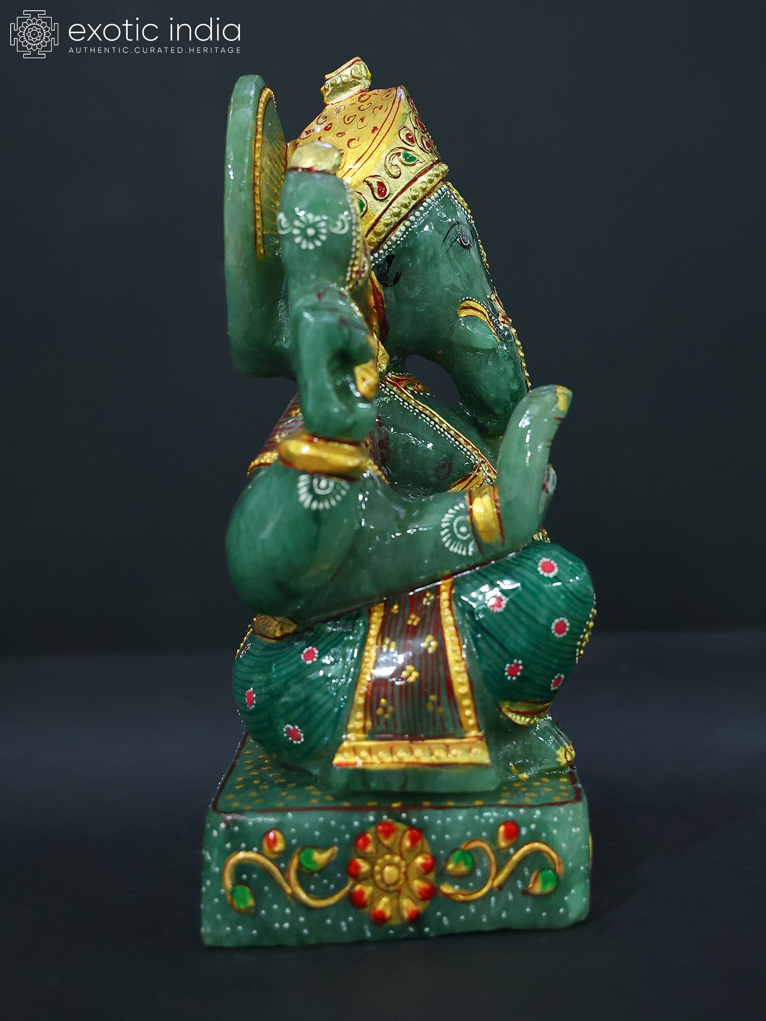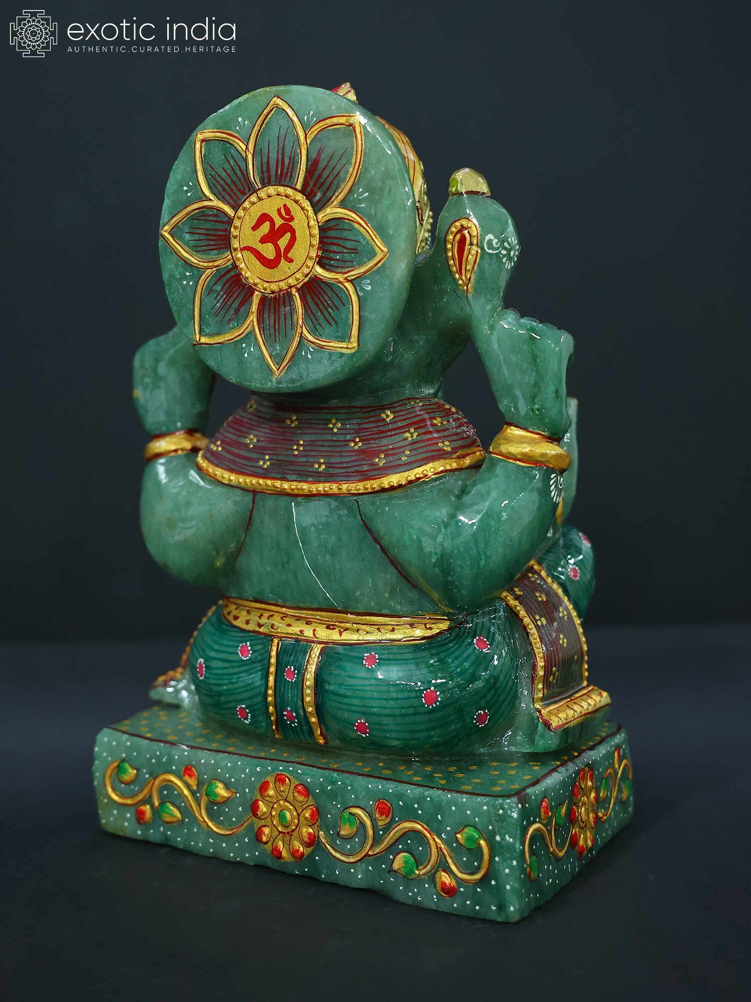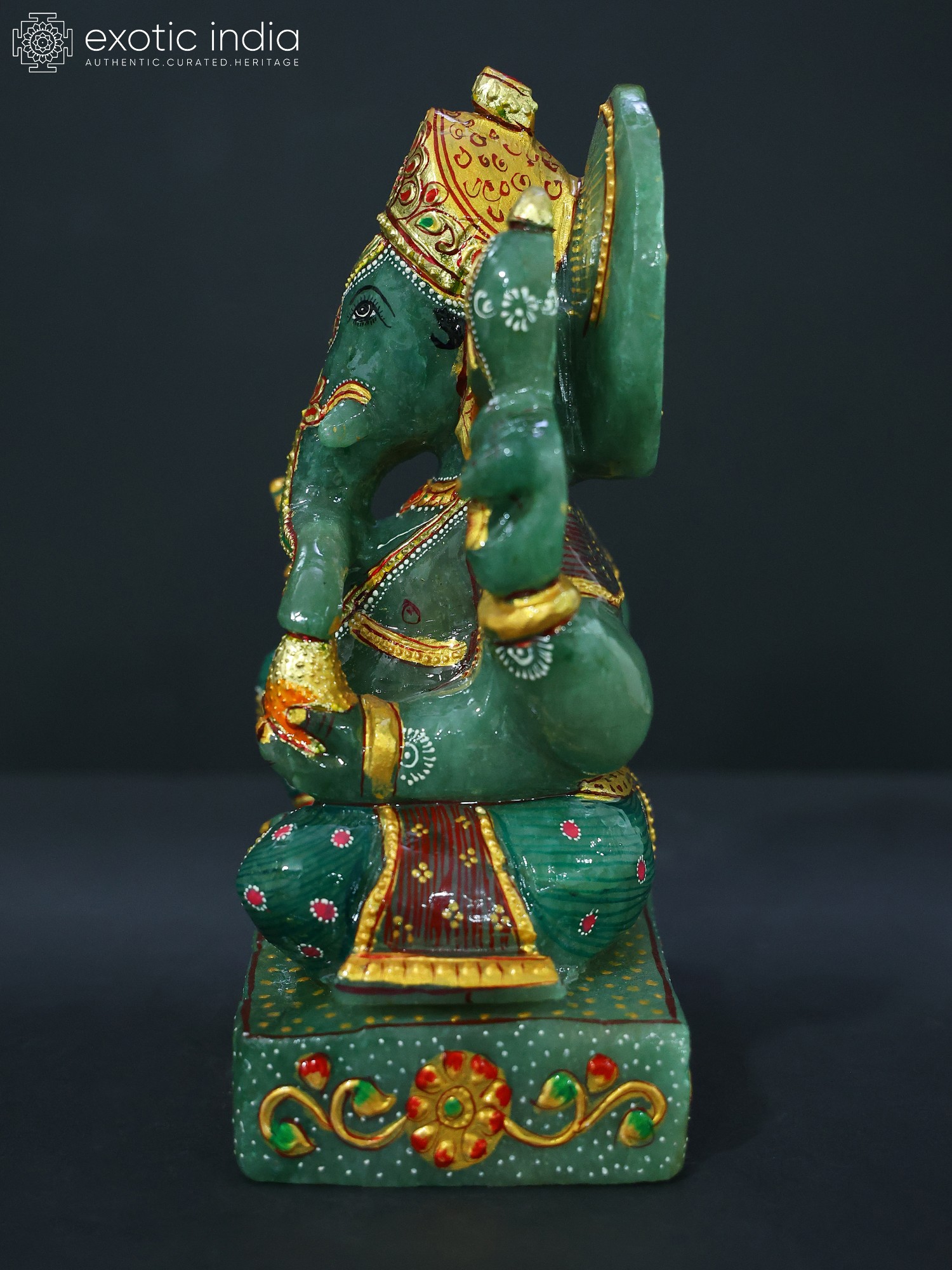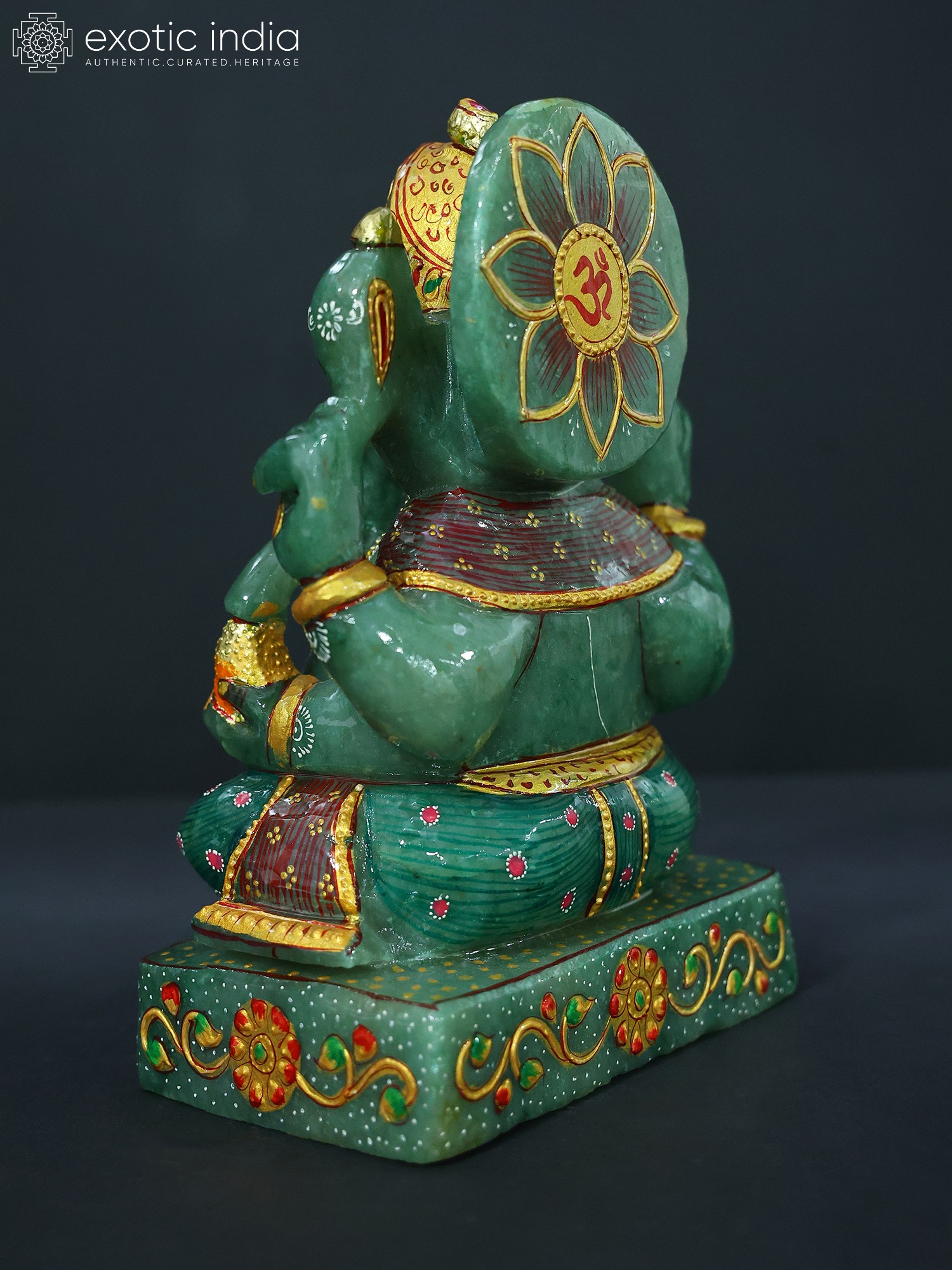This exquisite sculpture captures the divine presence of Lord Ganesha, the remover of obstacles and the god of beginnings, rendered in the radiant and calming hue of green aventurine. This precious stone, often associated with growth, prosperity, and good fortune, imbues the deity with a palpable aura of serenity and abundance. The rich, deep green of the gemstone, interspersed with subtle inclusions that hint at its natural beauty, forms a captivating backdrop for the meticulously detailed craftsmanship.