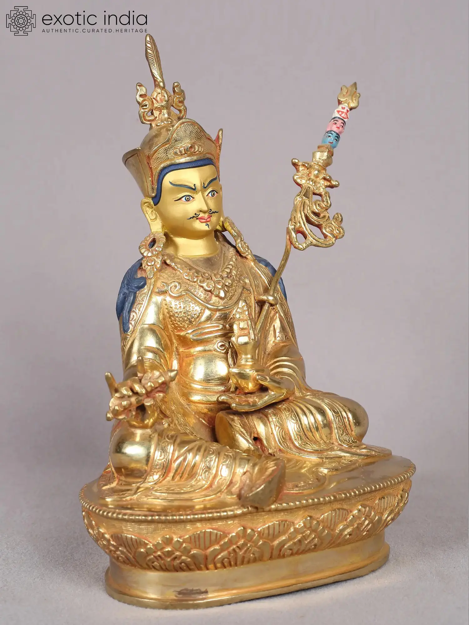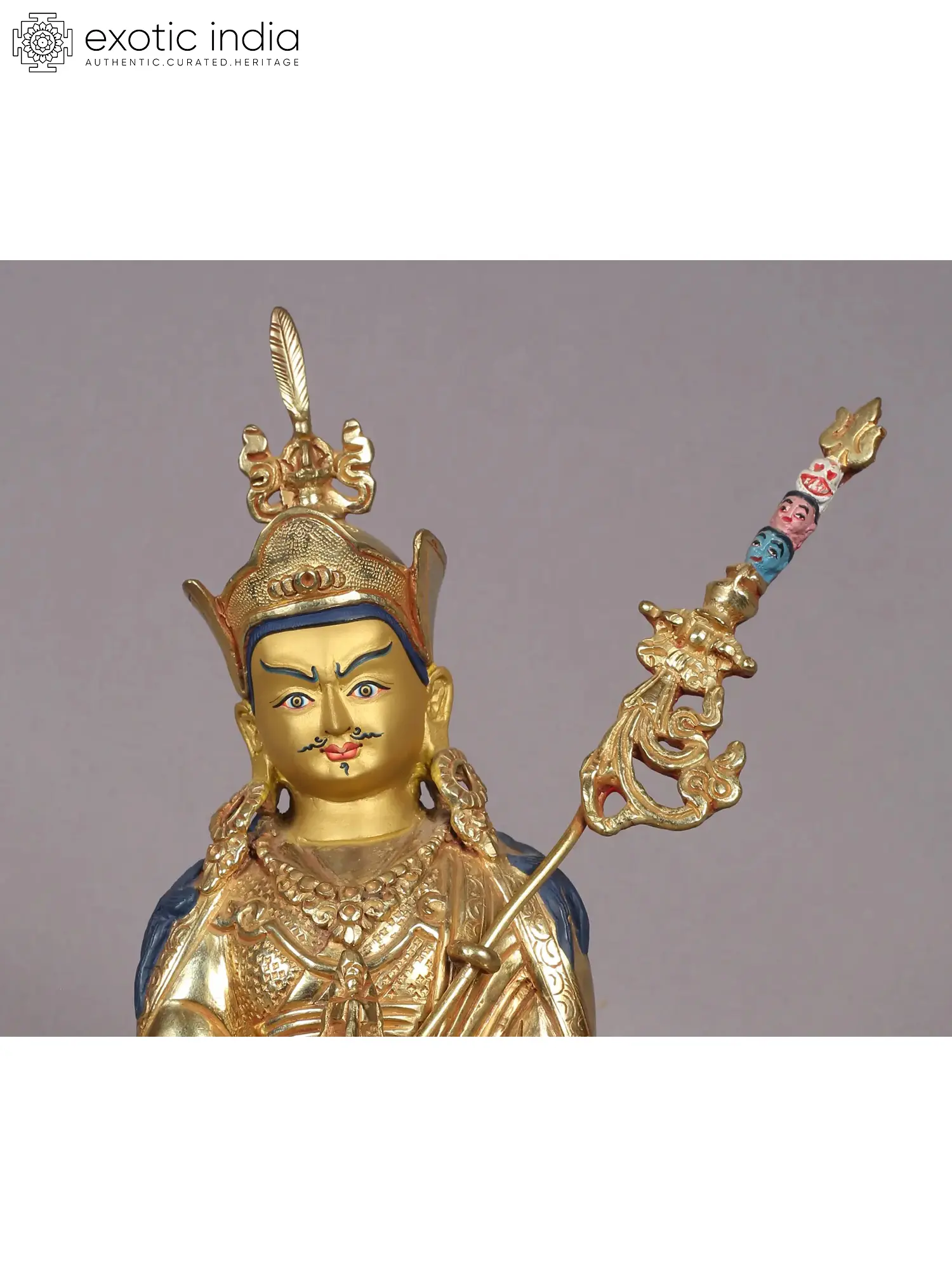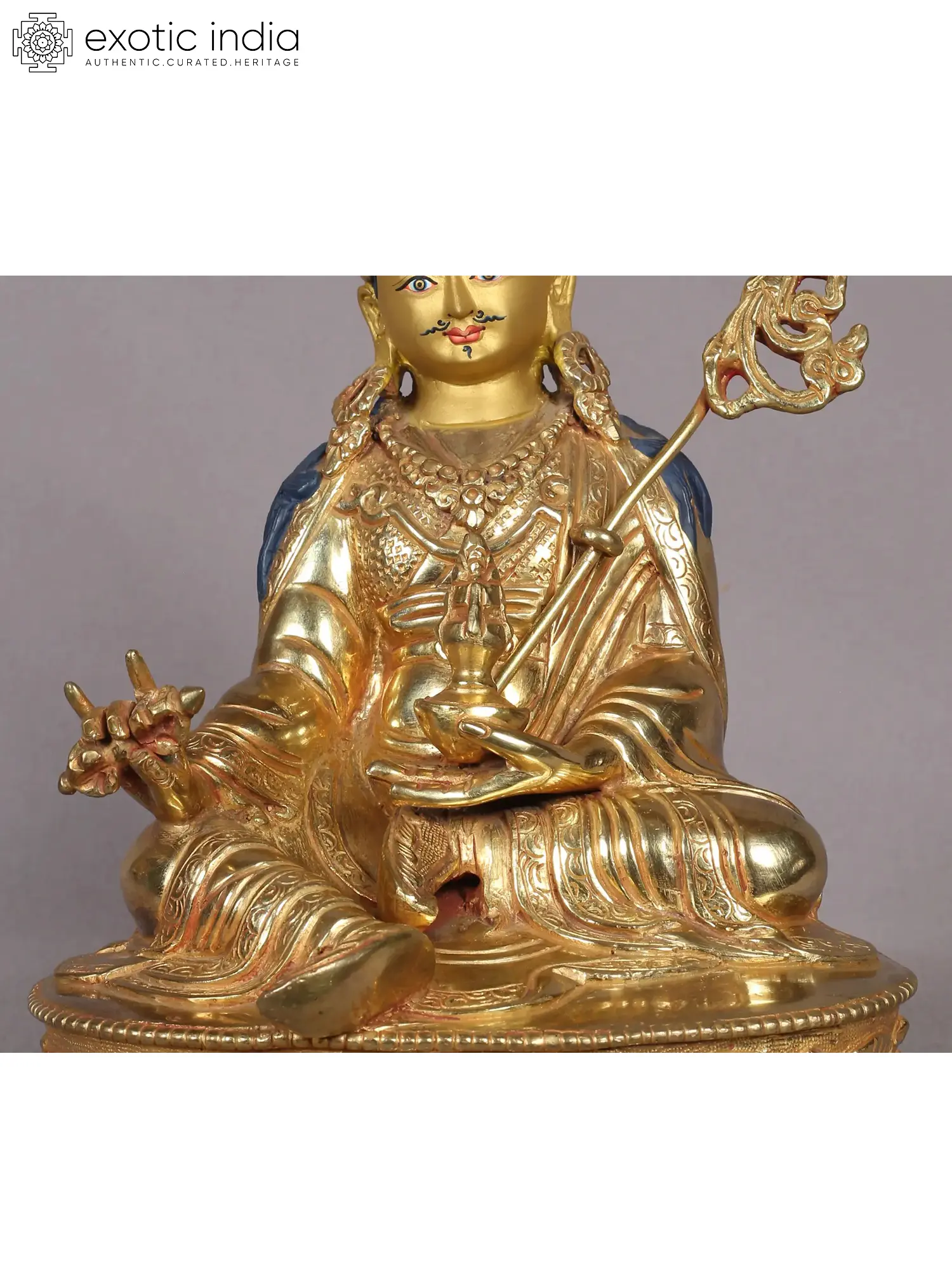 The portrait of Guru Rinpoche is characterized by his distinctive Mahasandhi gaze, with wide-open eyes that hold profound significance. His luxurious locks of hair often reveal the subtle reflection of the Bodhisattva figure. Guru Rinpoche is typically depicted in a seated position, with his legs crossed in the royal posture. His countenance conveys a sense of serenity and a warm smile. His blessings are bestowed with grandeur, and he radiates the splendor of both major and minor marks of enlightenment.