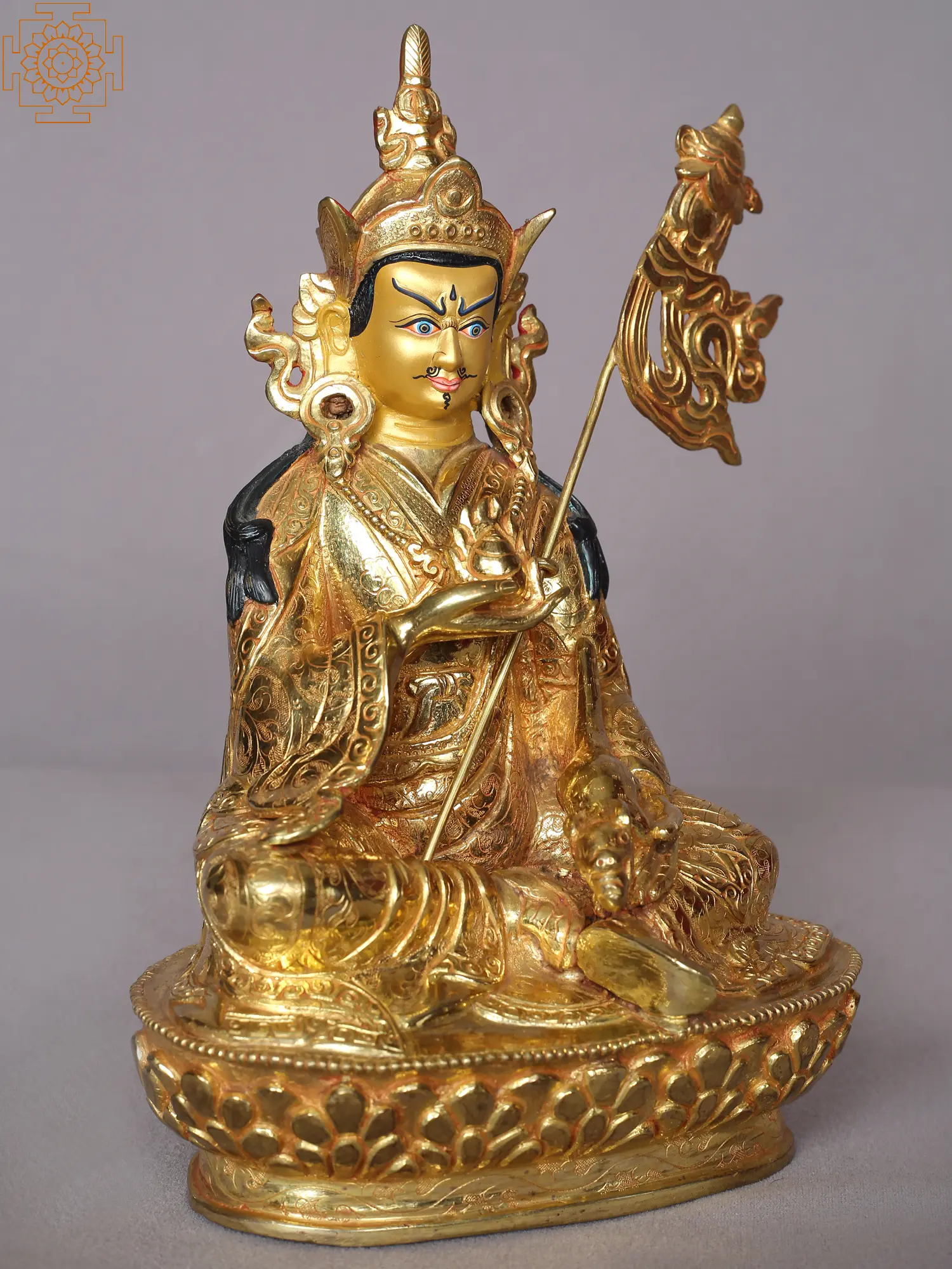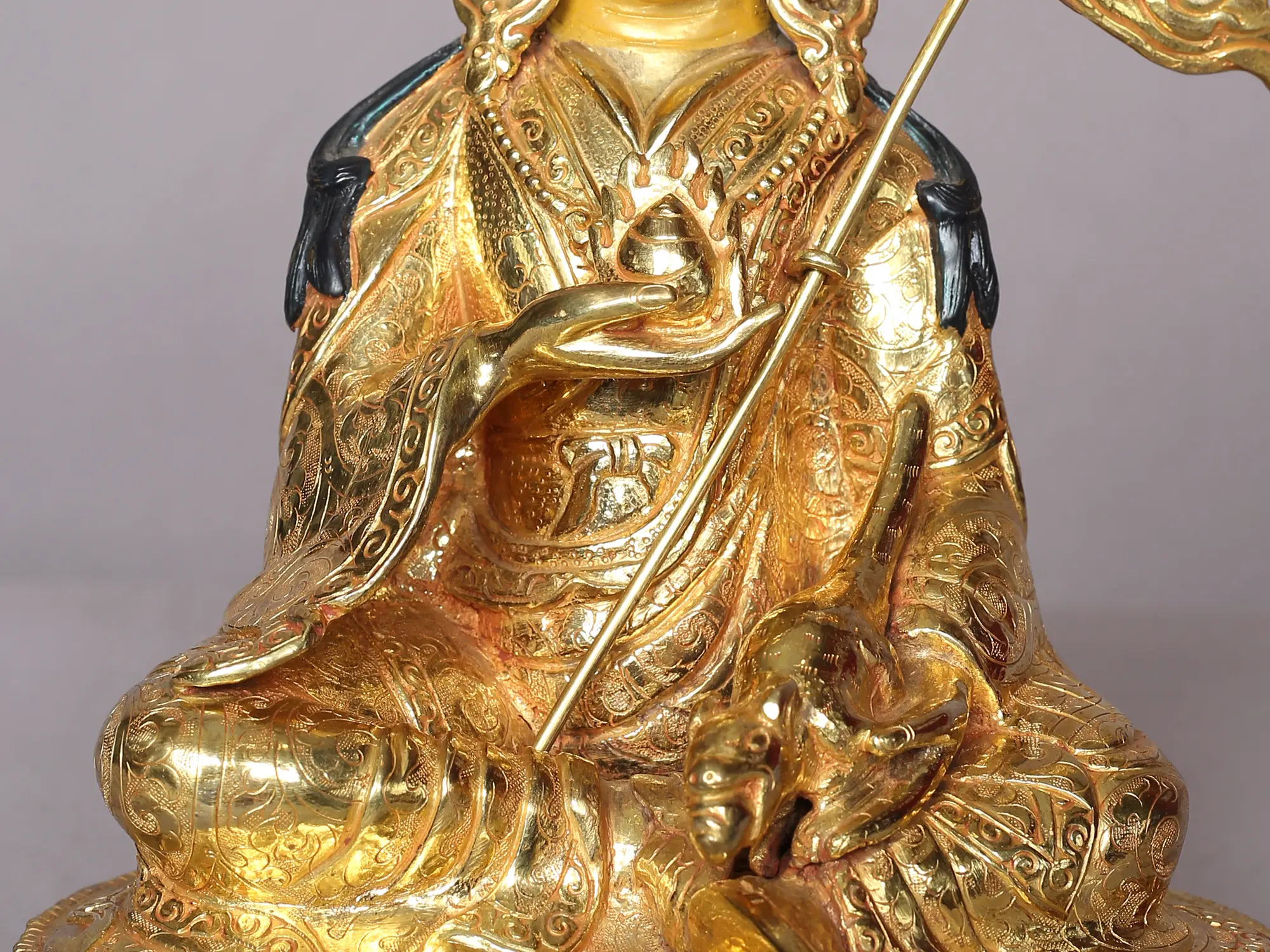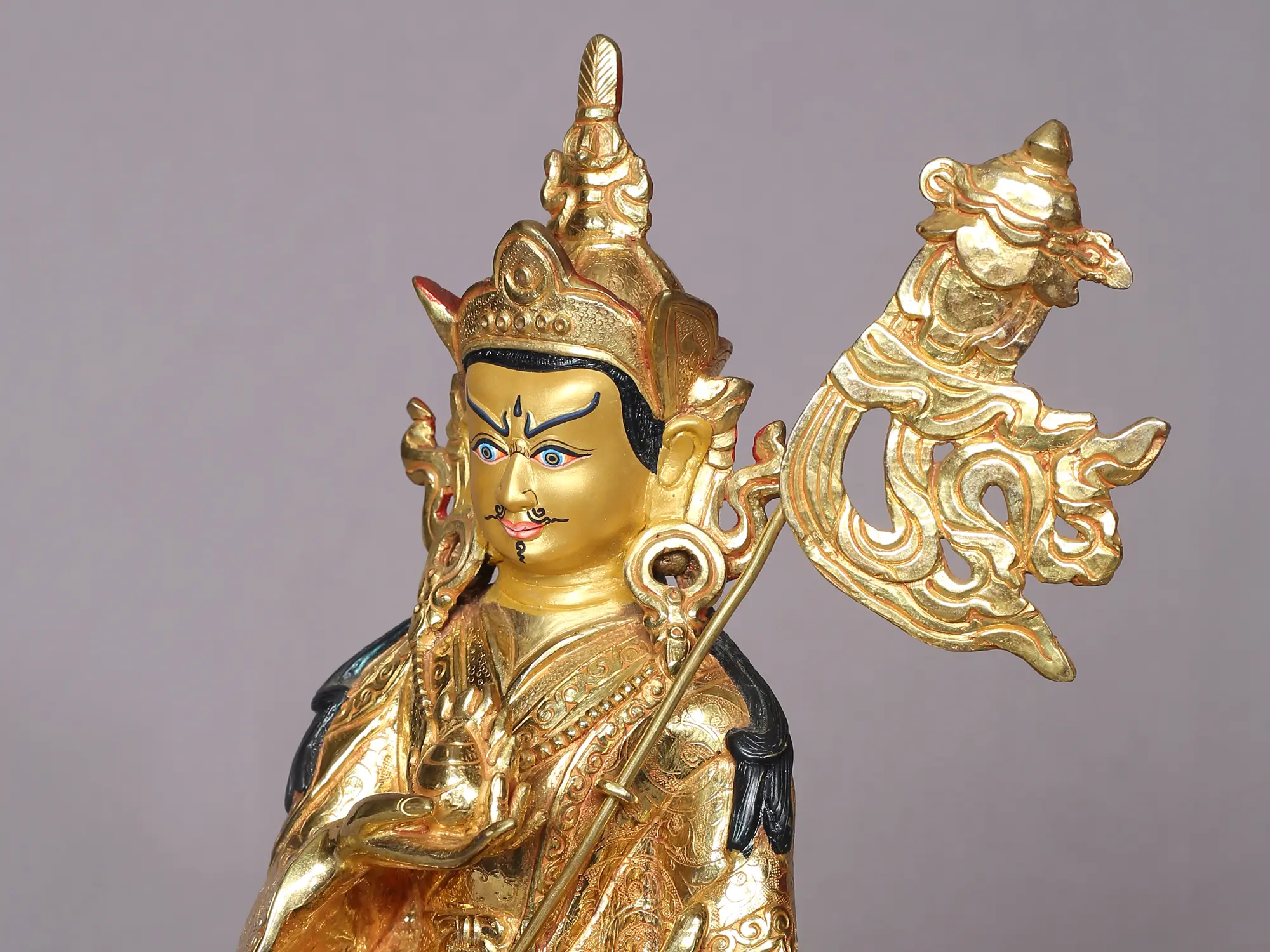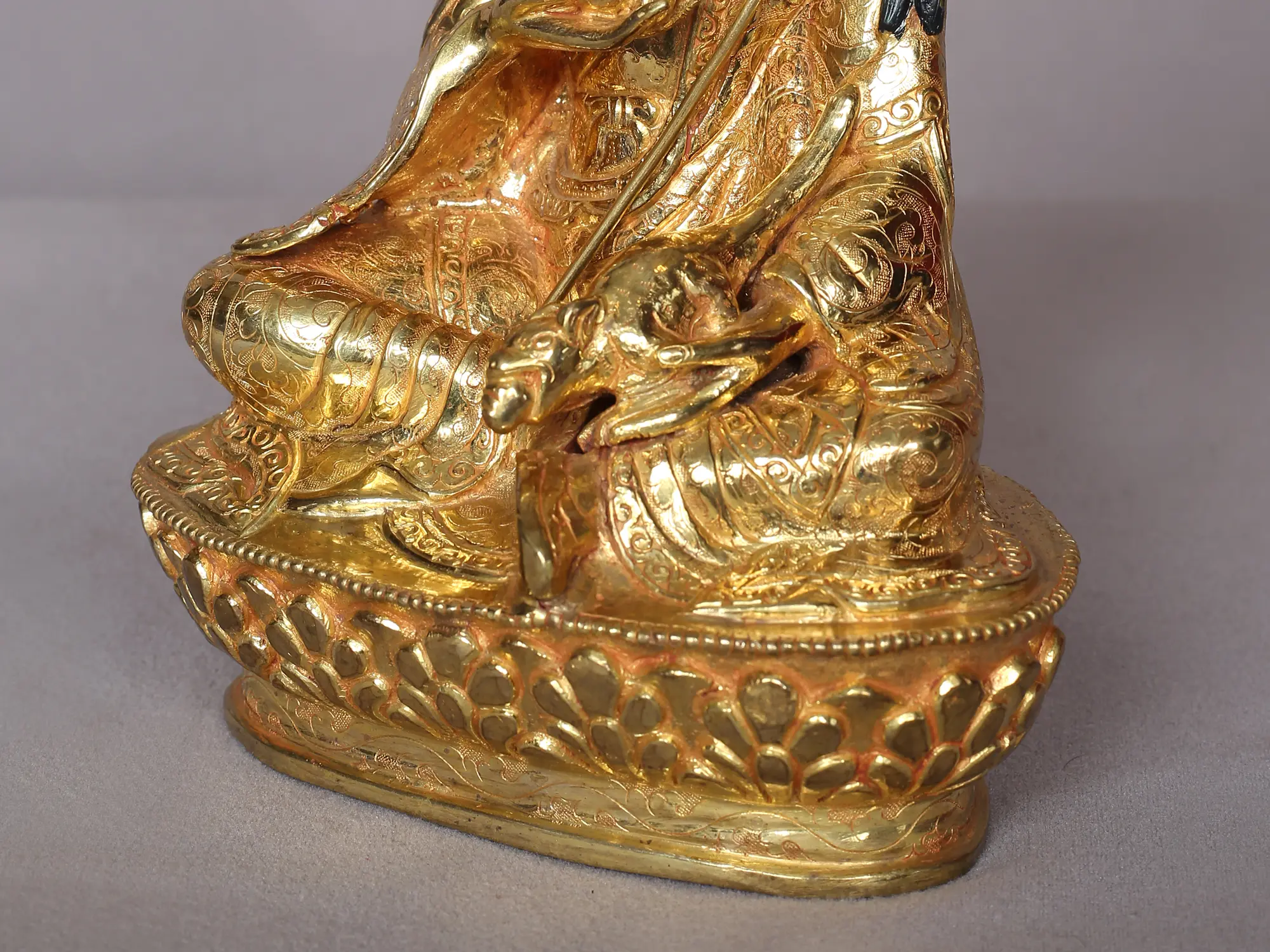 Guru Padmasambhava is depicted in this gilt copper Padmasambhava statue from Nepal wearing exquisite garb and holding the Chintamani (wish-fulfilling gem) and jewel-spitting mongoose as symbols of the wealth that he bestows onto his believers. Enthroned on an exquisitely layered lotus throne, which is a symbol of inner wisdom, this statue truly depicts the significance of Padmasambhava- he who emerged from a Padma (lotus), in a beautiful visual narration.
